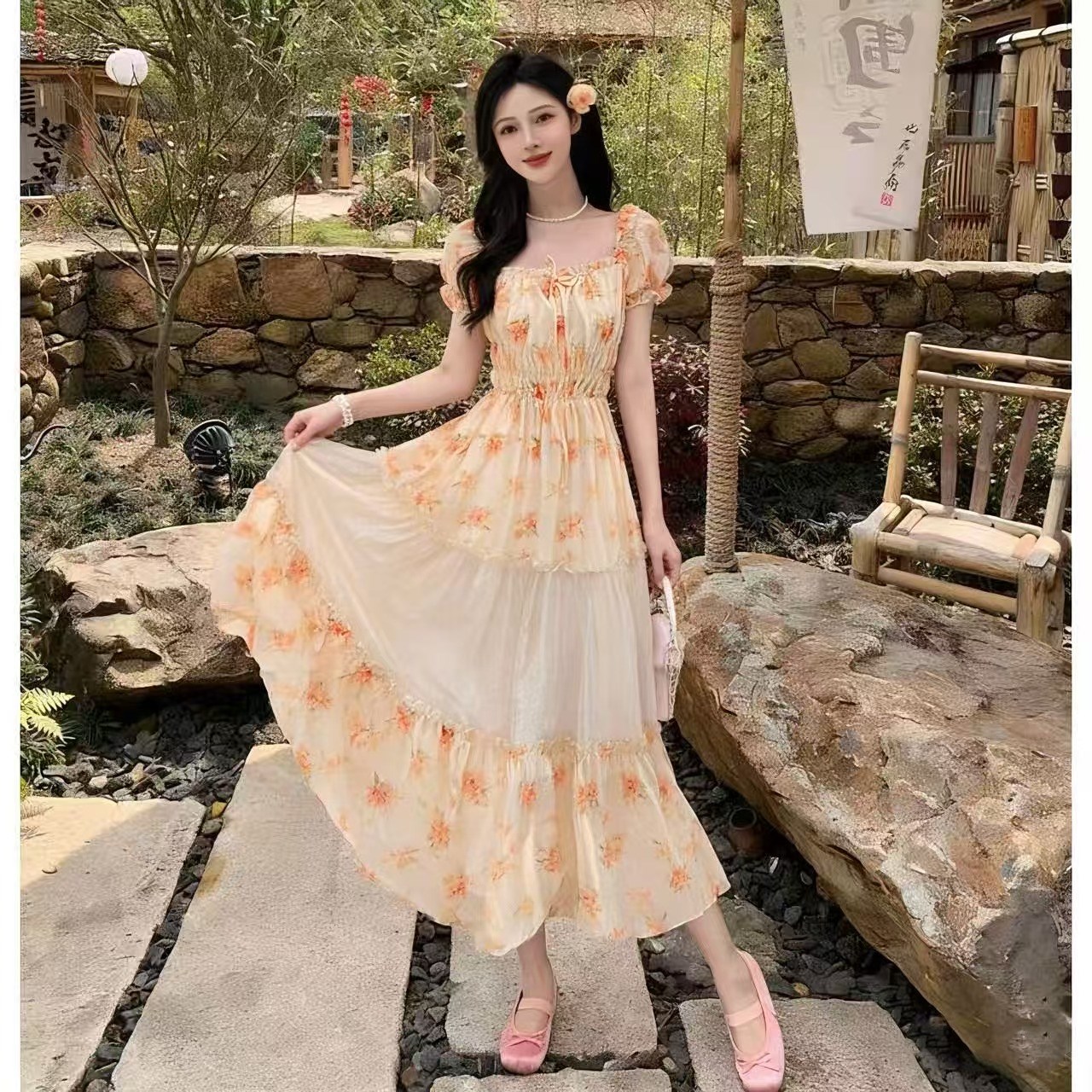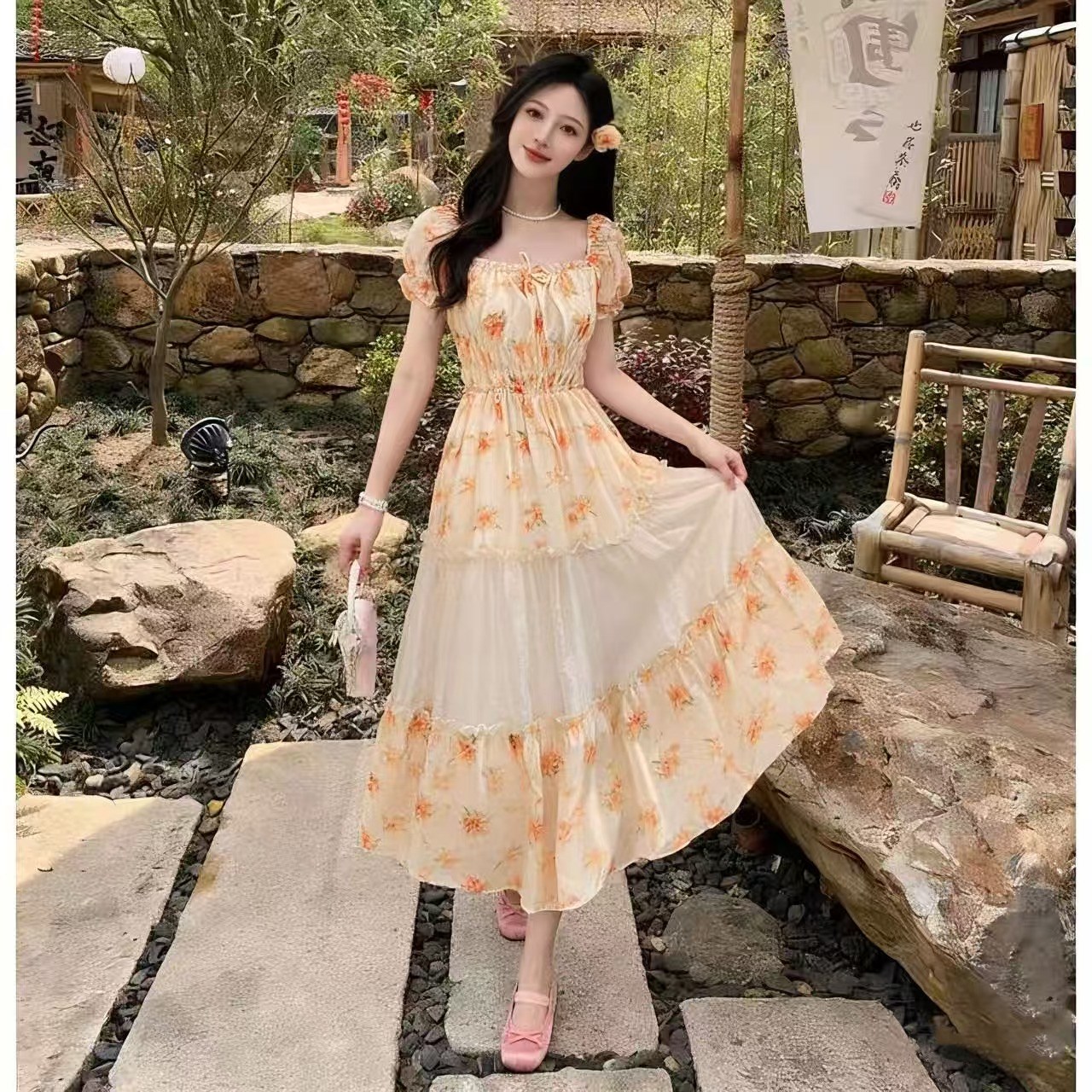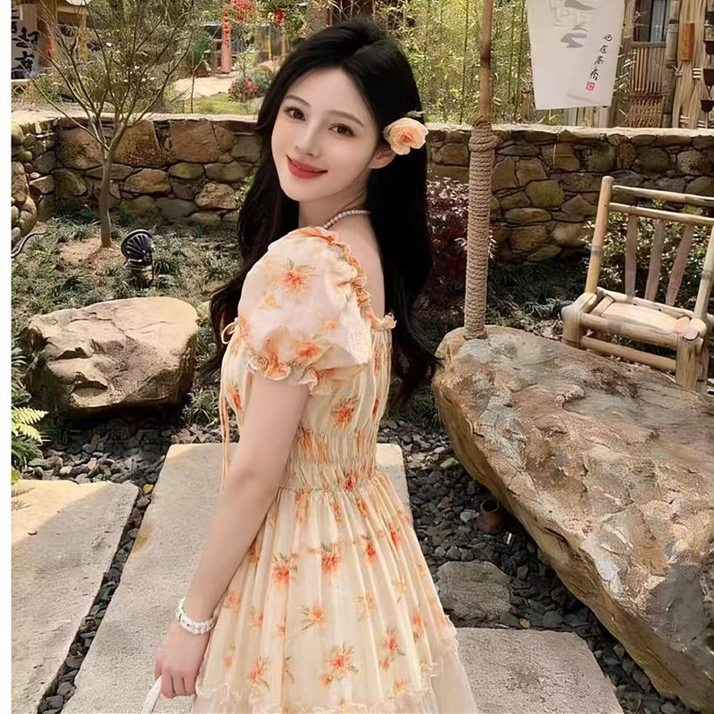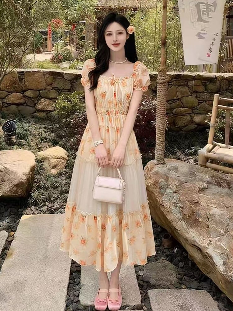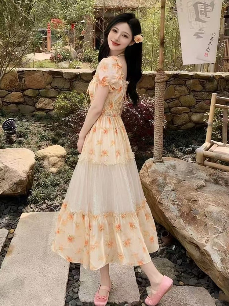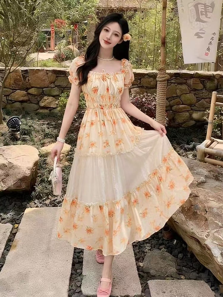 RY2079# 2026夏新款法式大码设计感向日葵拼接大摆度假长裙短袖甜美仙女裙