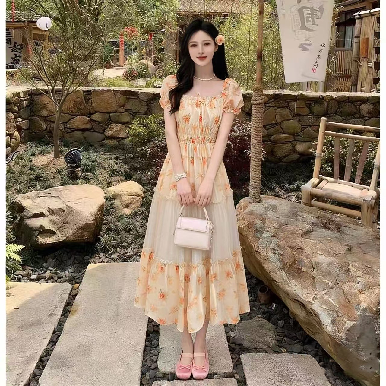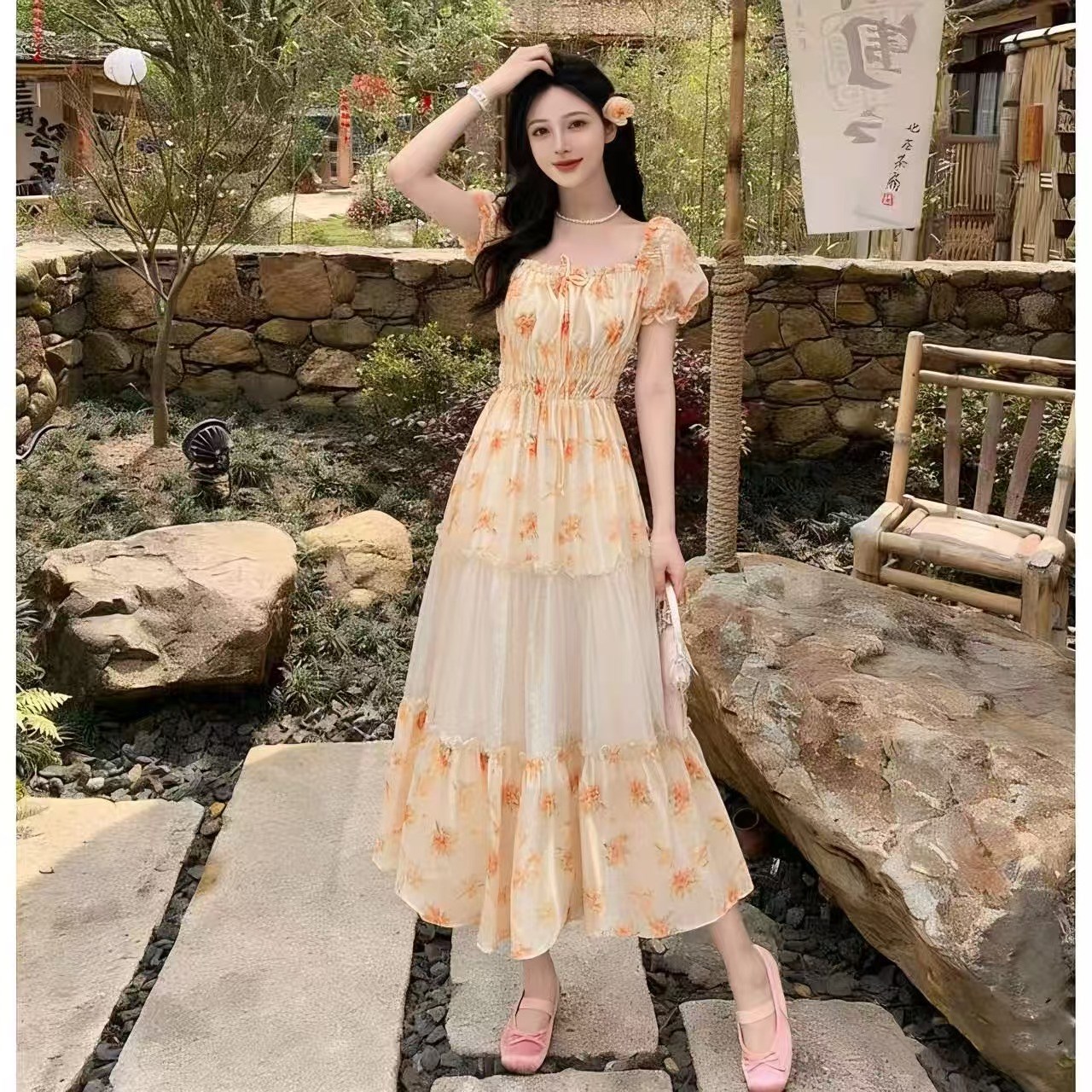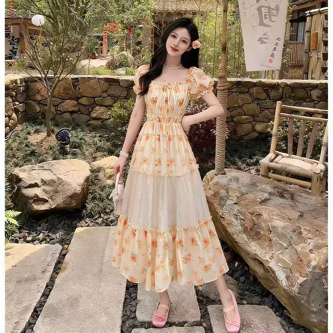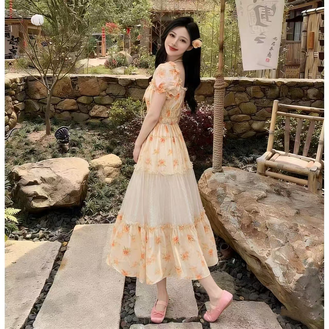 RY2079# 2026夏新款法式大码设计感向日葵拼接大摆度假长裙短袖甜美仙女裙