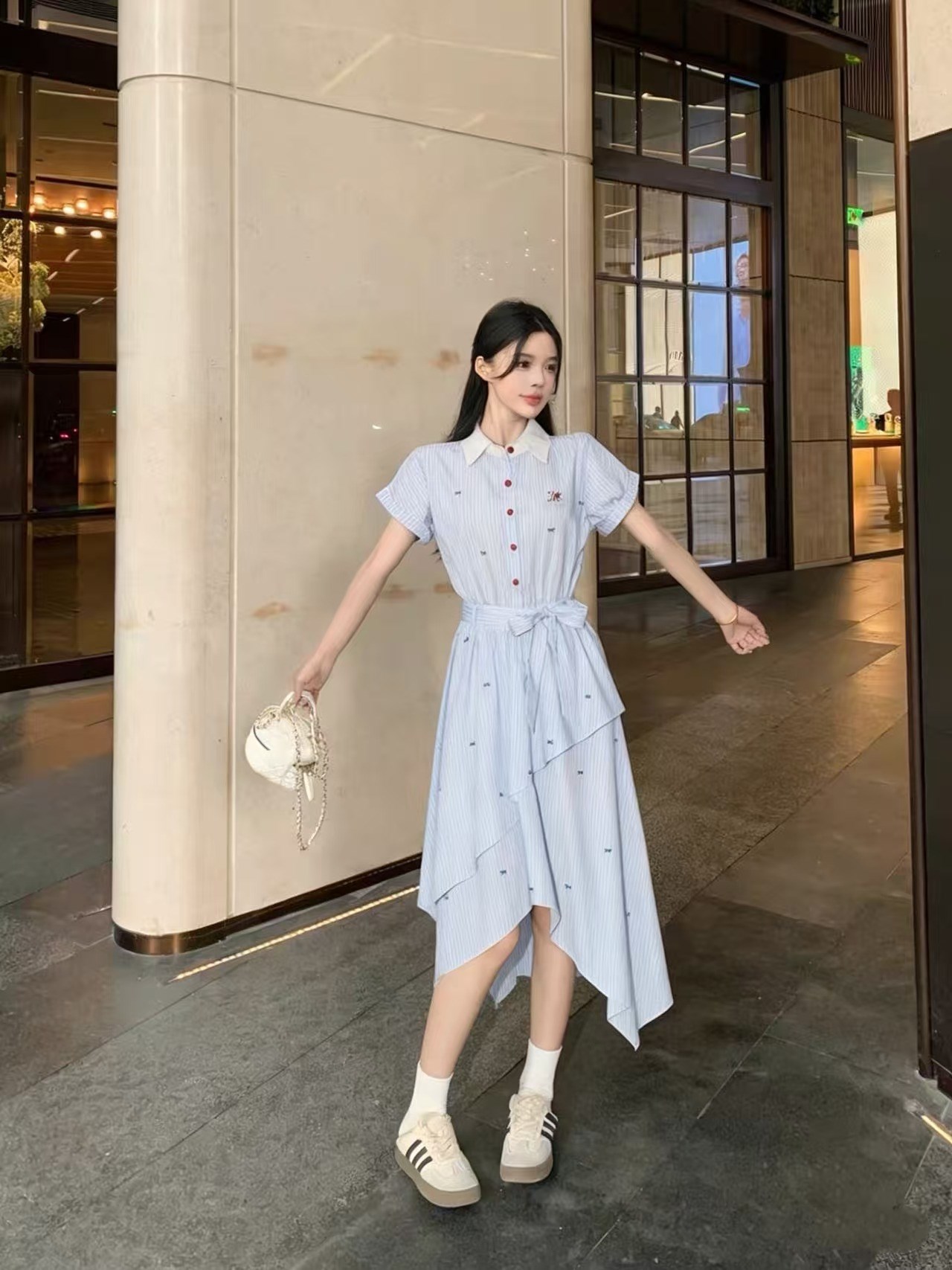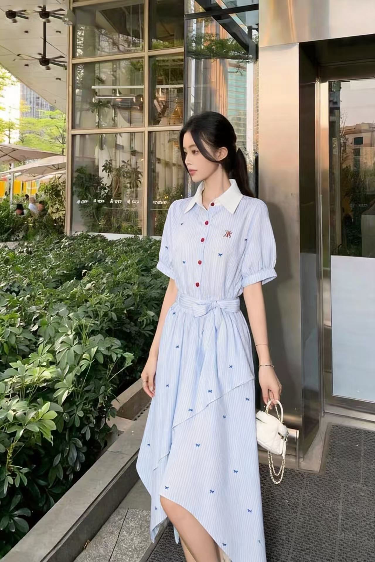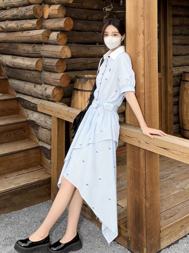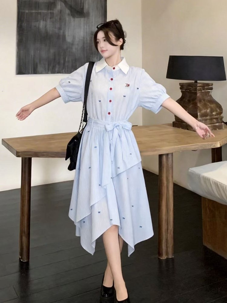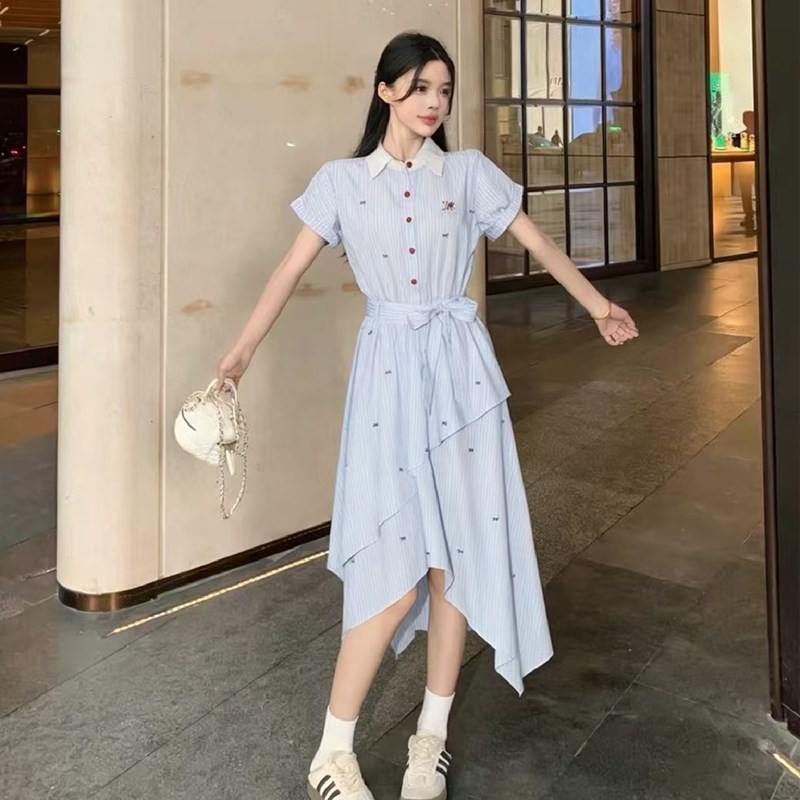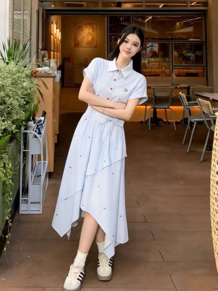 RY2082# 学院风条纹翻领衬衫连衣裙女2026夏季新款设计感不规则下摆裙子
