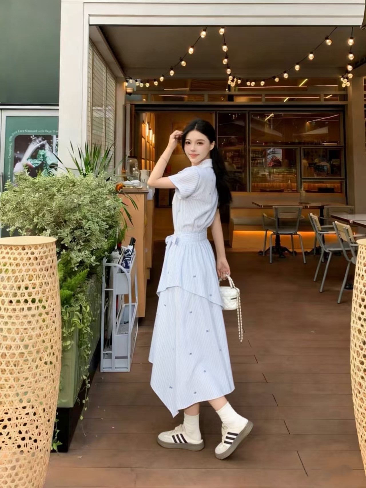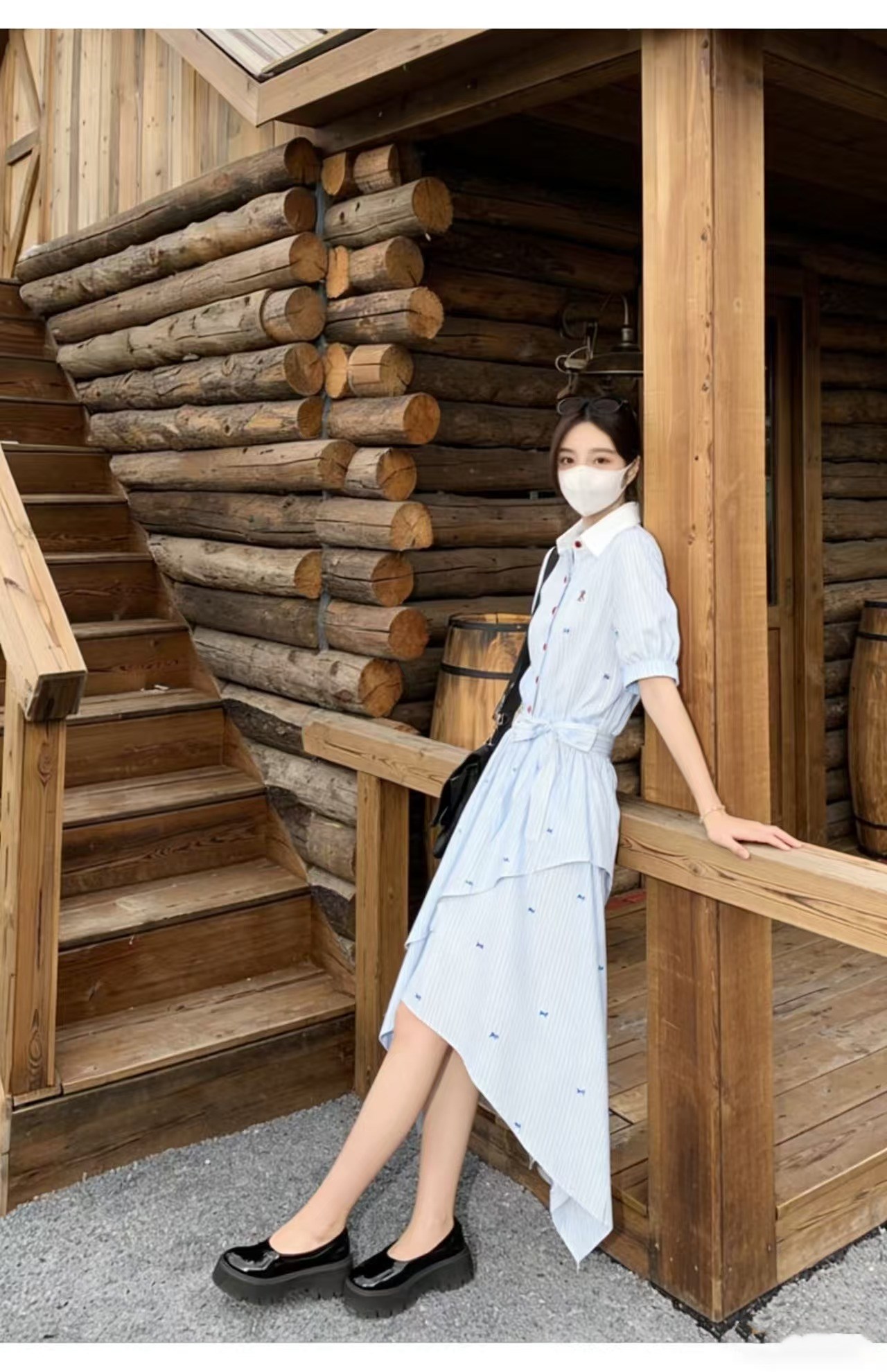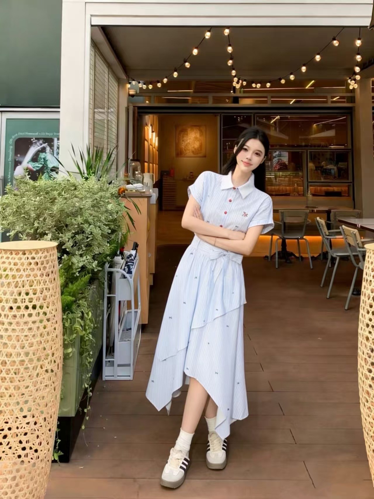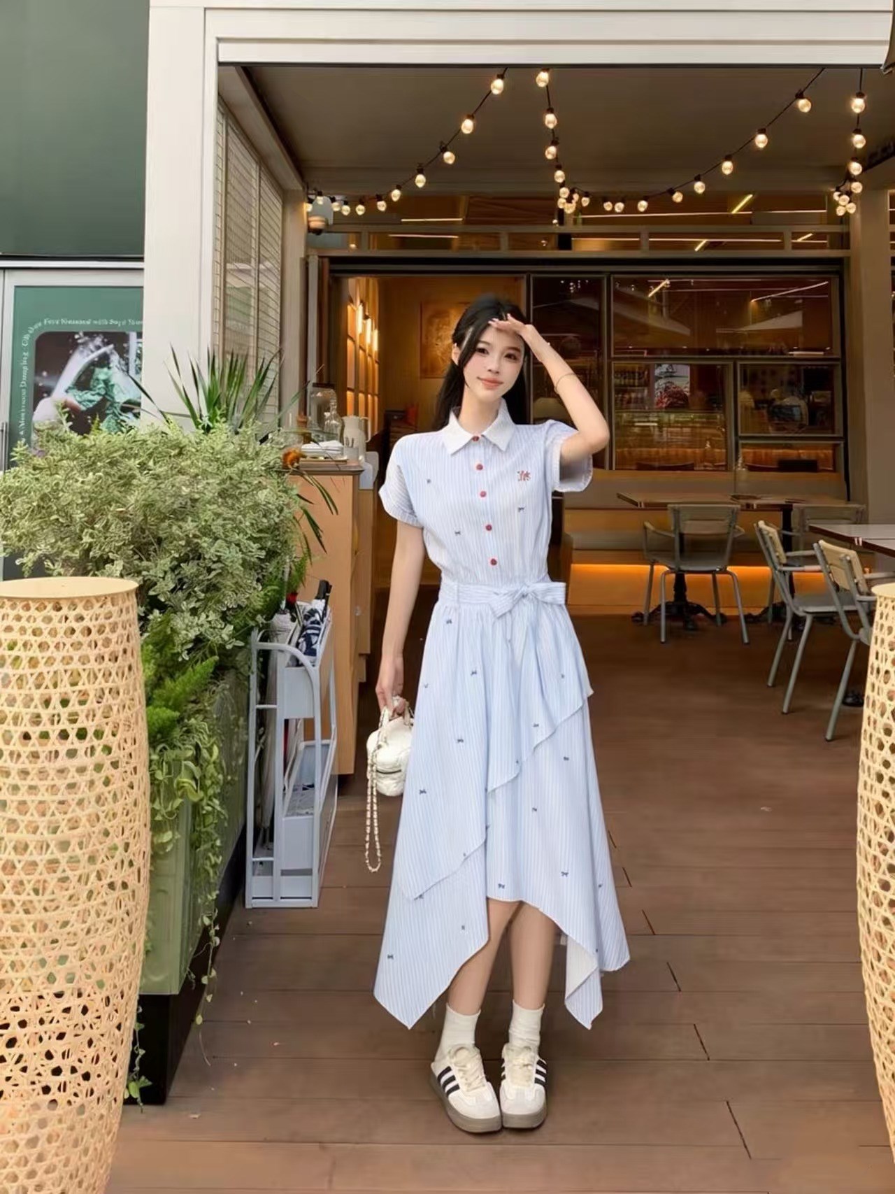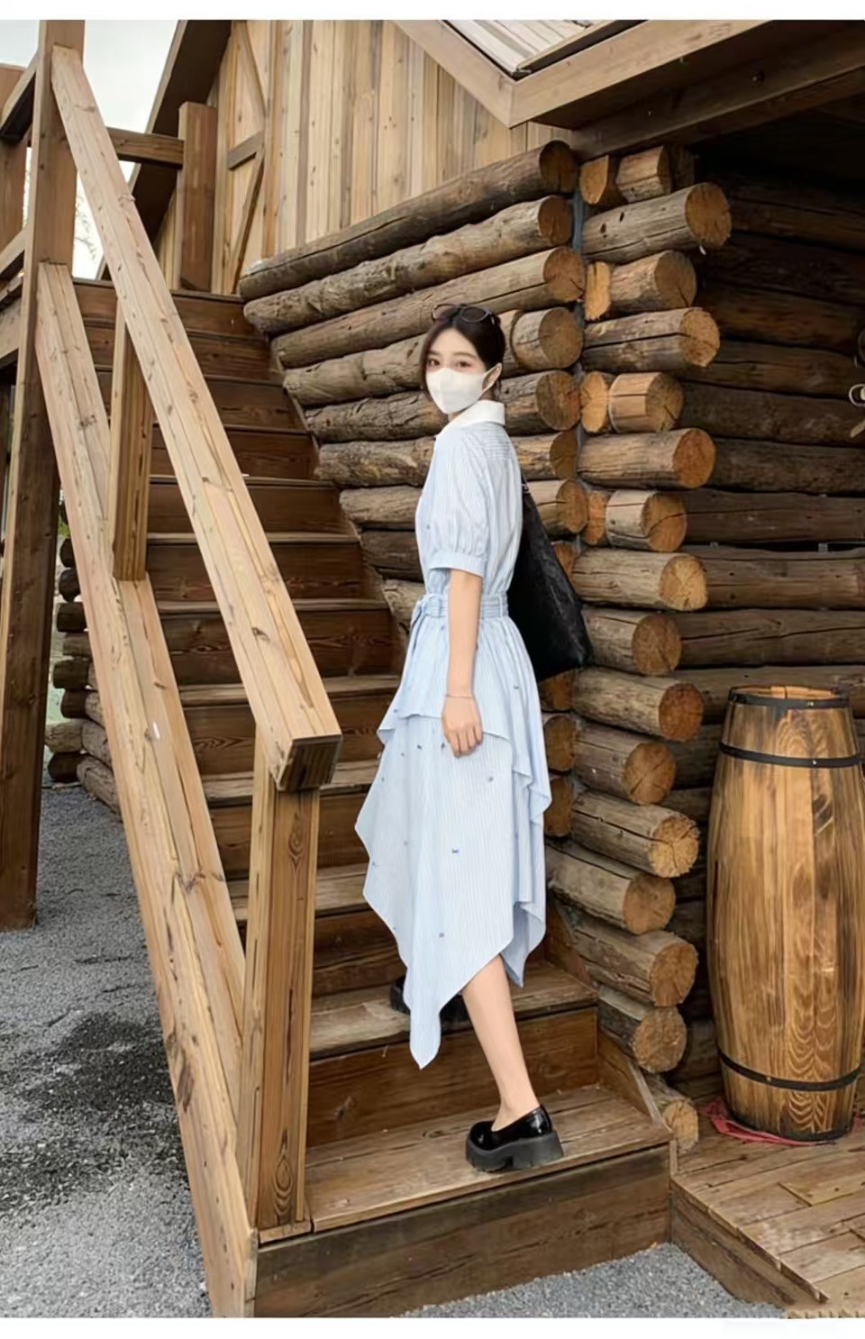 RY2082# 学院风条纹翻领衬衫连衣裙女2026夏季新款设计感不规则下摆裙子