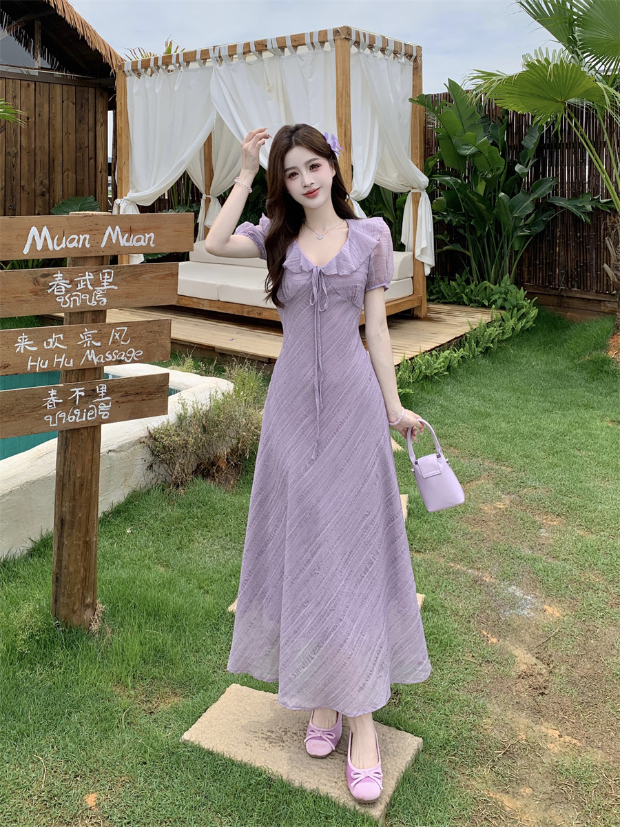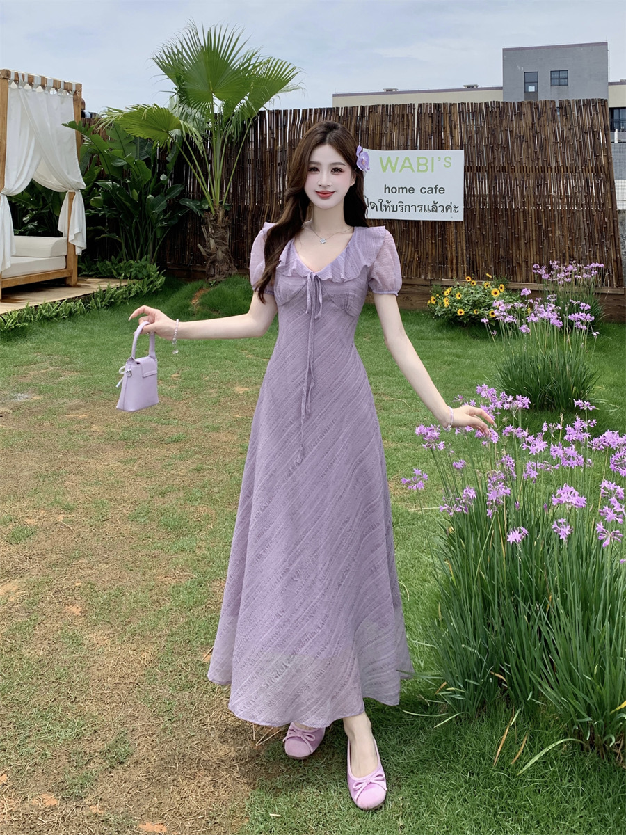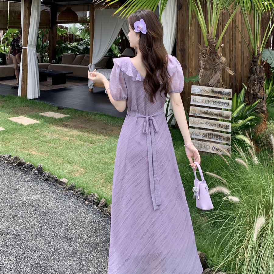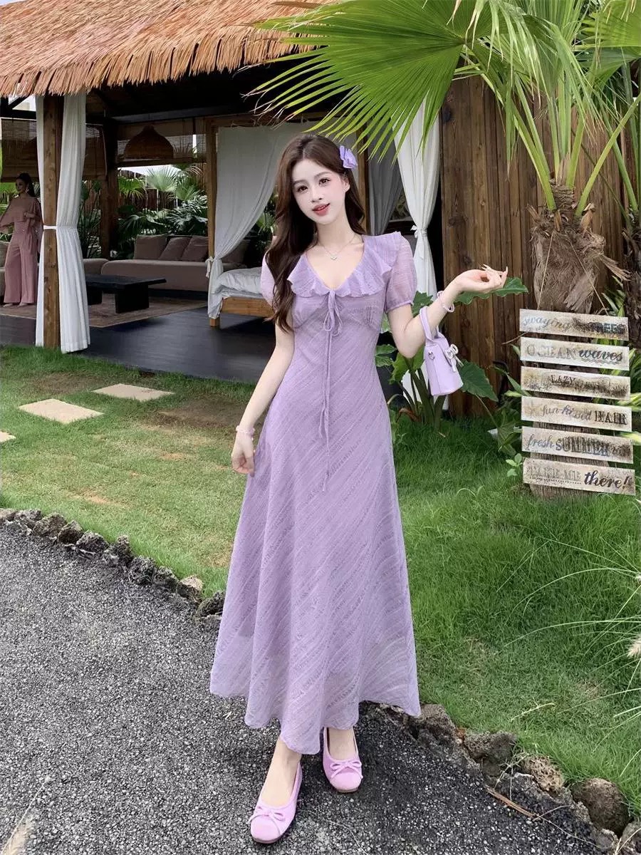 RY2088# 夏季温柔荷叶边V领泡泡袖连衣裙大码胖mm气质系带收腰肌理感长裙