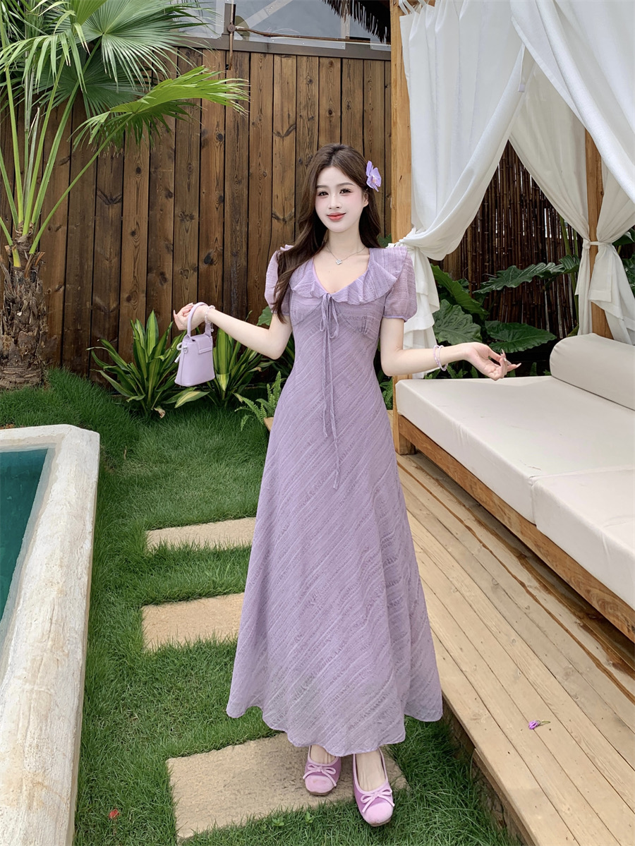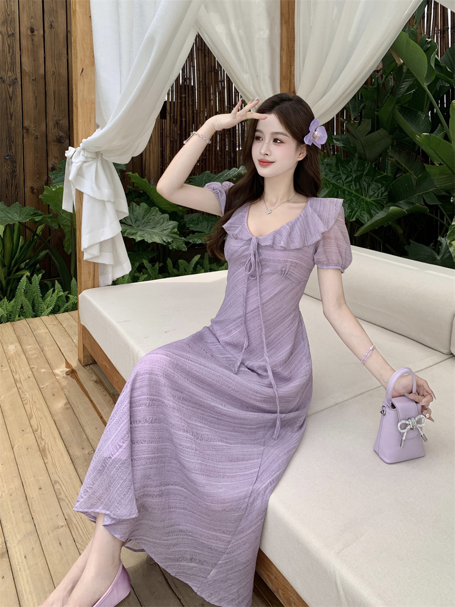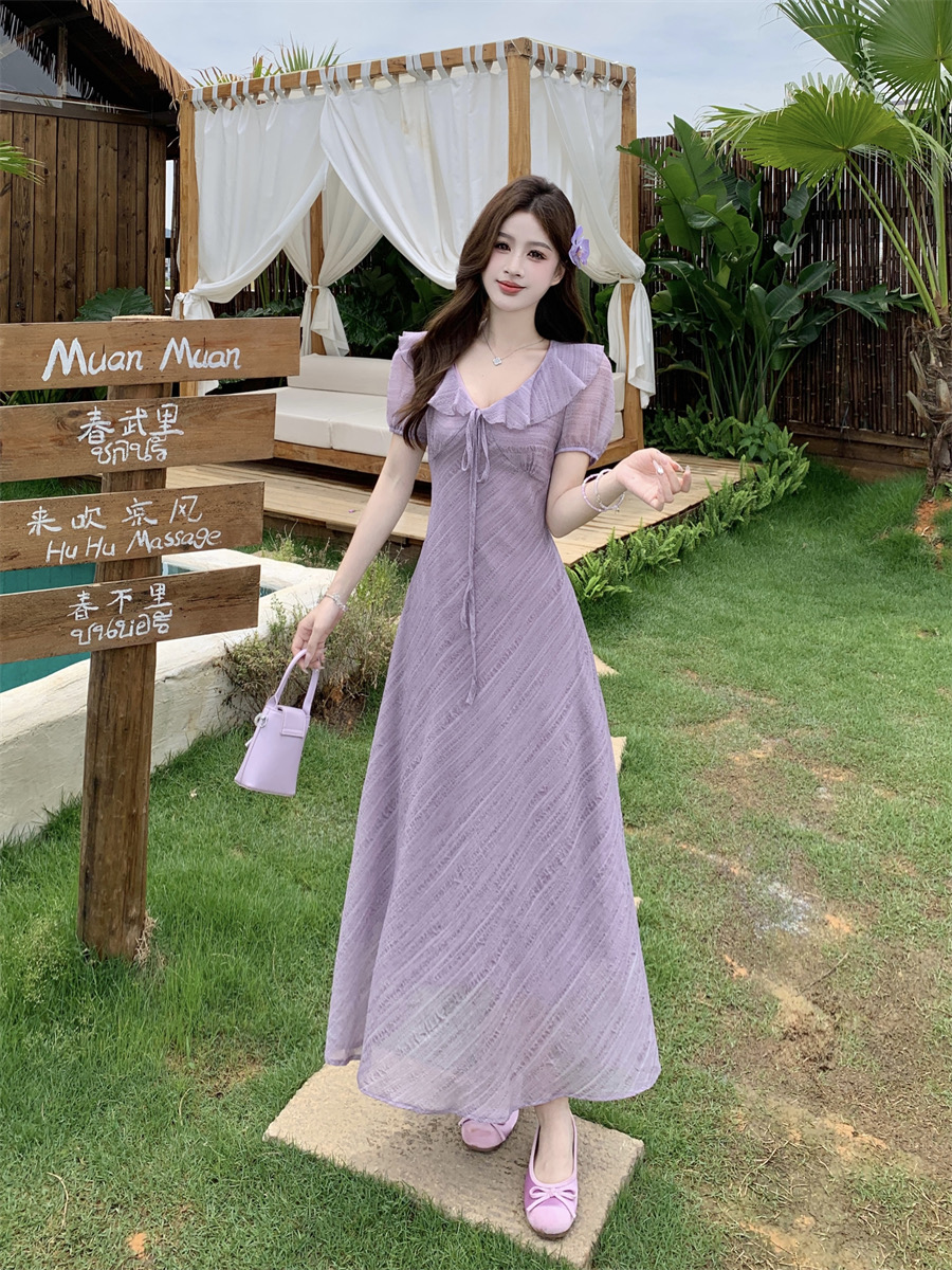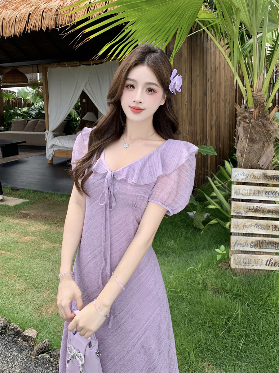 RY2088# 夏季温柔荷叶边V领泡泡袖连衣裙大码胖mm气质系带收腰肌理感长裙