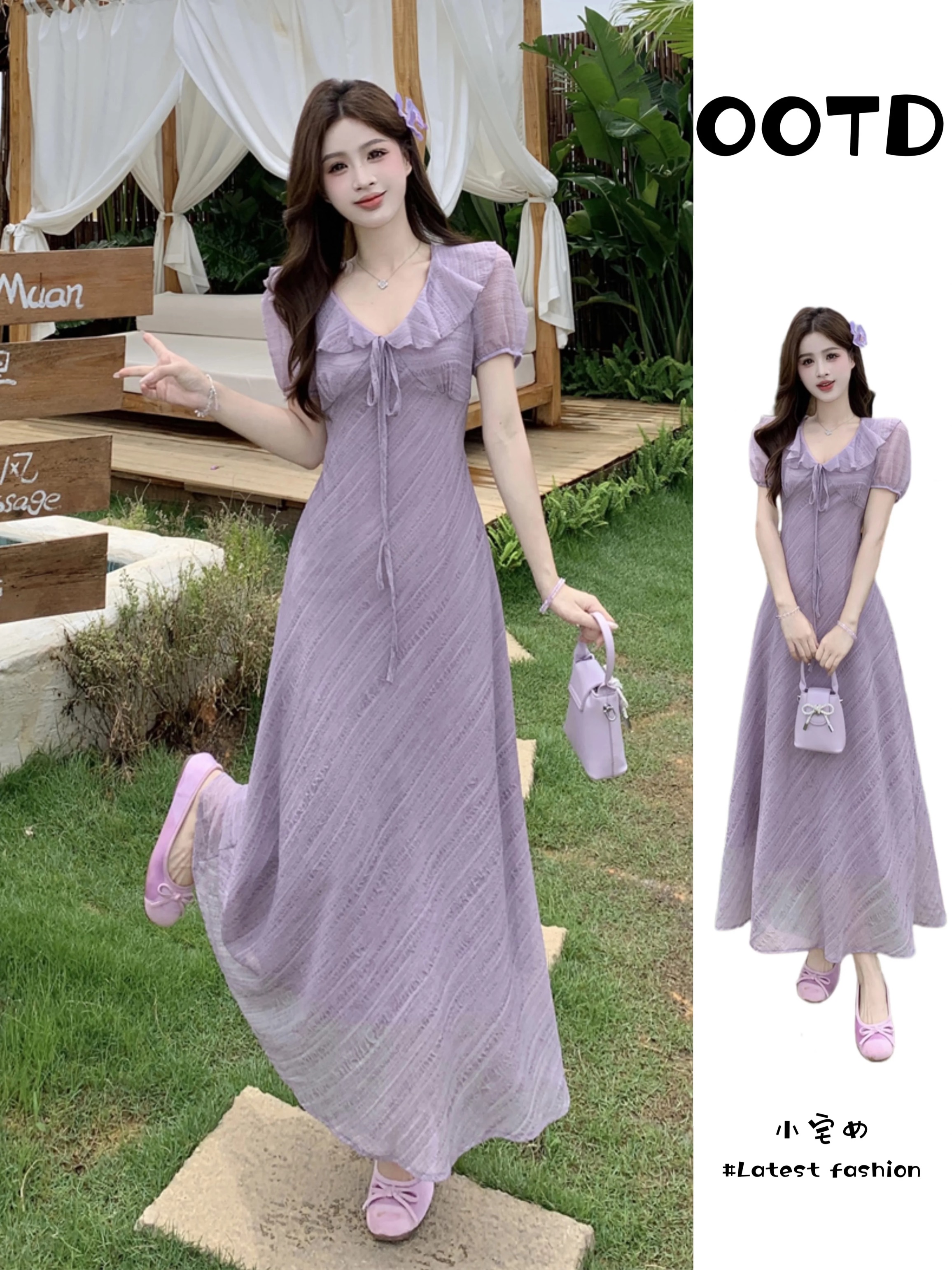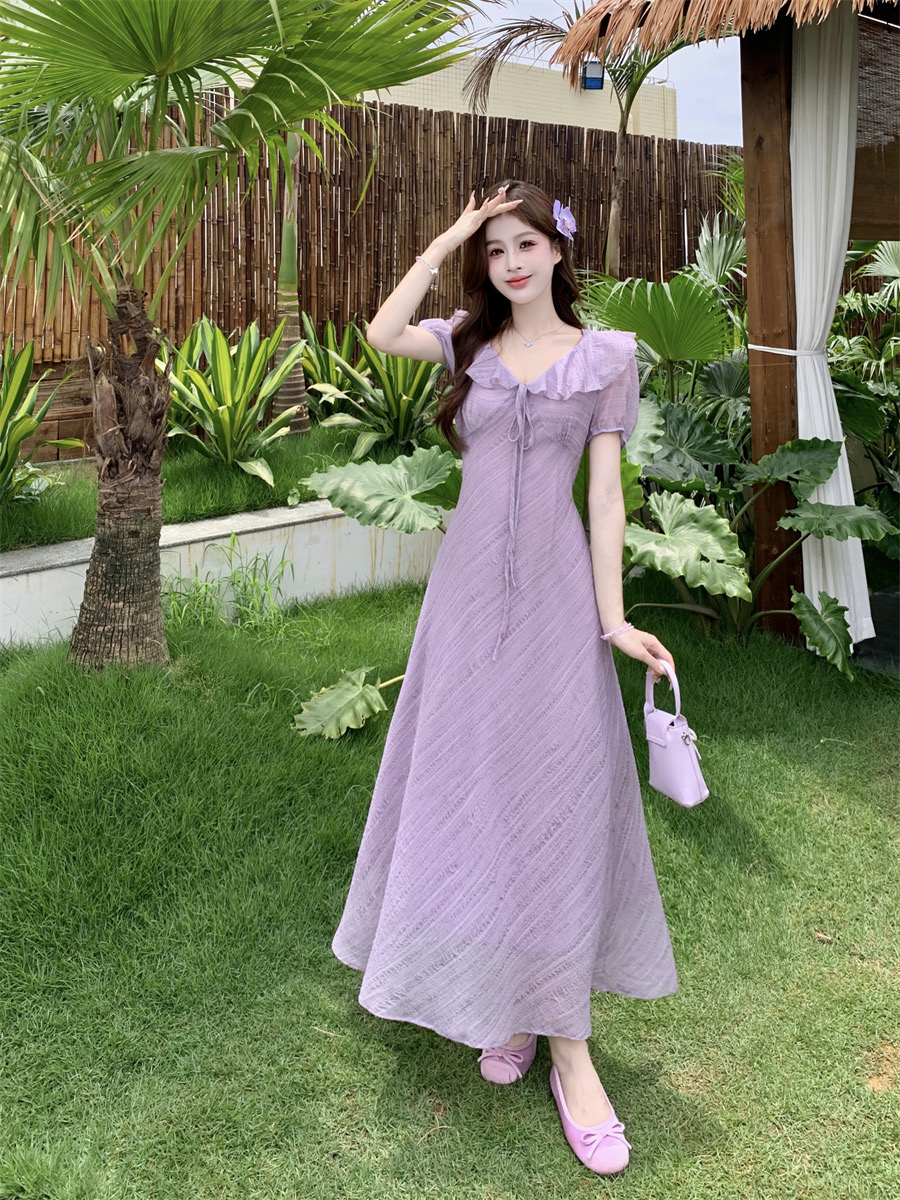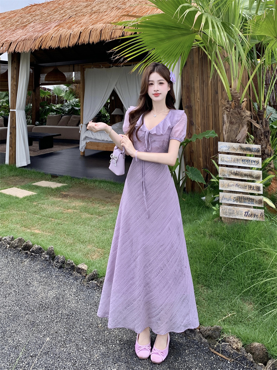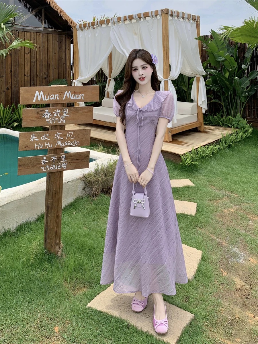 RY2088# 夏季温柔荷叶边V领泡泡袖连衣裙大码胖mm气质系带收腰肌理感长裙