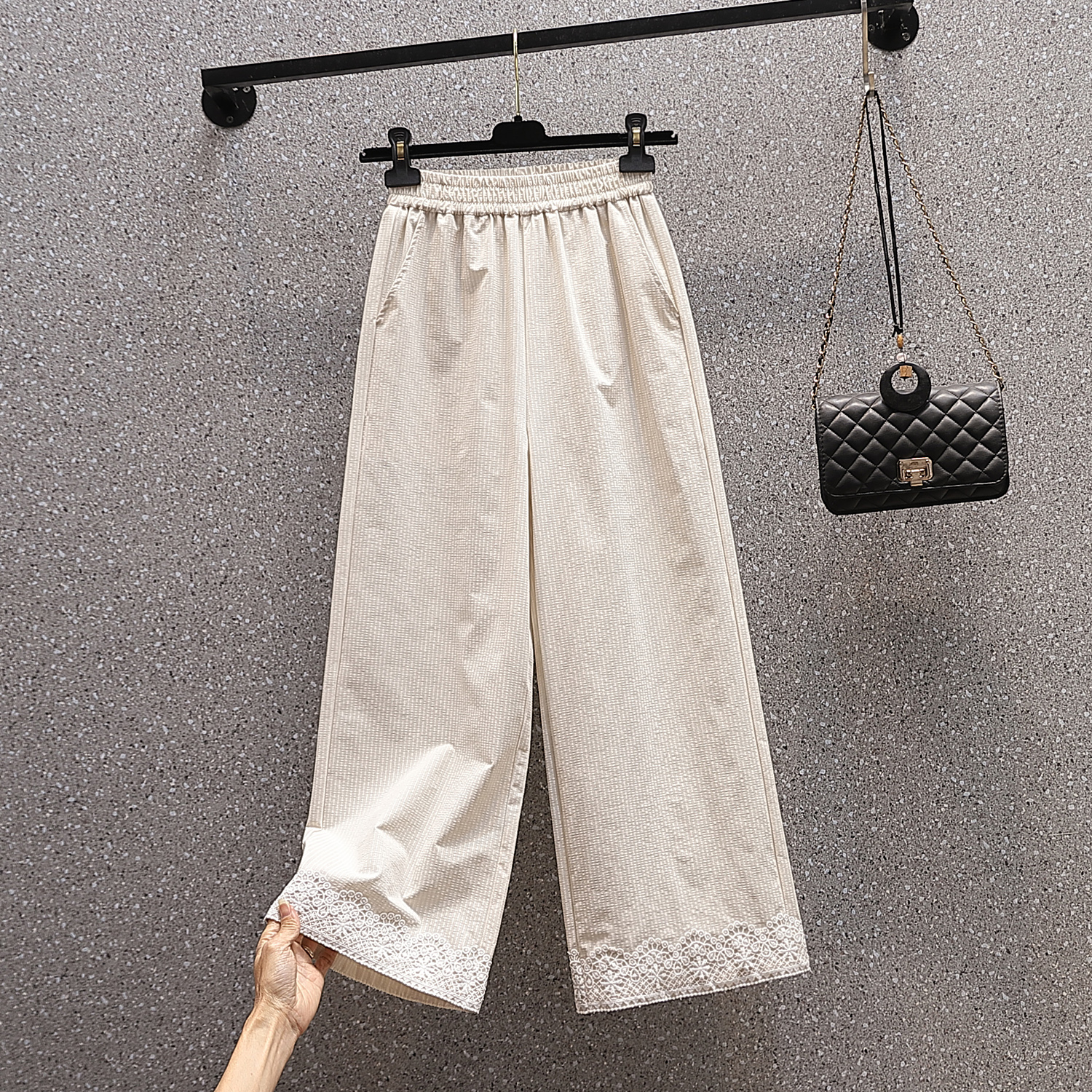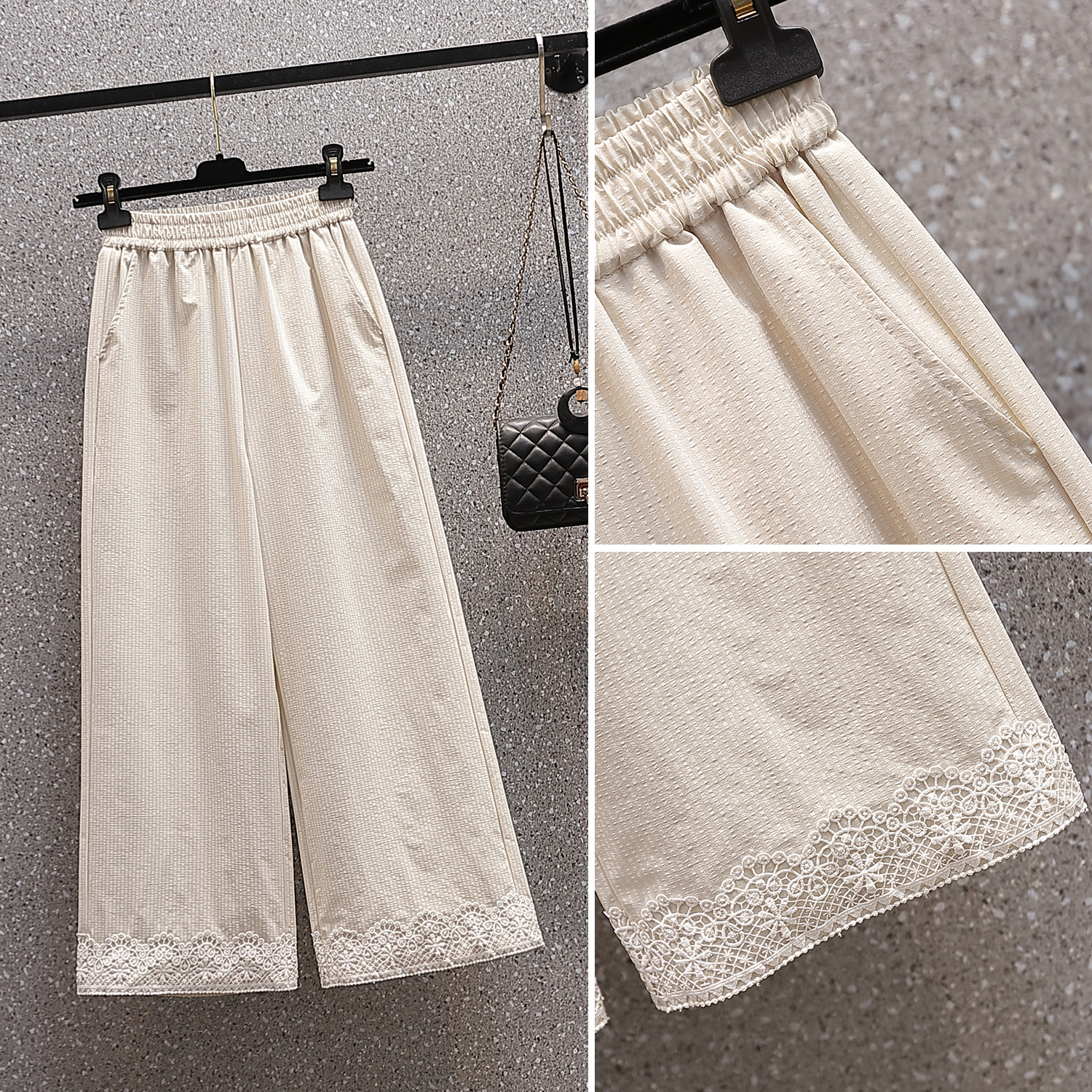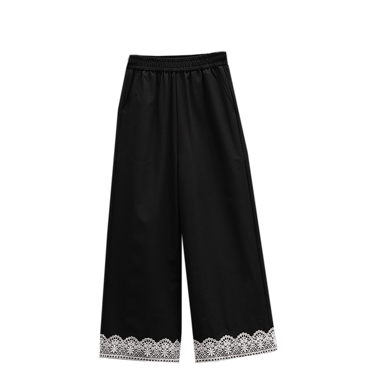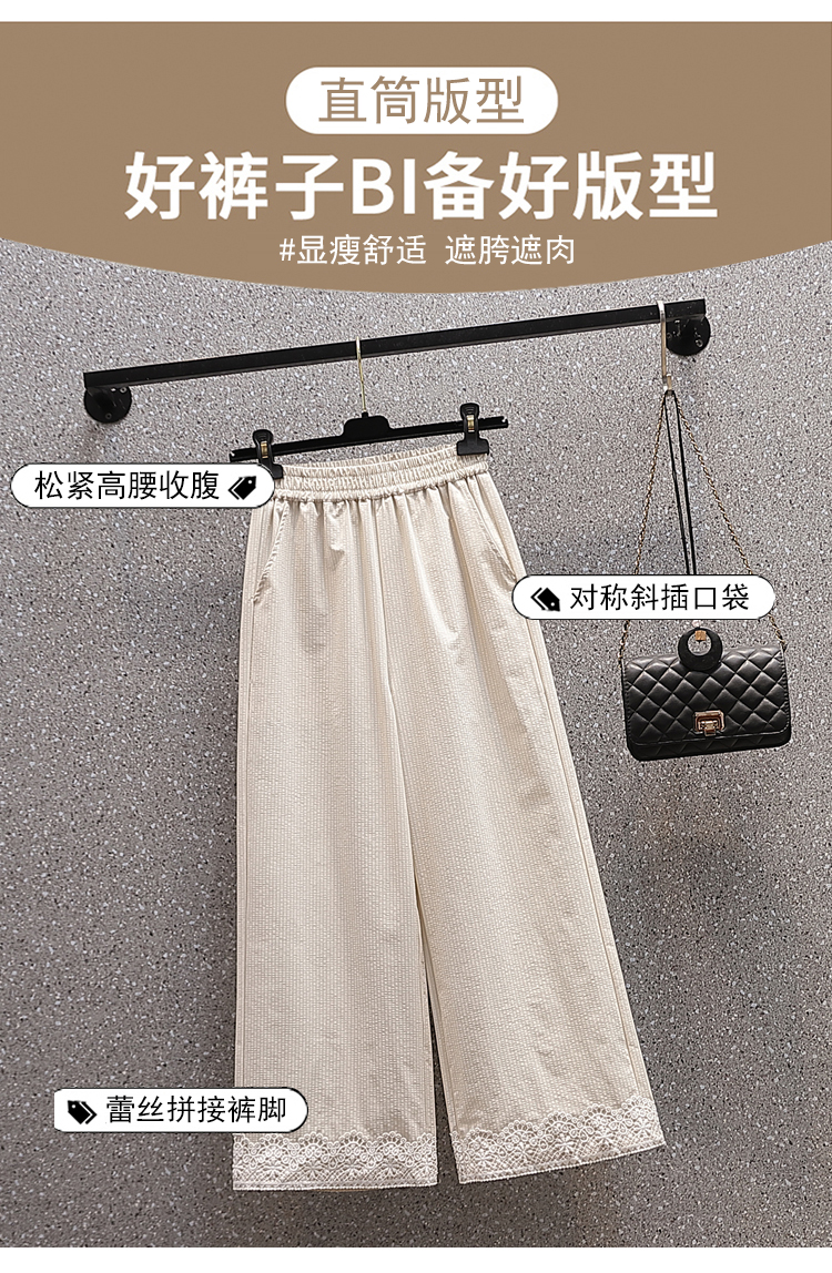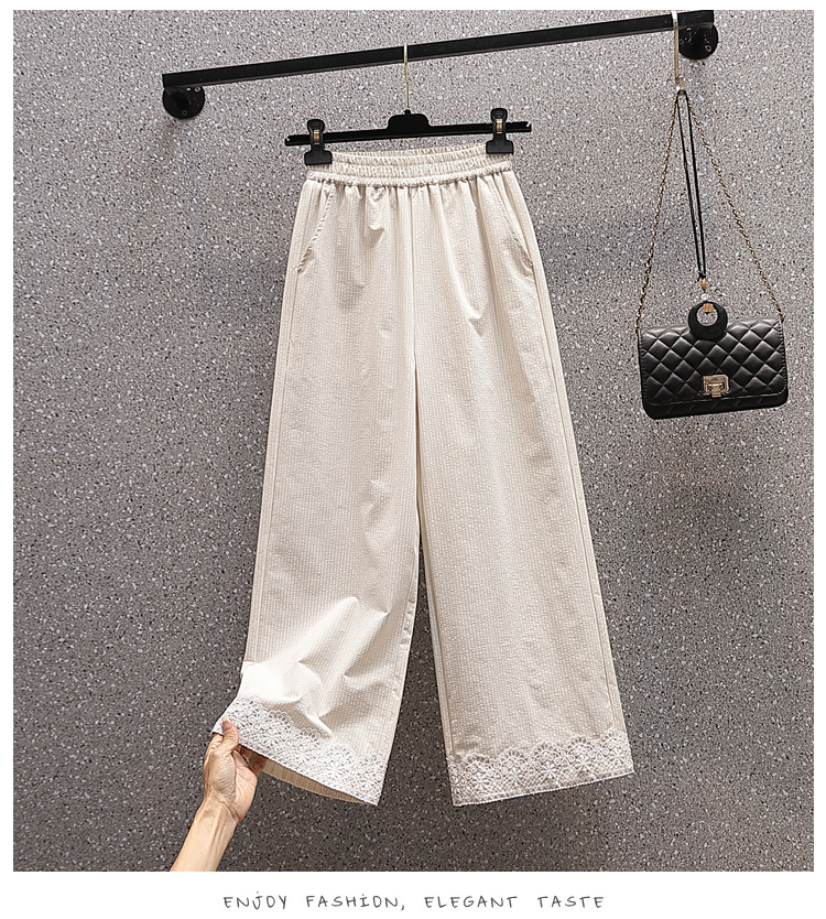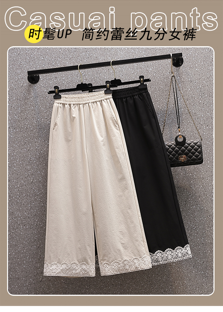 RY2089# 实拍夏新款大码宽松阔腿薄款九分蕾丝女裤胖MM松紧腰显瘦直筒裤