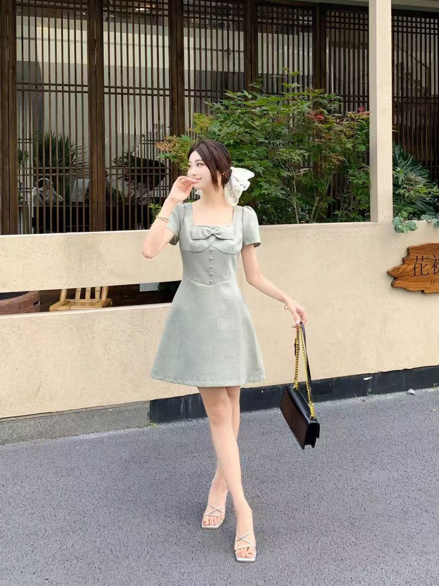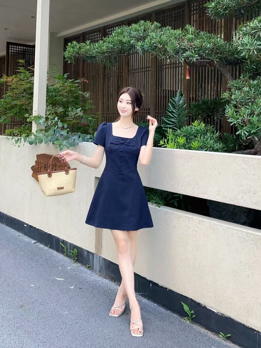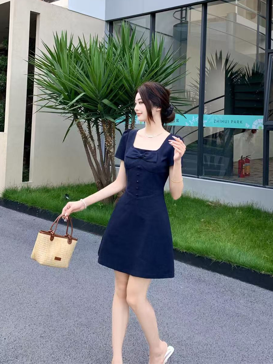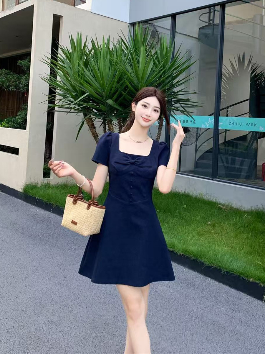 RY2133# 实拍大码女装气质百搭显瘦连衣裙胖MM收腰显瘦法式方领蝴蝶结裙子