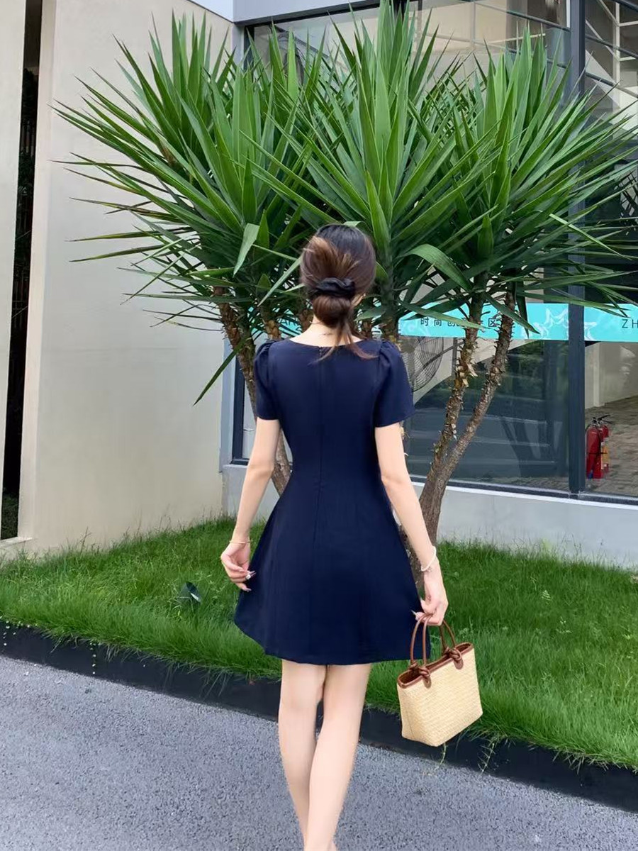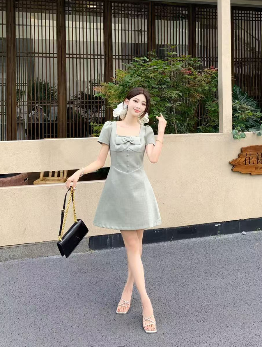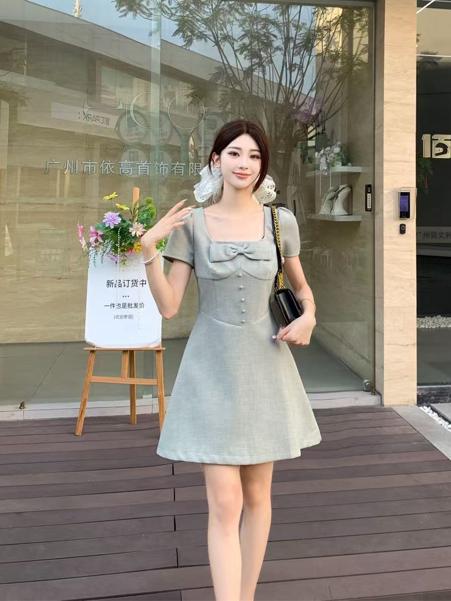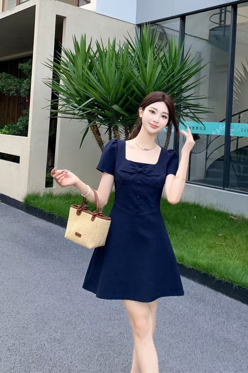 RY2133# 实拍大码女装气质百搭显瘦连衣裙胖MM收腰显瘦法式方领蝴蝶结裙子