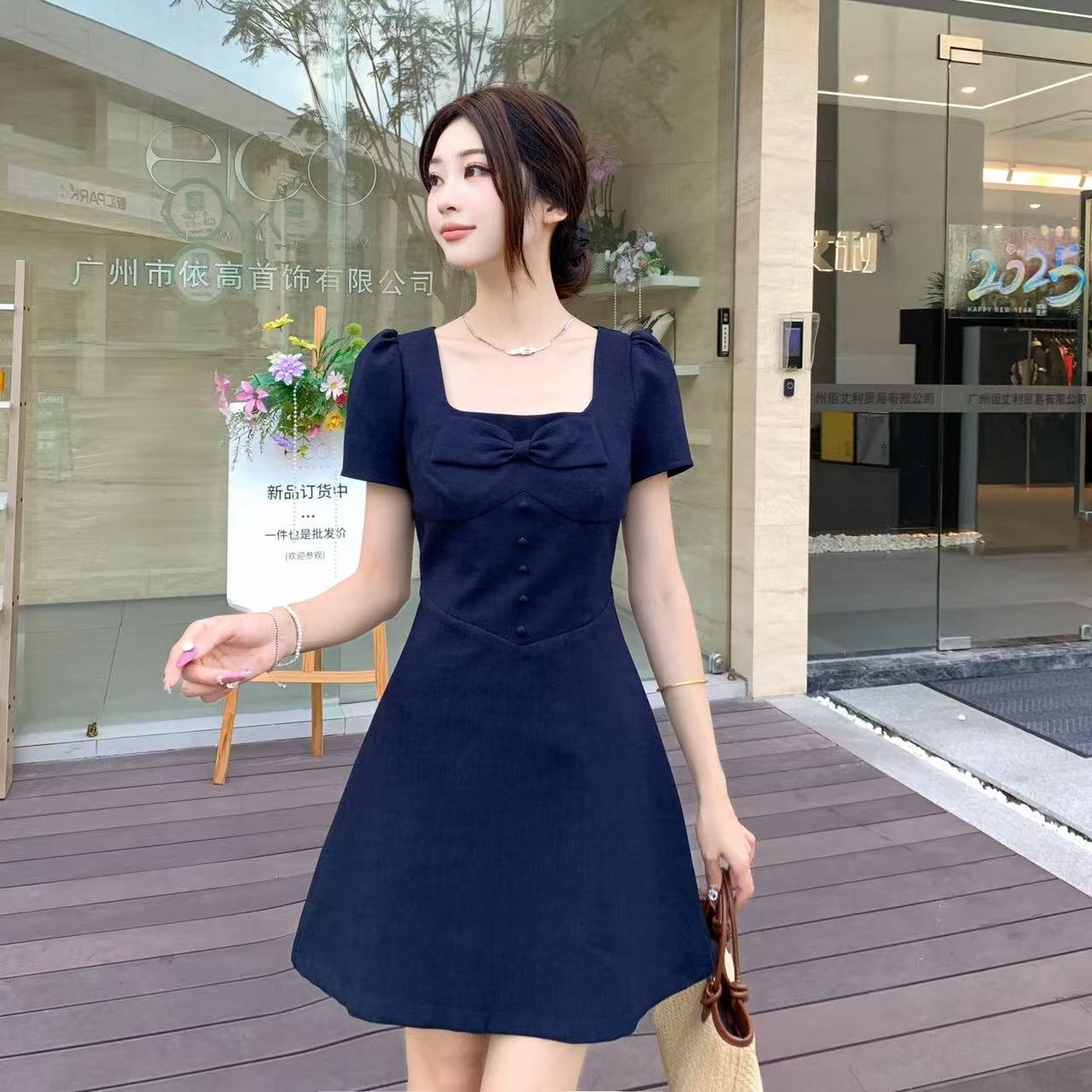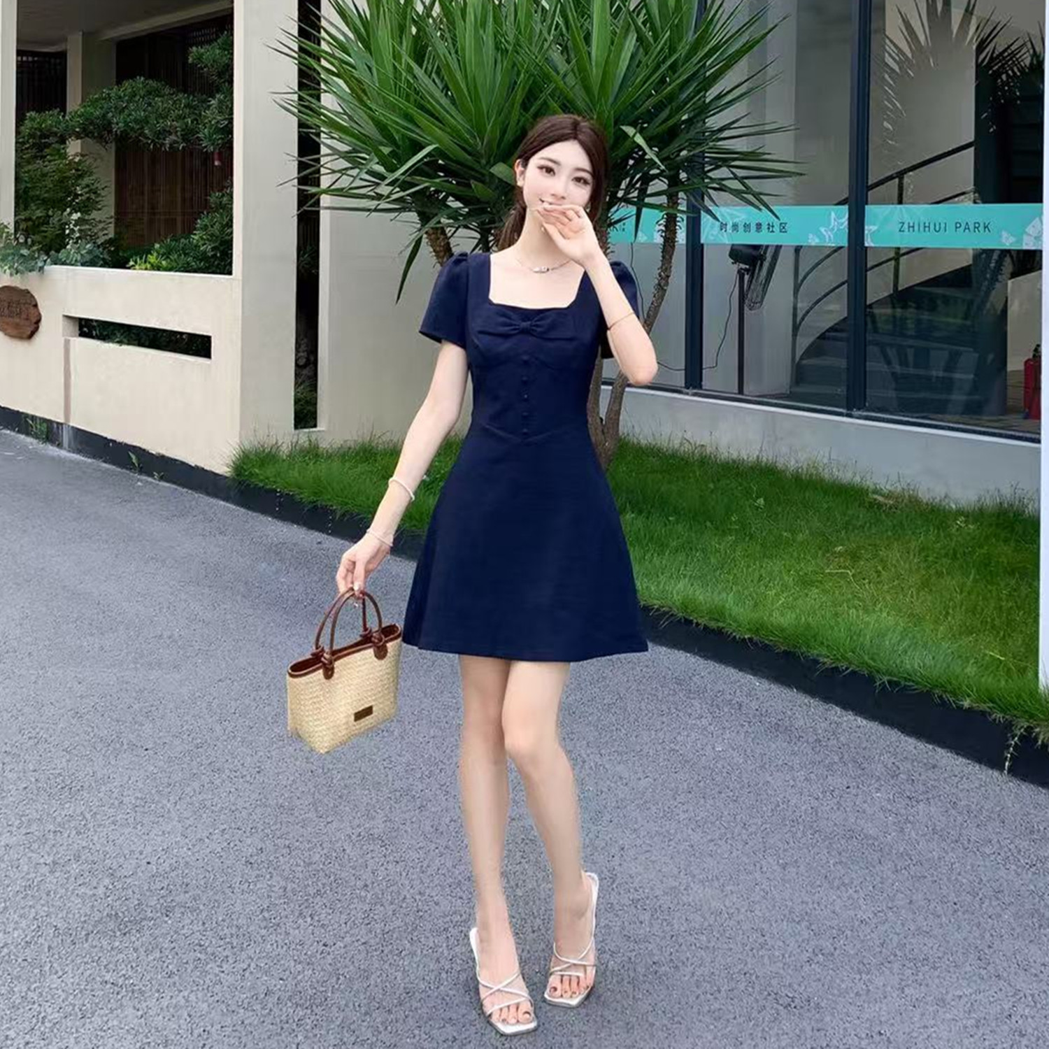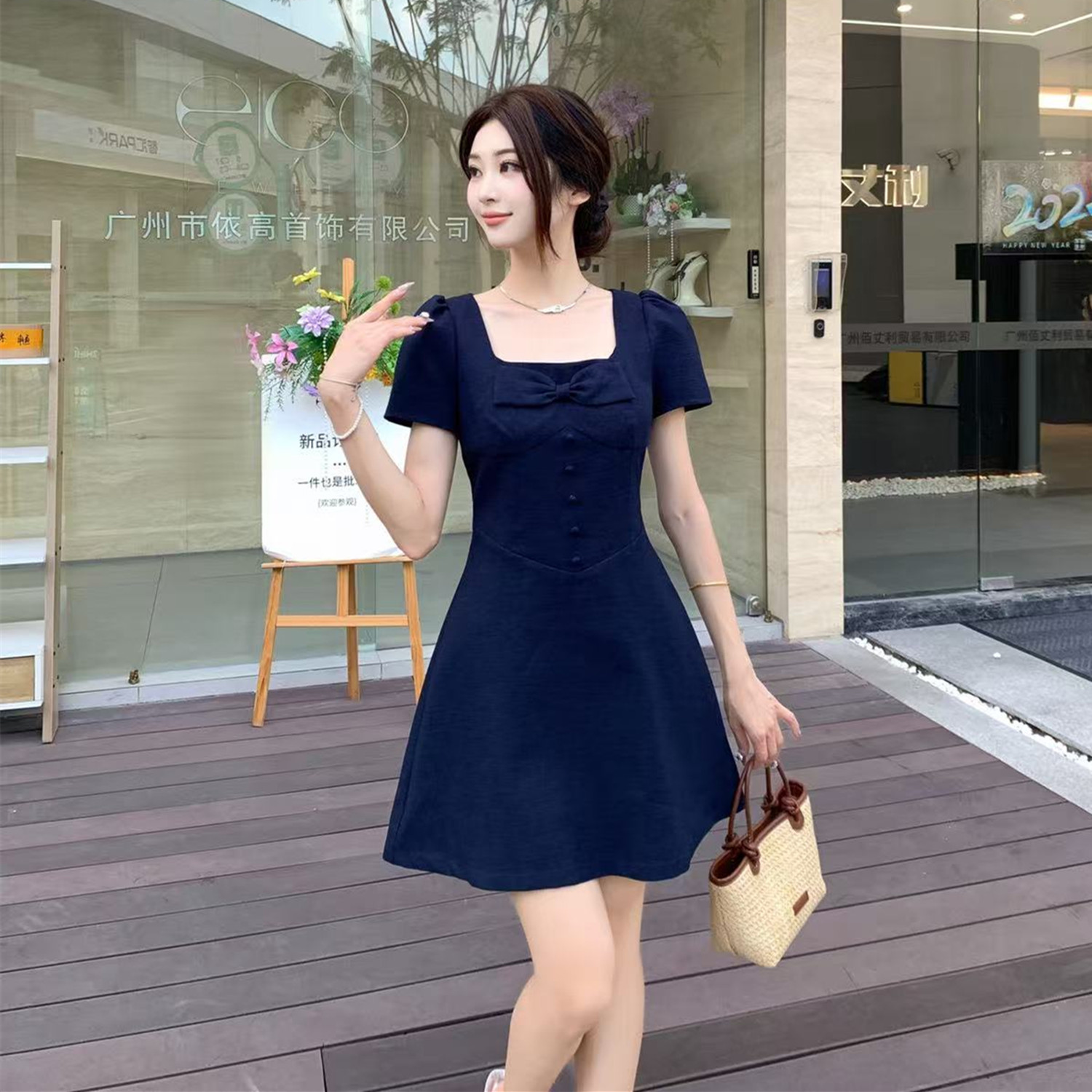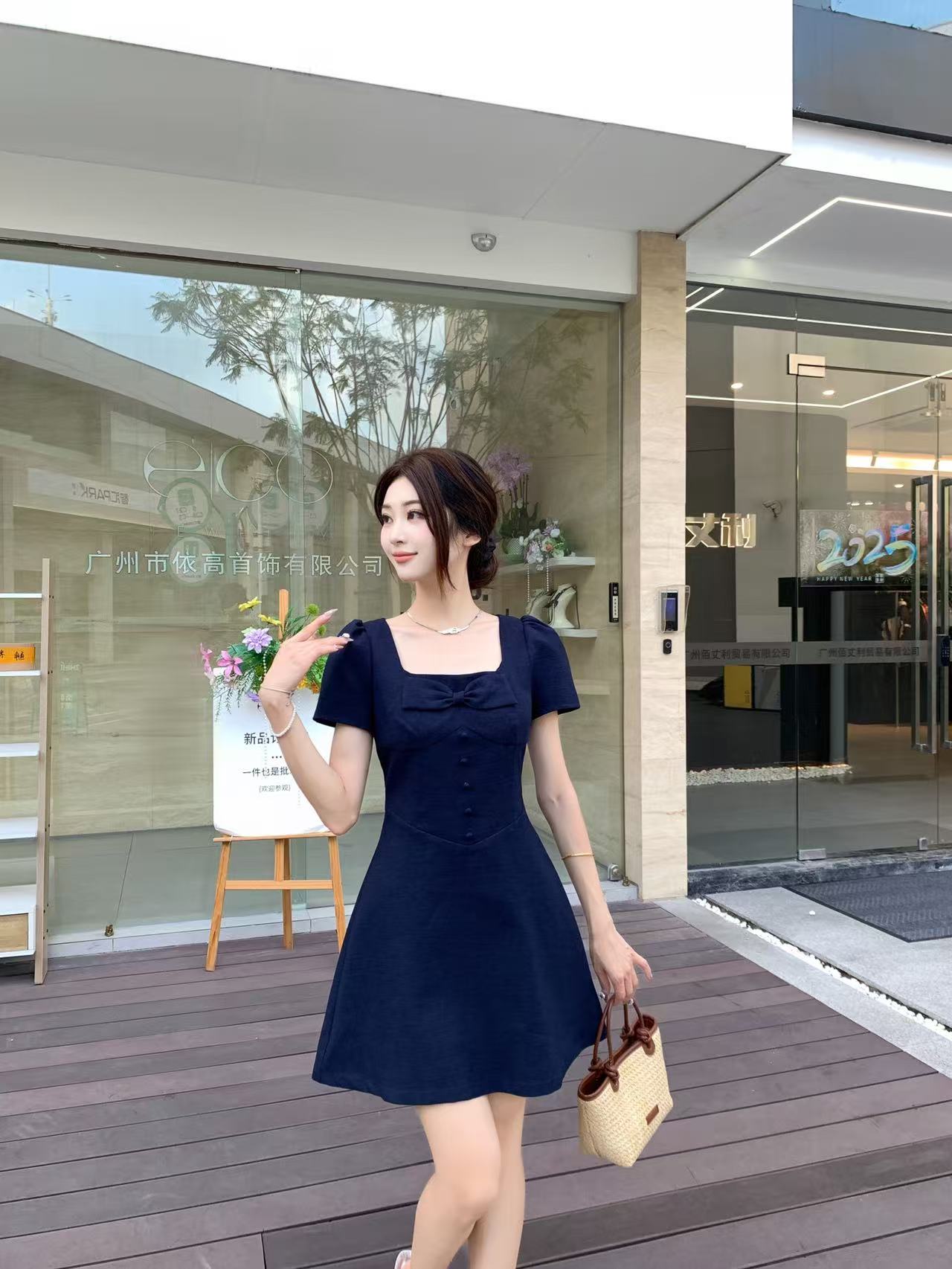 RY2133# 实拍大码女装气质百搭显瘦连衣裙胖MM收腰显瘦法式方领蝴蝶结裙子