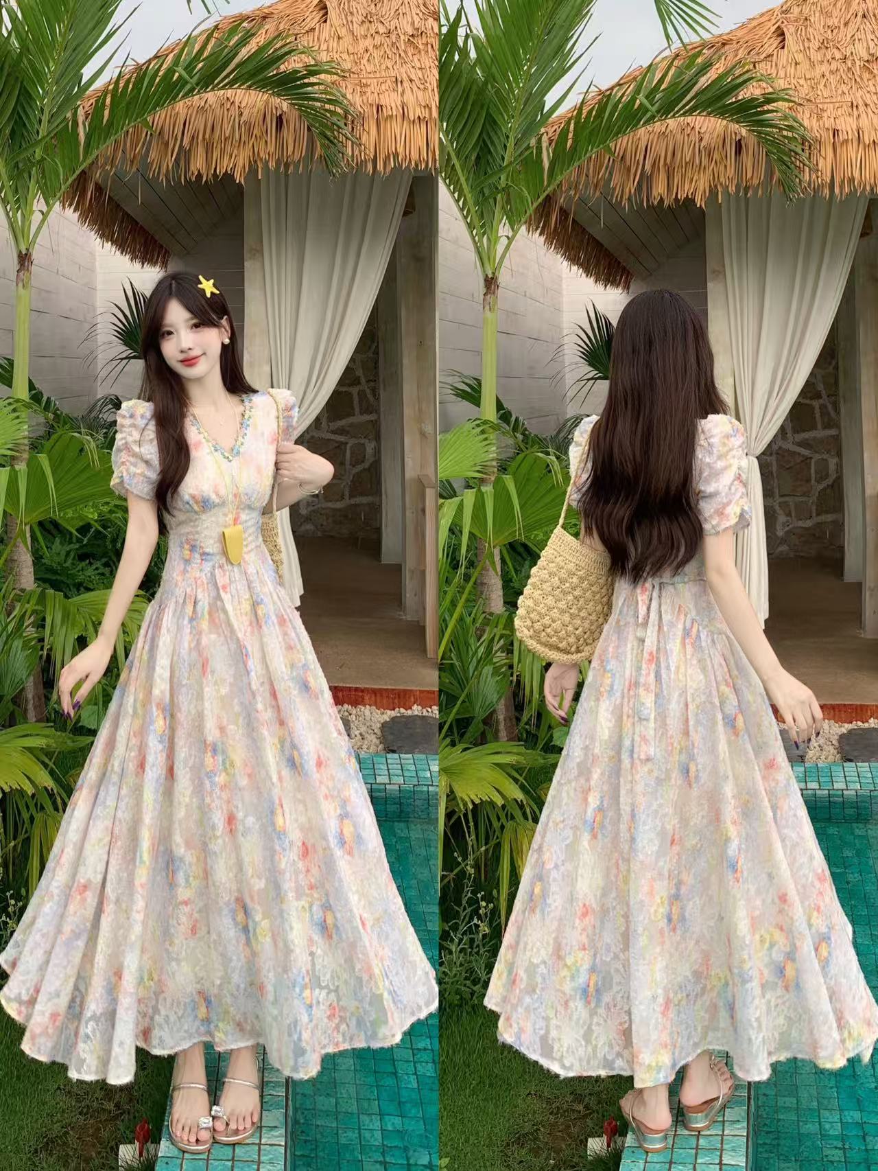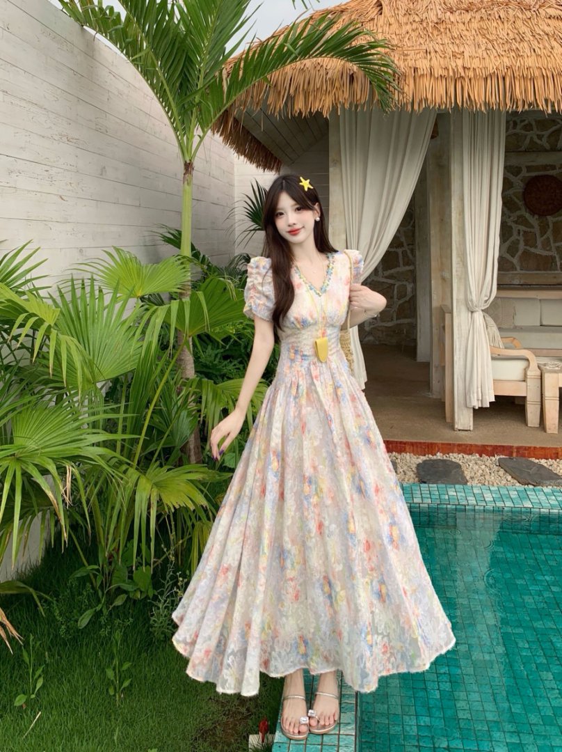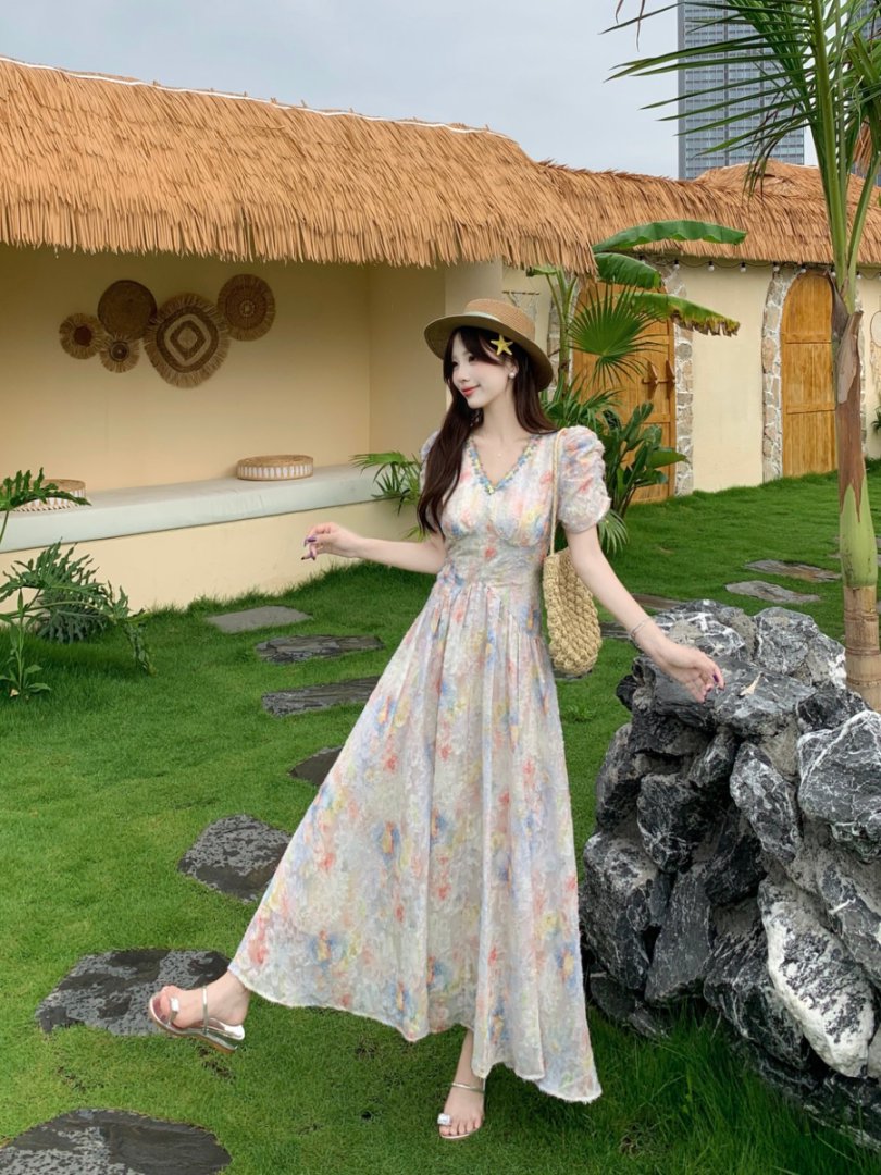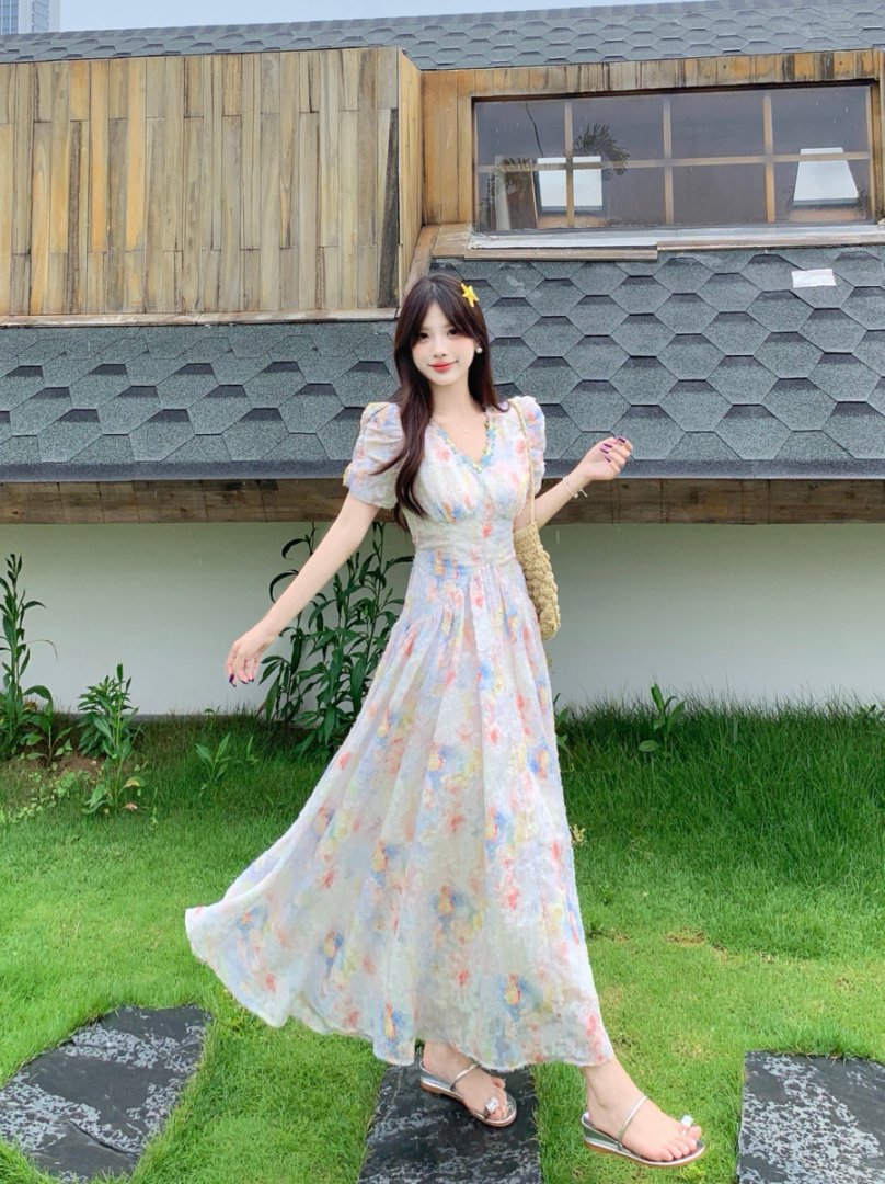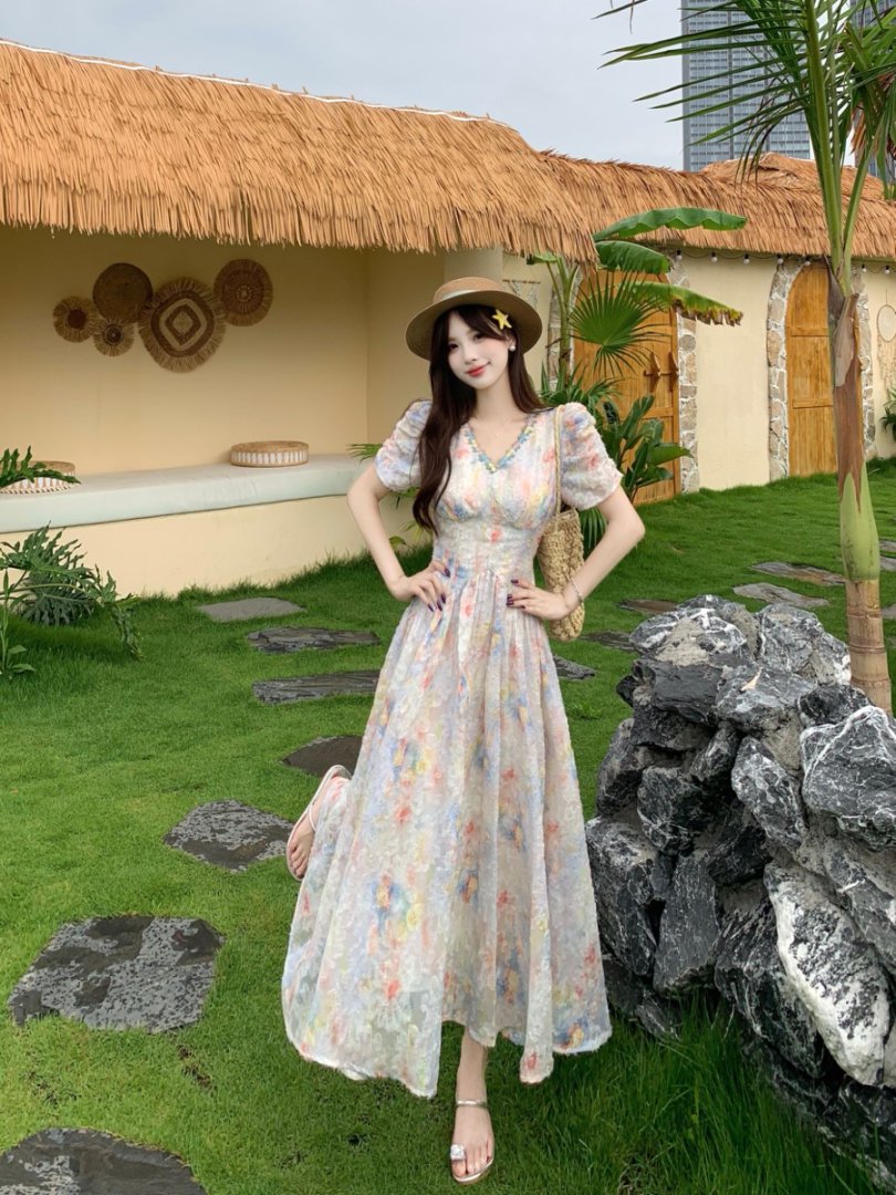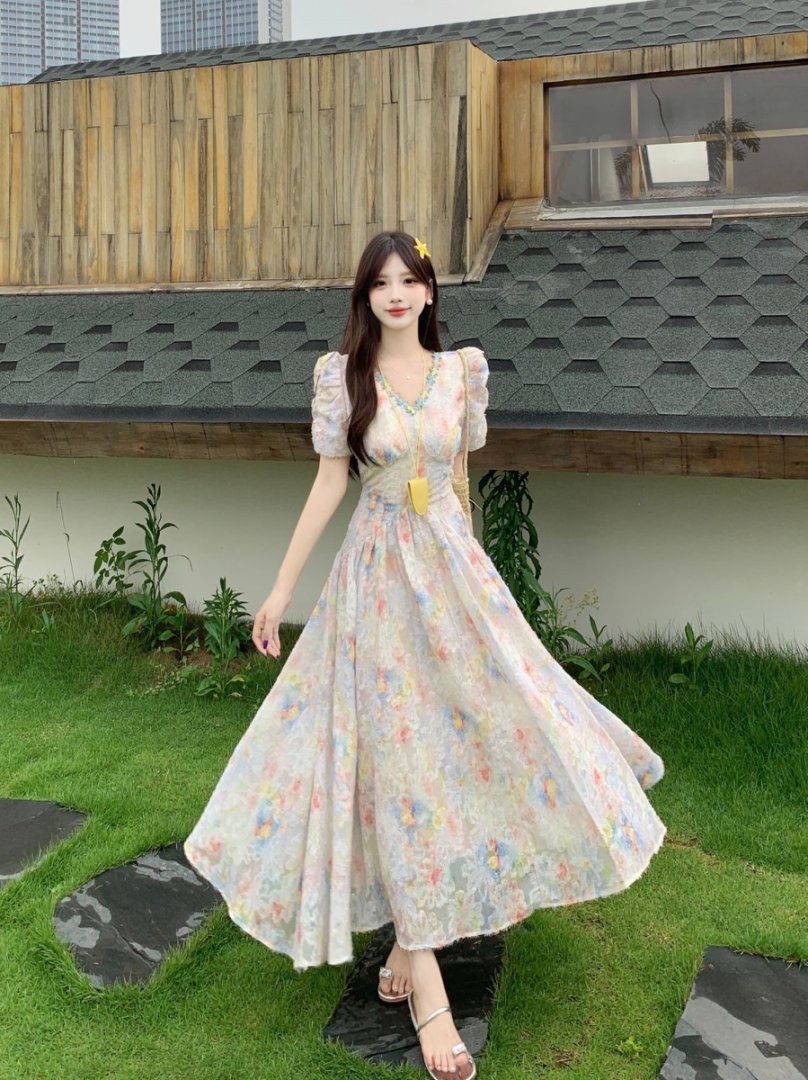 RY2141# 实拍大码法式甜美碎花连衣裙女收腰长裙2026夏季新款绝美仙女裙