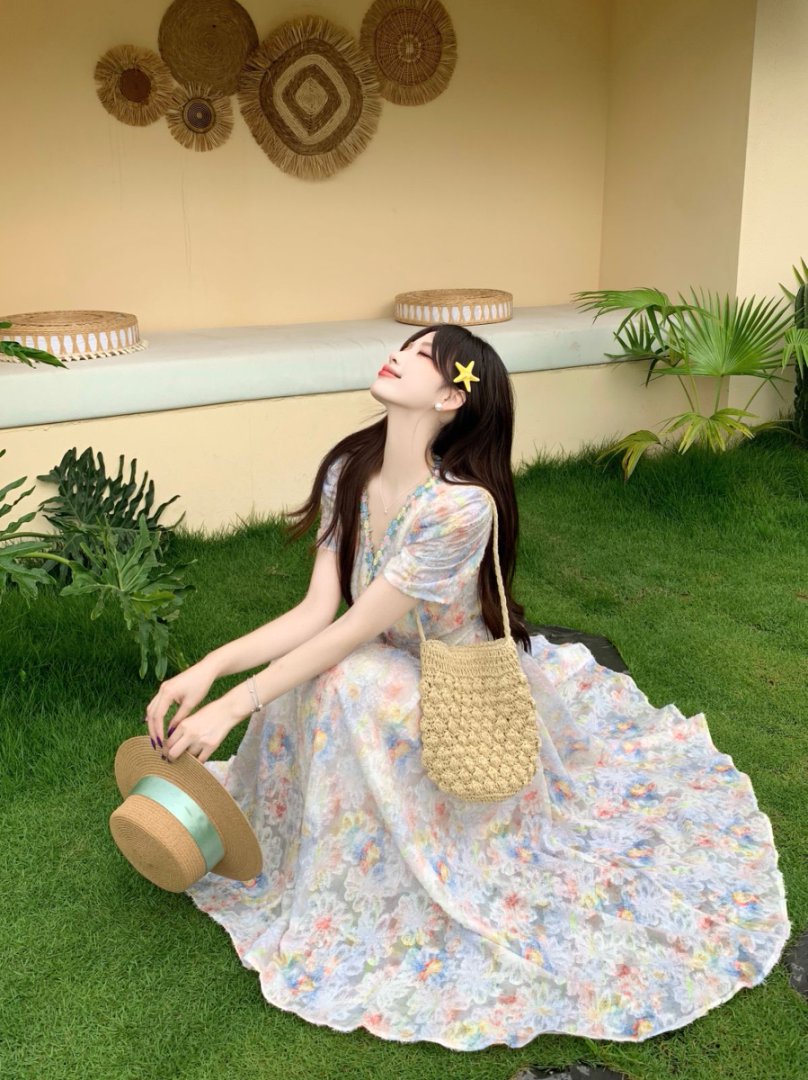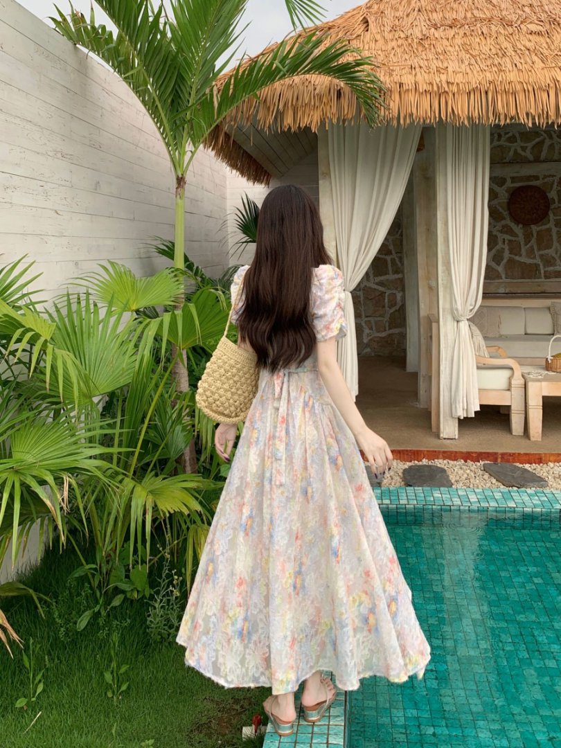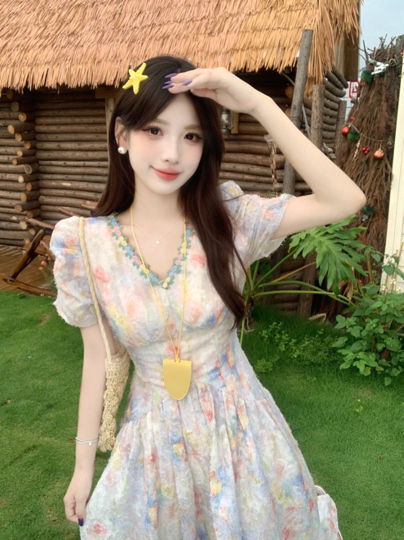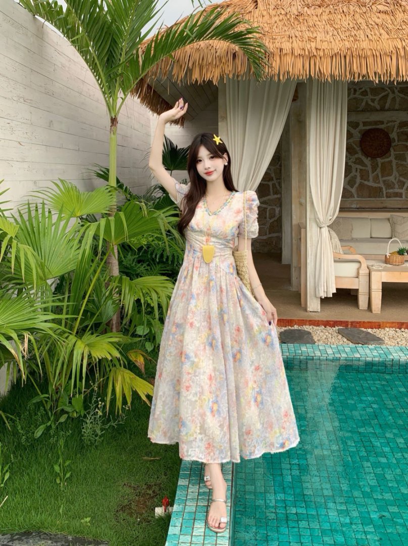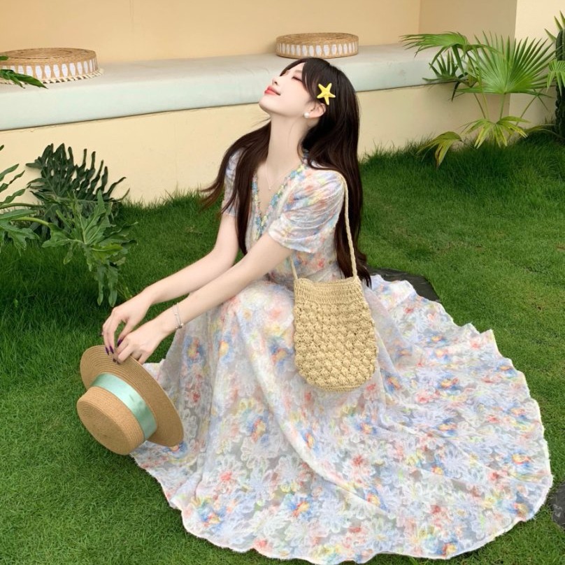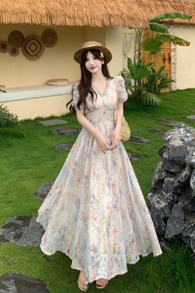 RY2141# 实拍大码法式甜美碎花连衣裙女收腰长裙2026夏季新款绝美仙女裙