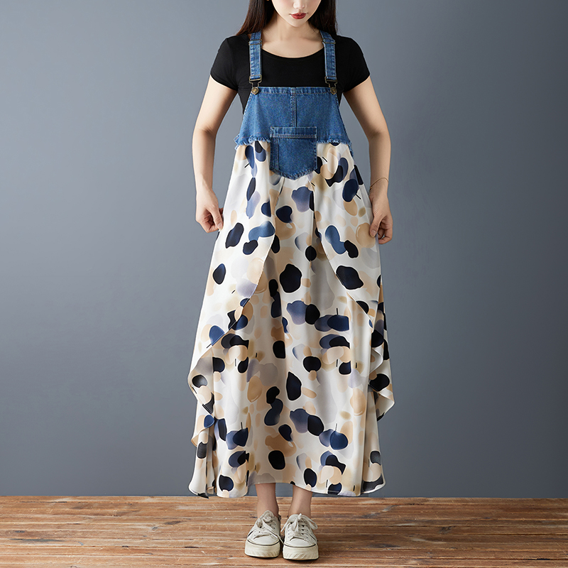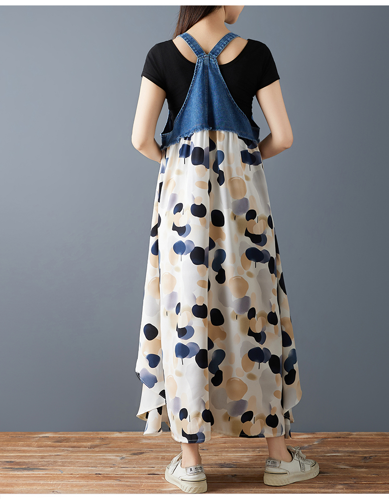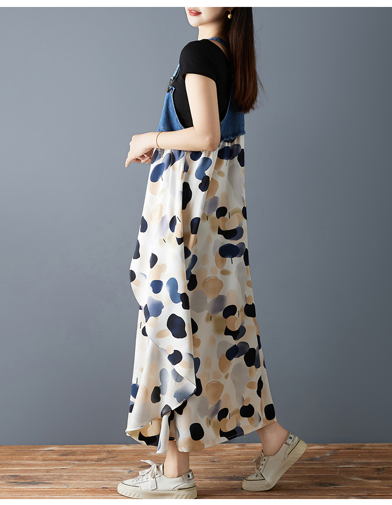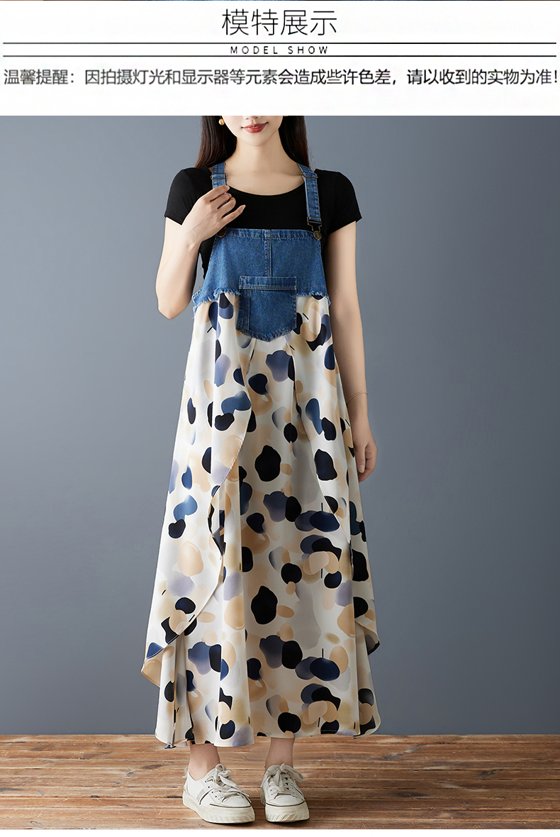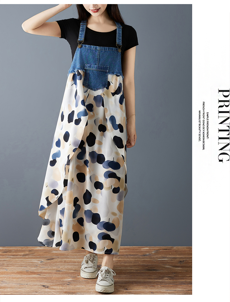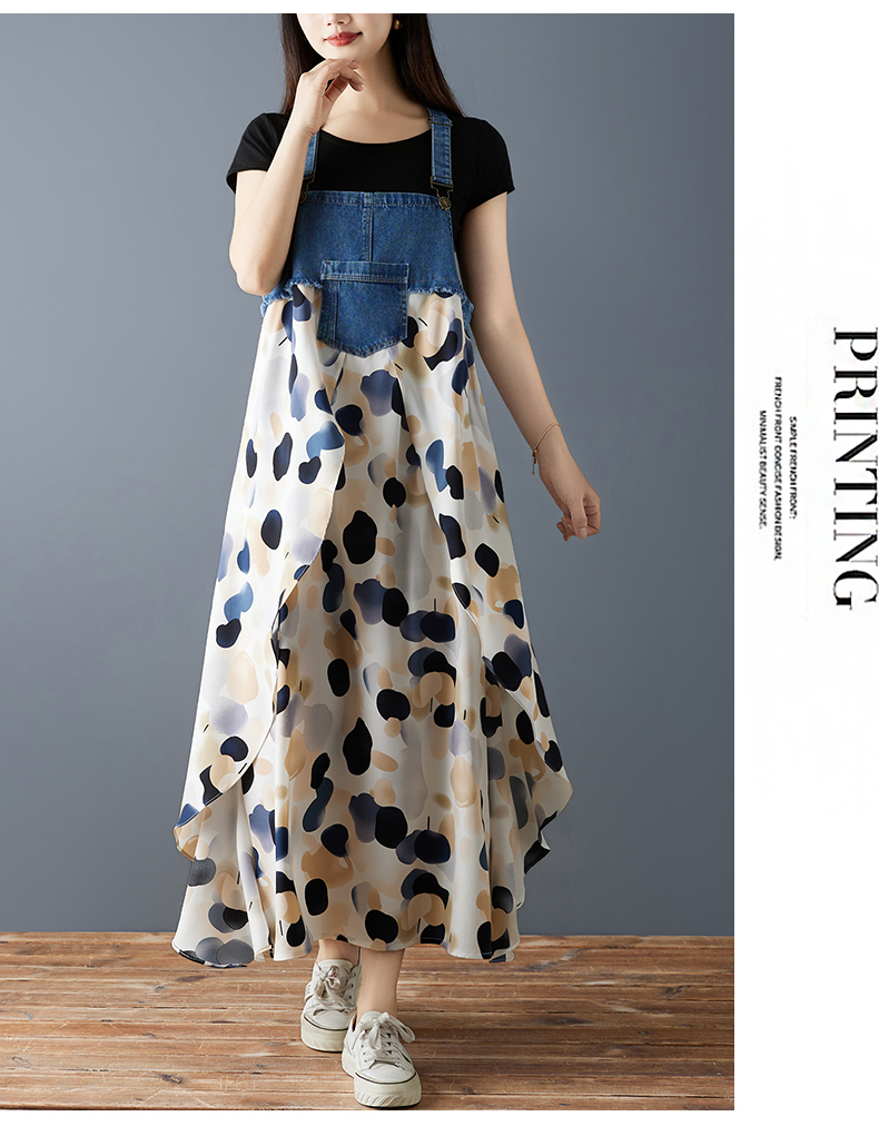 RY2145# 实拍2026夏季新款荷叶边宽松雪纺印花牛仔设计感背带中长款连衣裙