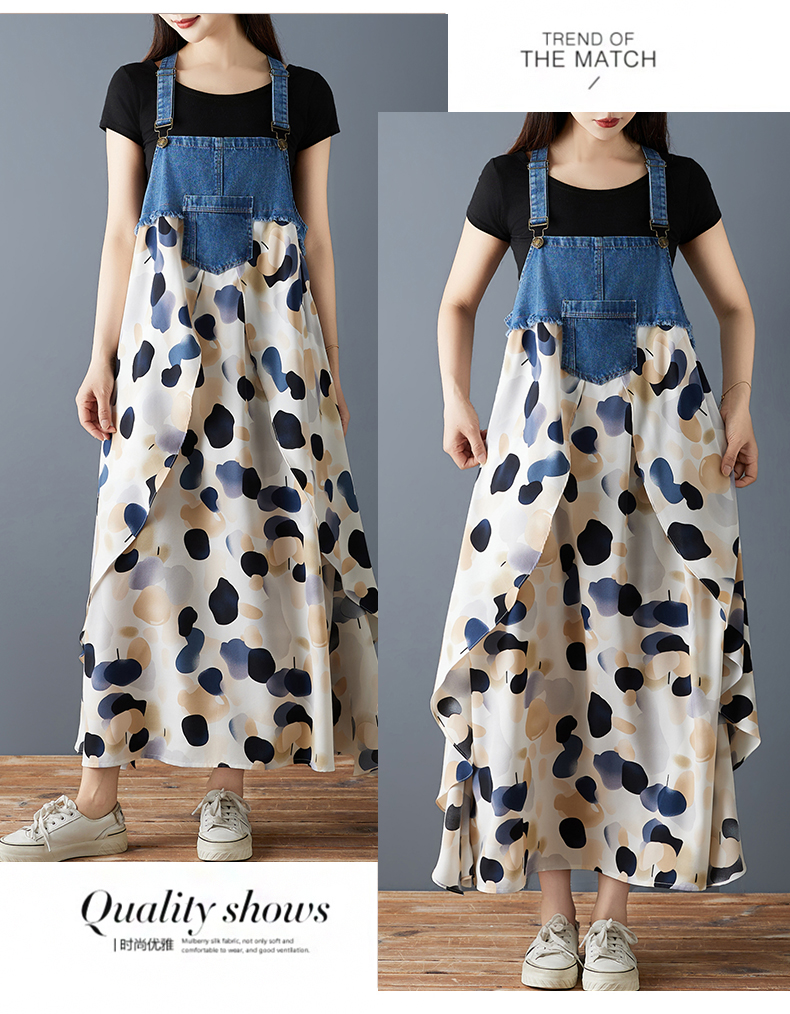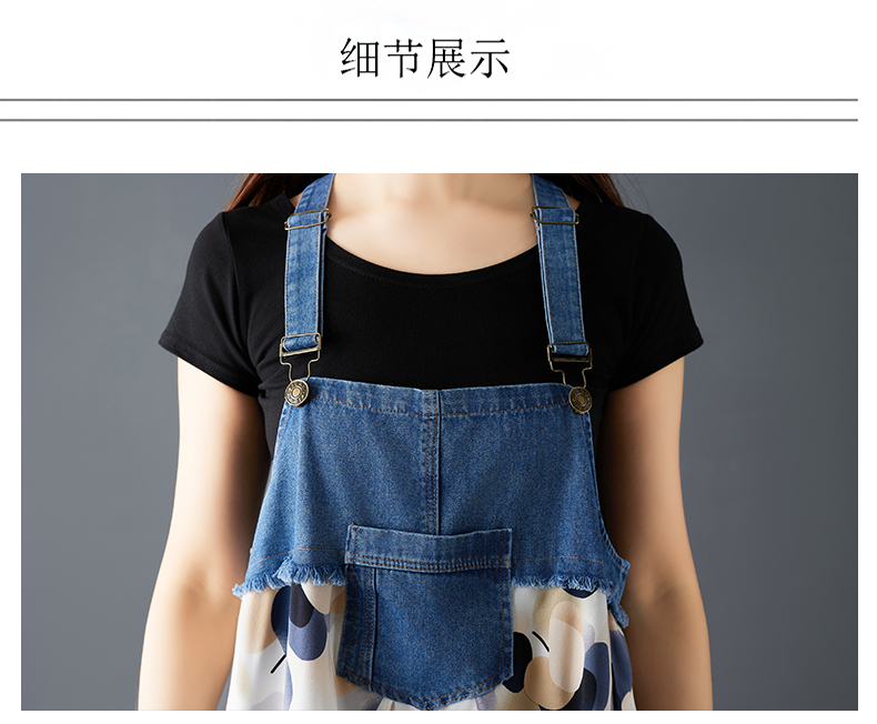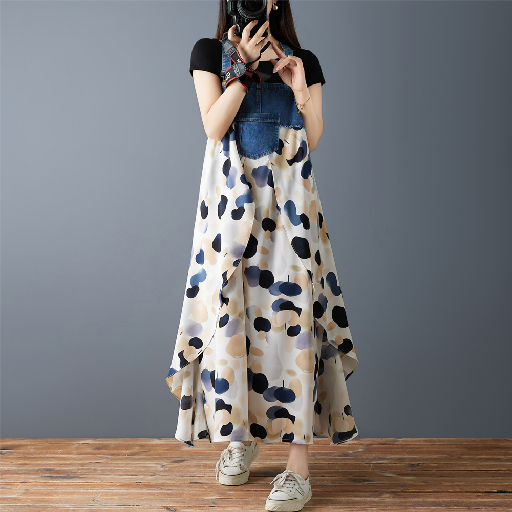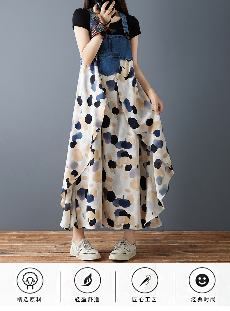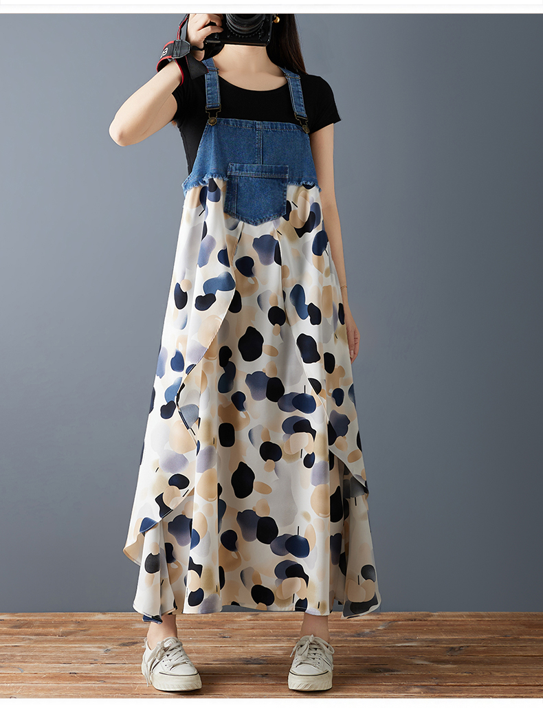 RY2145# 实拍2026夏季新款荷叶边宽松雪纺印花牛仔设计感背带中长款连衣裙