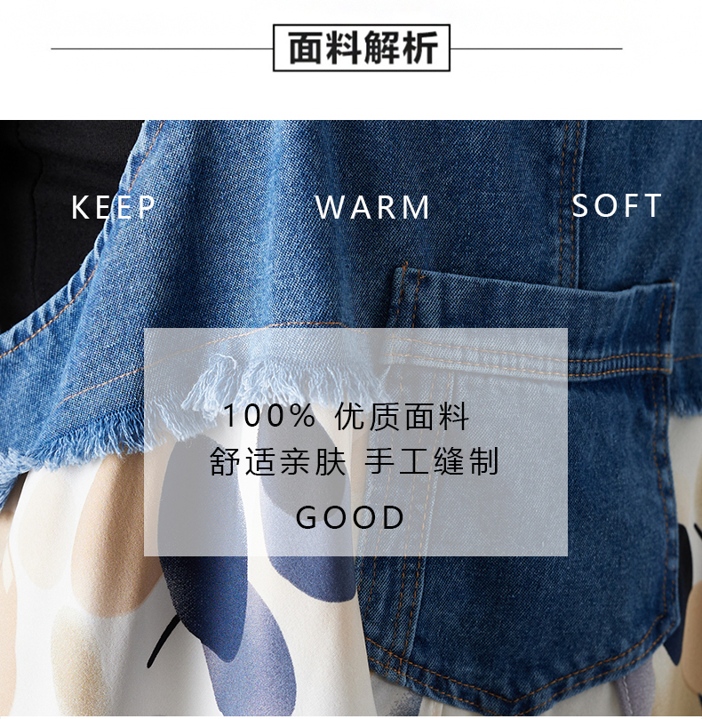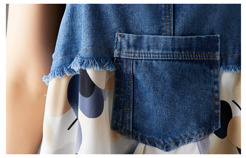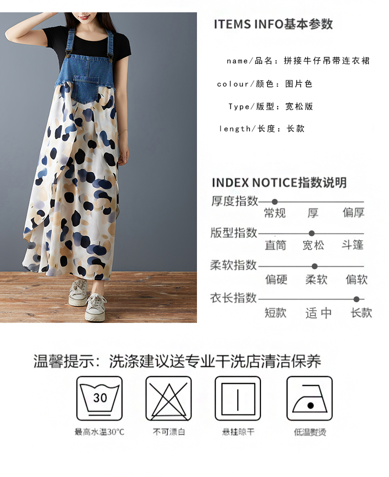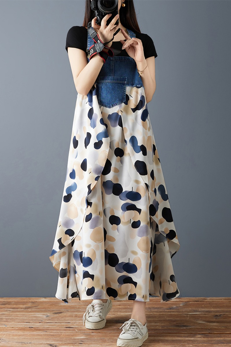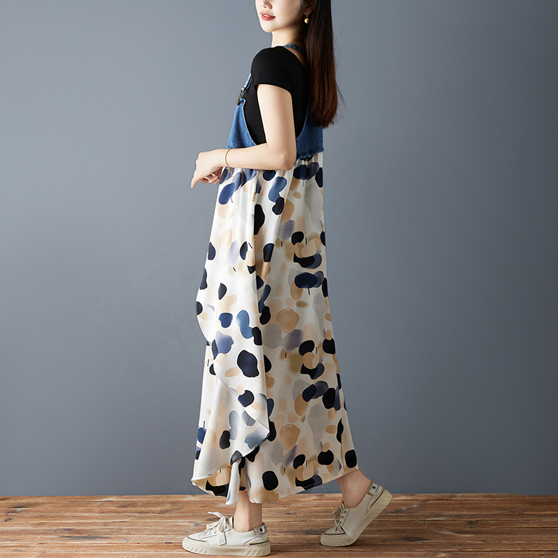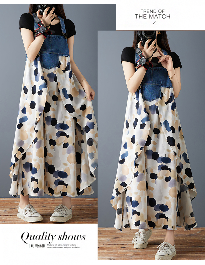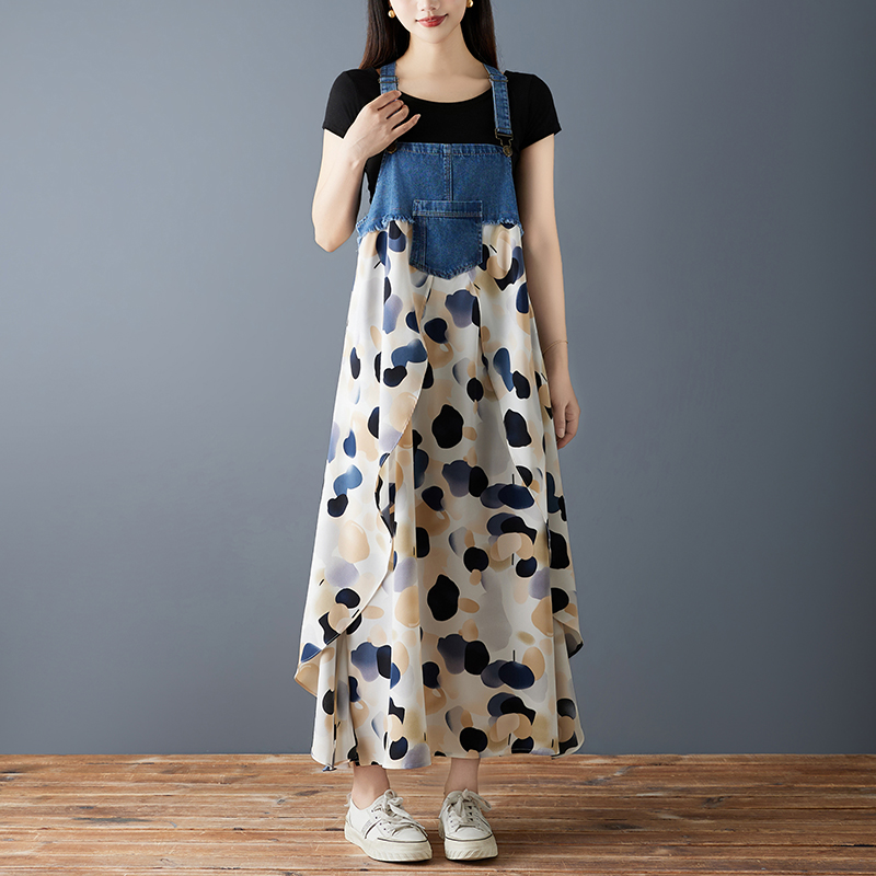 RY2145# 实拍2026夏季新款荷叶边宽松雪纺印花牛仔设计感背带中长款连衣裙