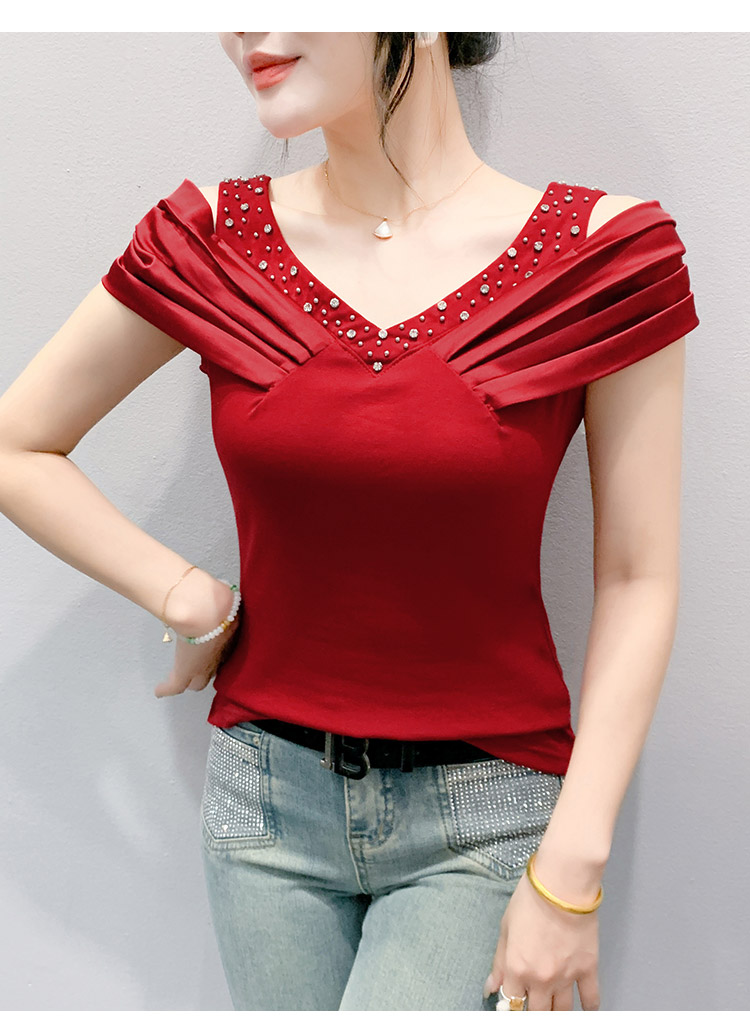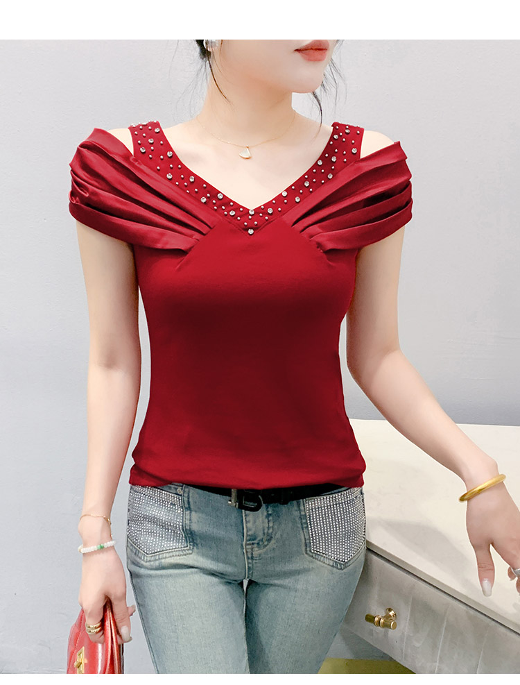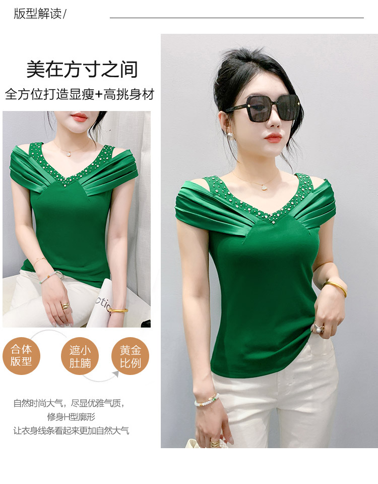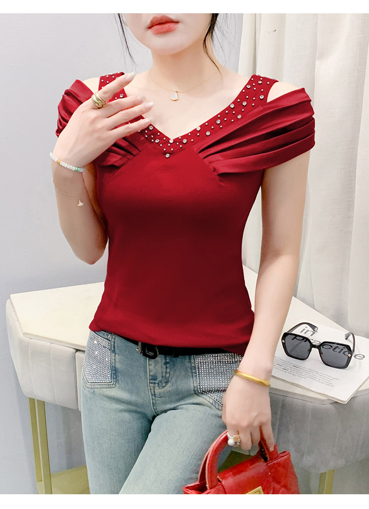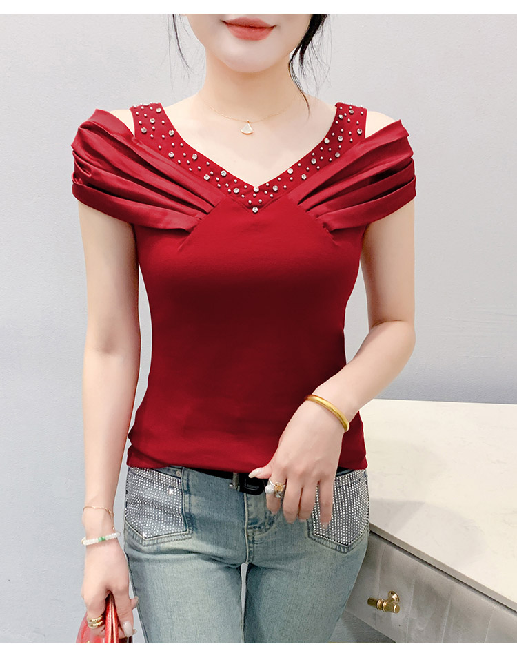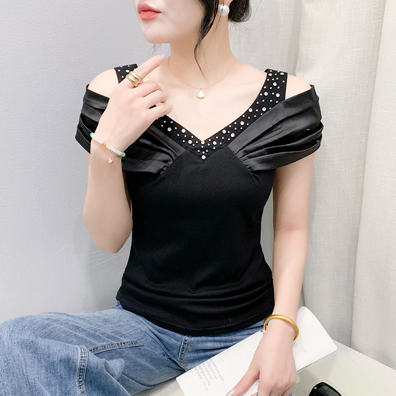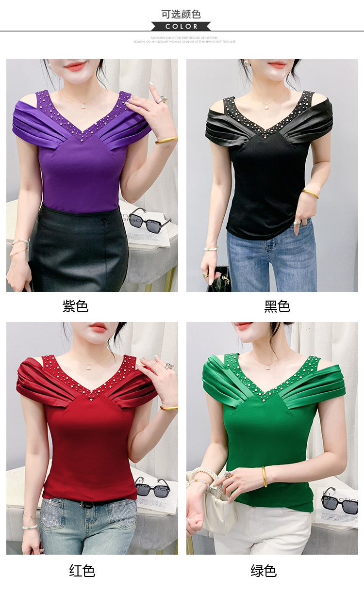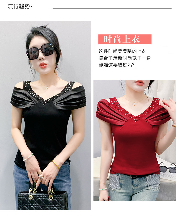 RY2179# 气质露肩钉钻V领褶皱上衣女缎面袖夏装性感镂空T恤修身百搭半袖