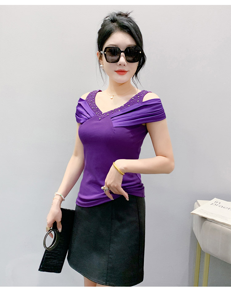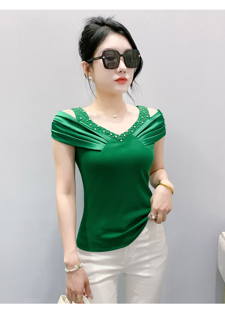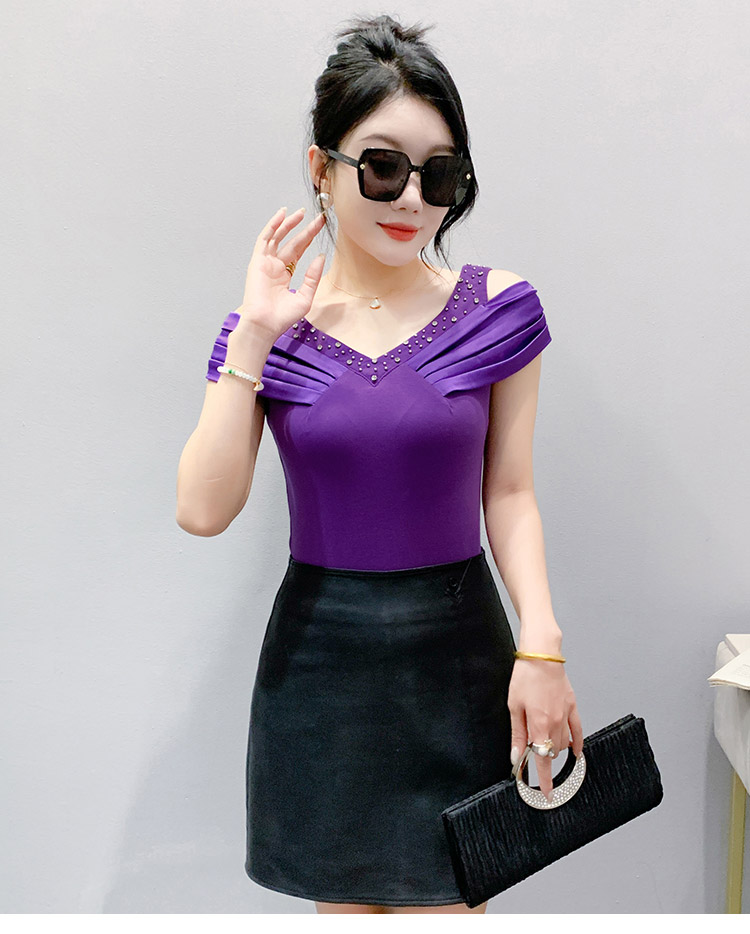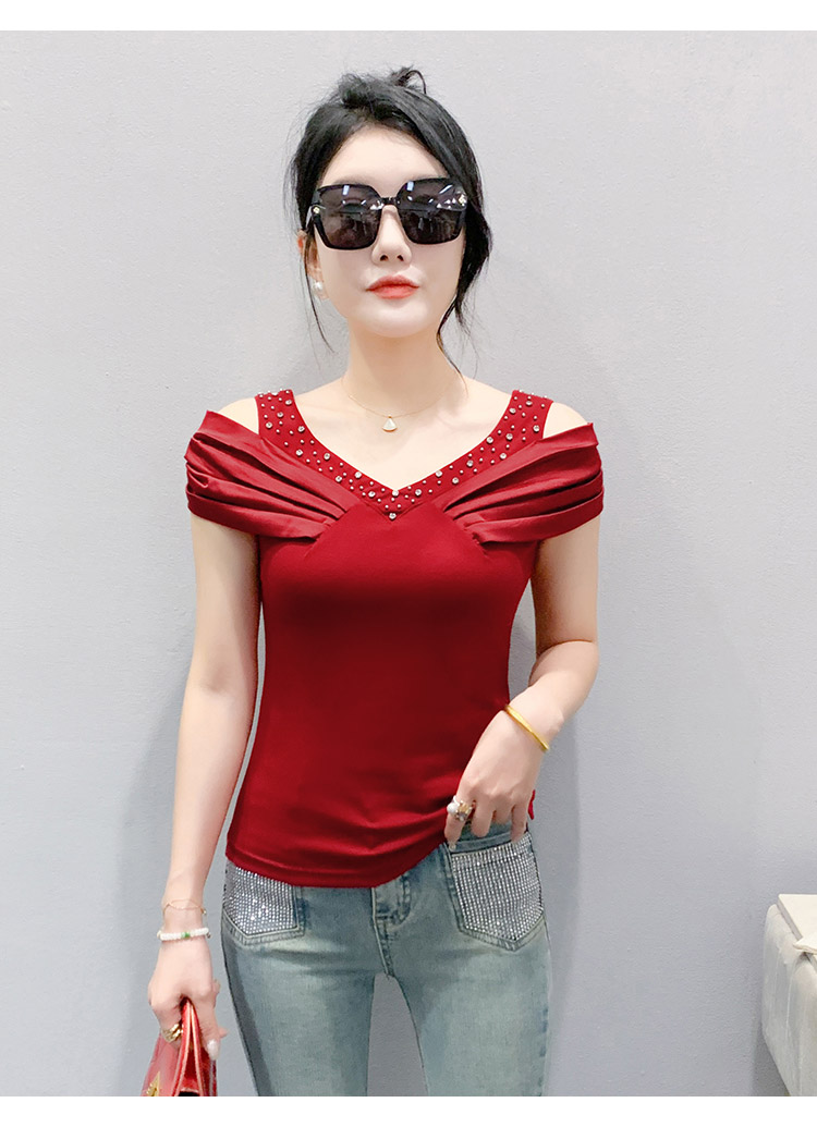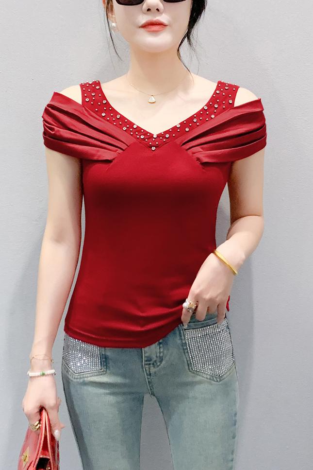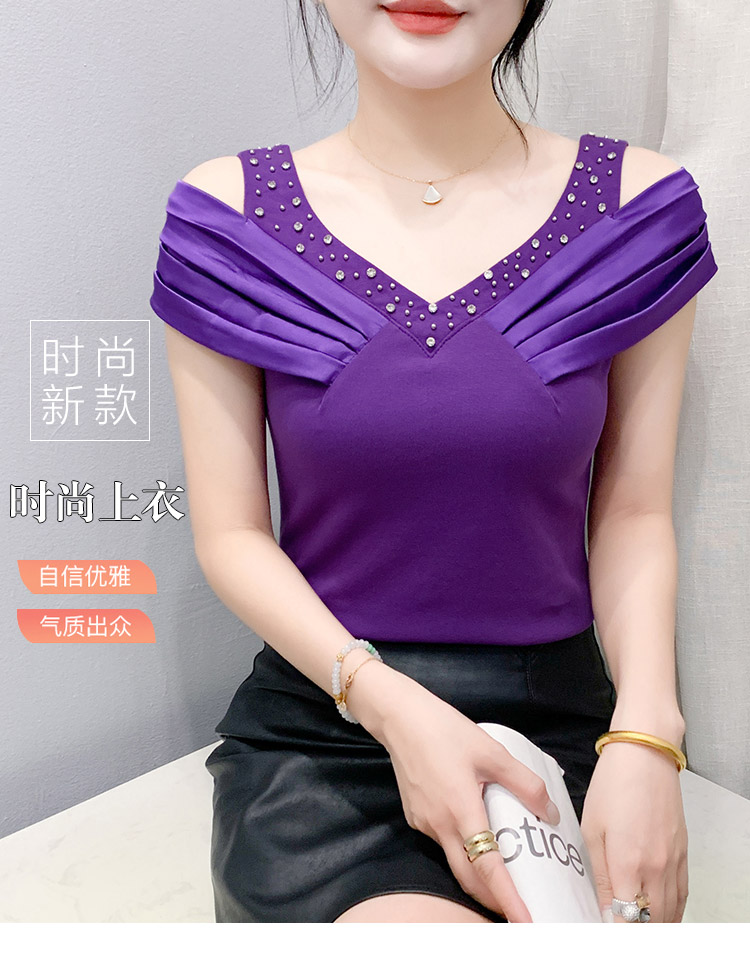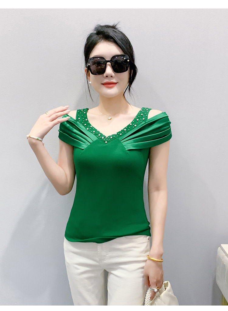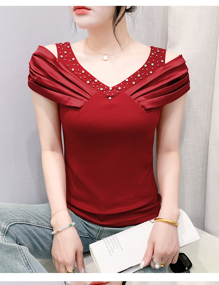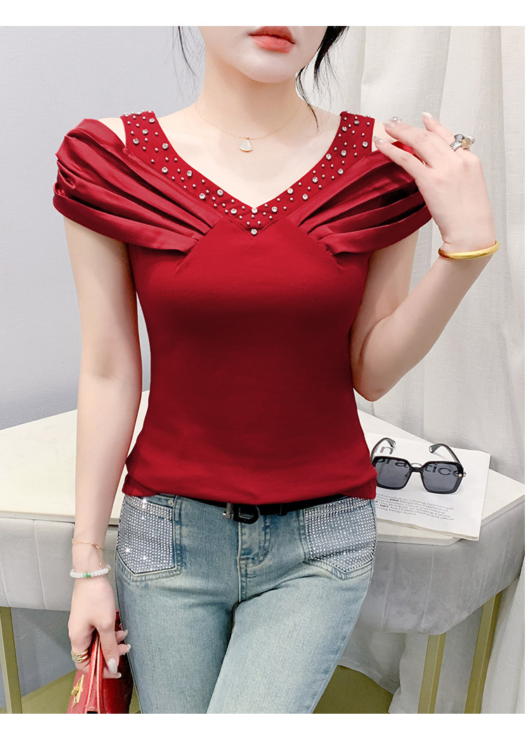 RY2179# 气质露肩钉钻V领褶皱上衣女缎面袖夏装性感镂空T恤修身百搭半袖