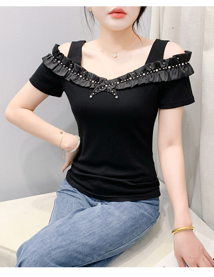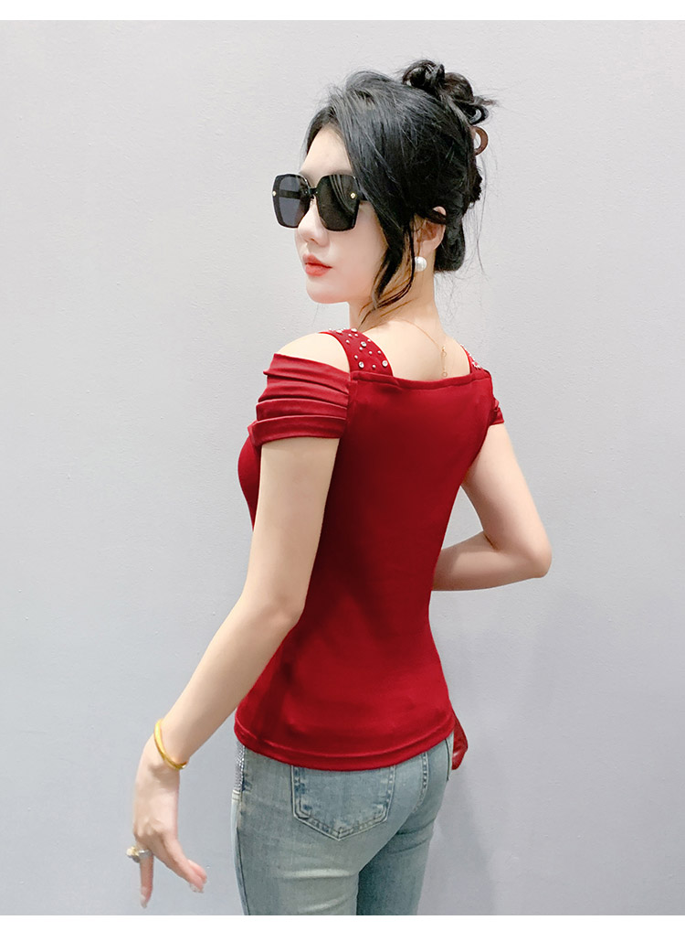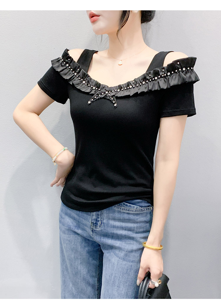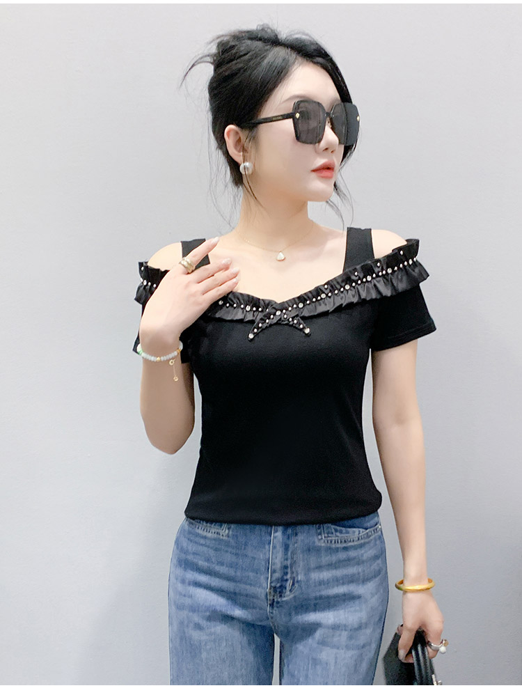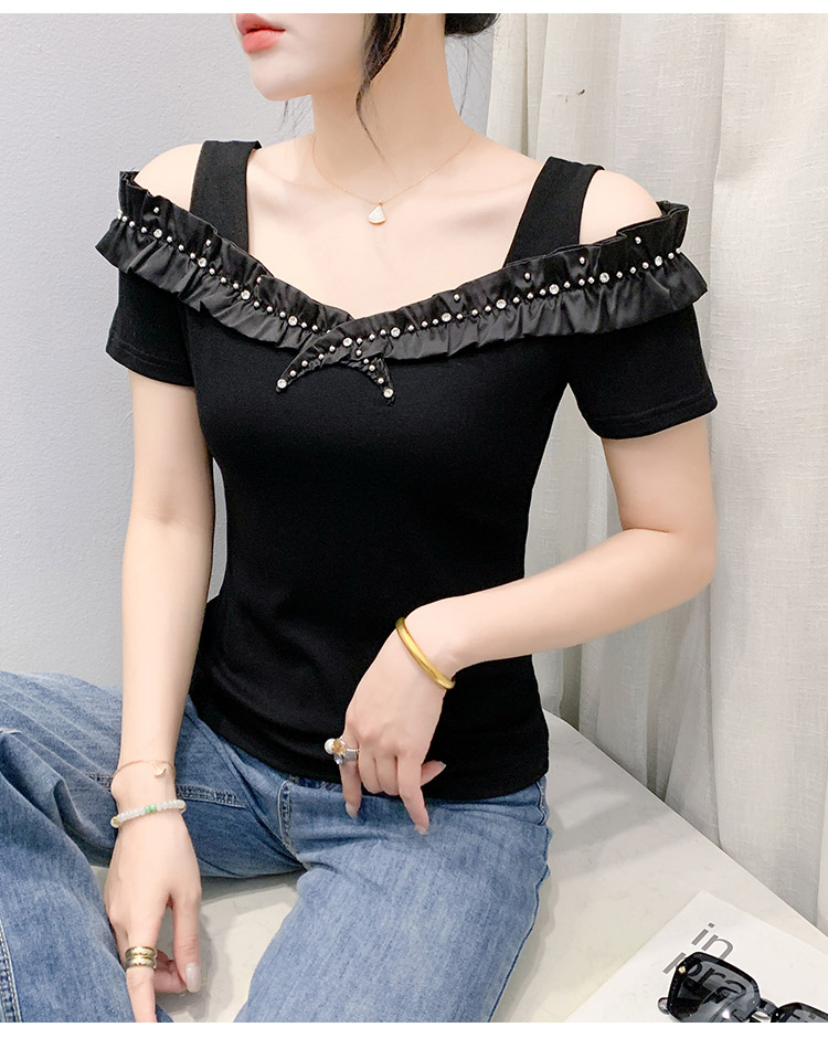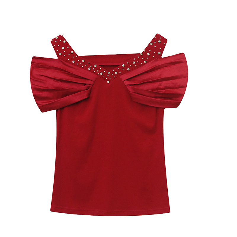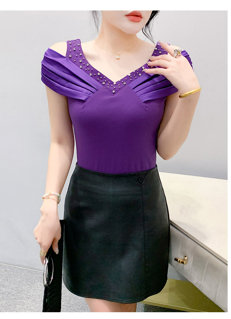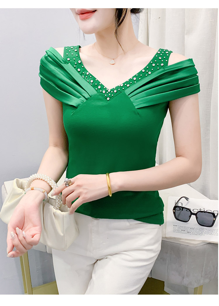 RY2179# 气质露肩钉钻V领褶皱上衣女缎面袖夏装性感镂空T恤修身百搭半袖