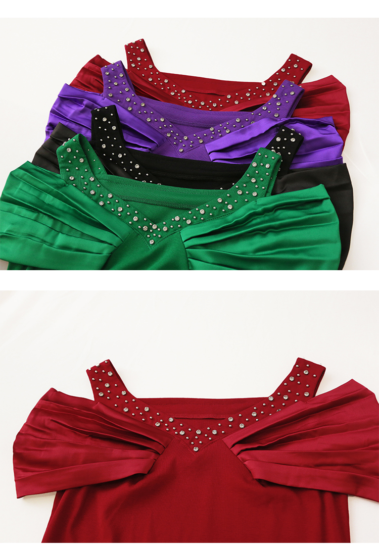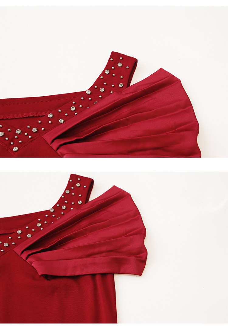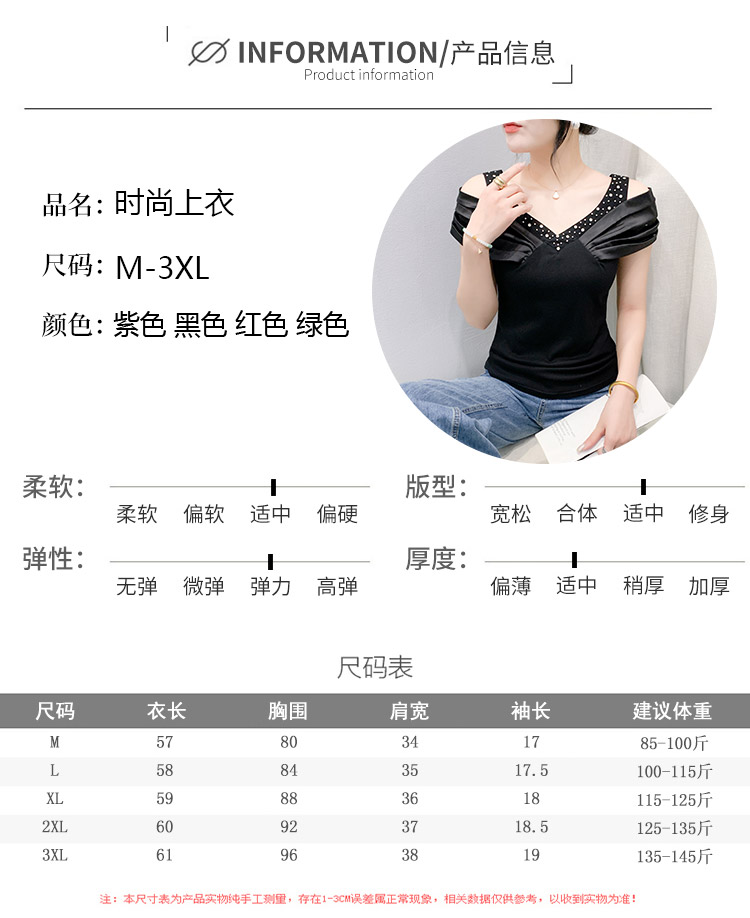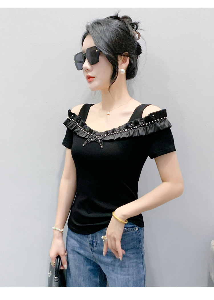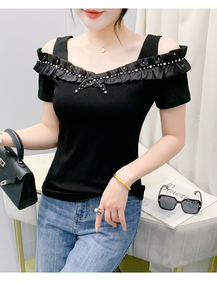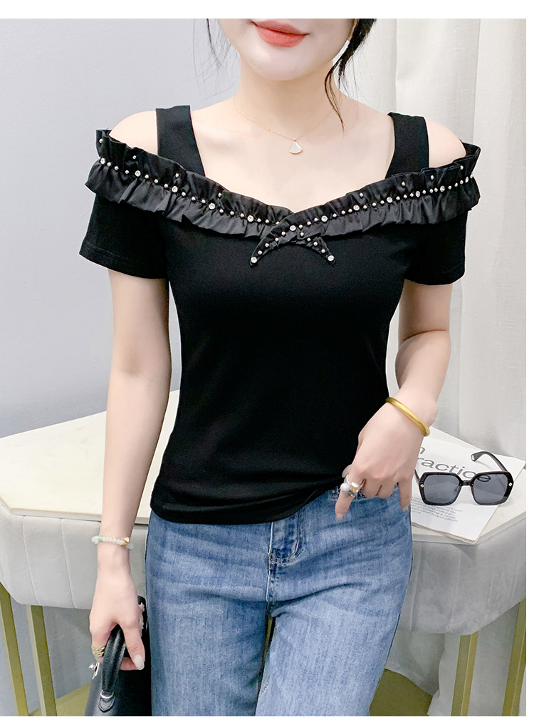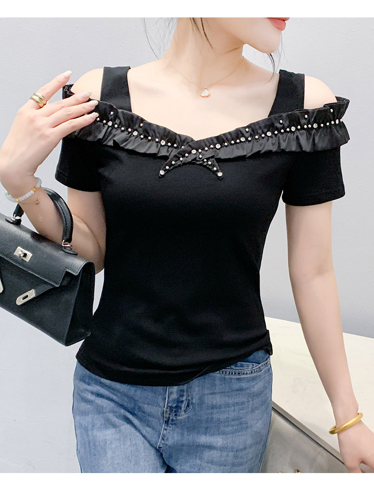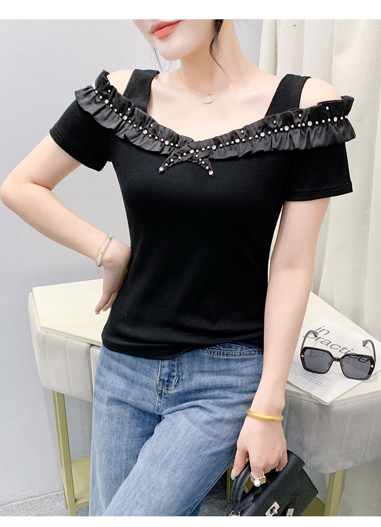 RY2179# 气质露肩钉钻V领褶皱上衣女缎面袖夏装性感镂空T恤修身百搭半袖
