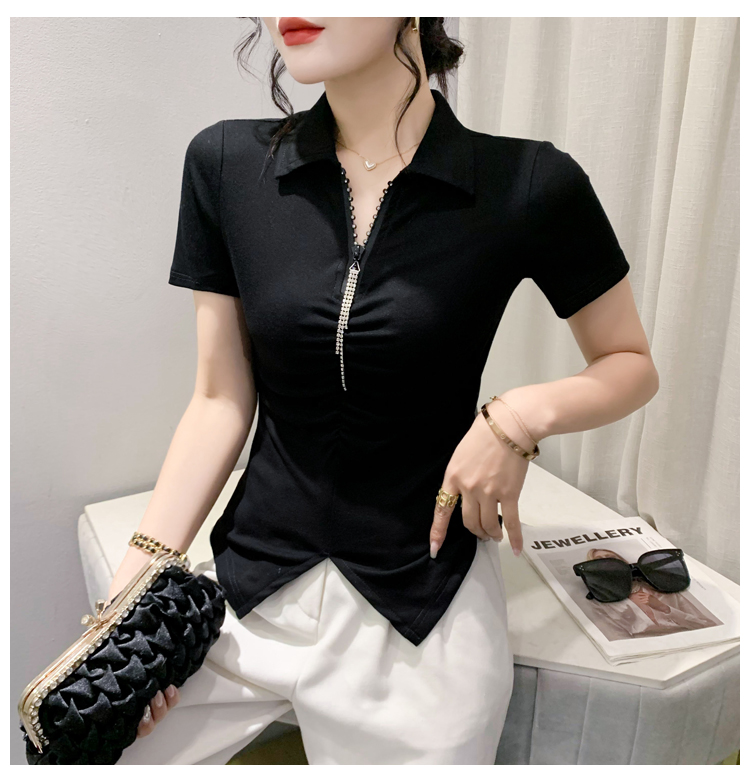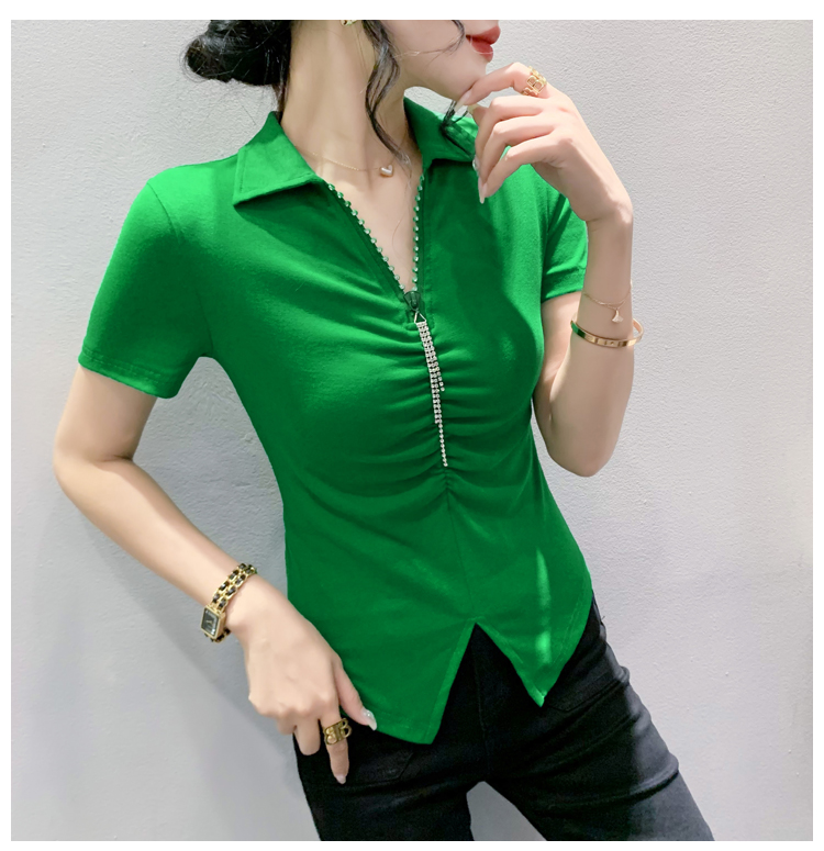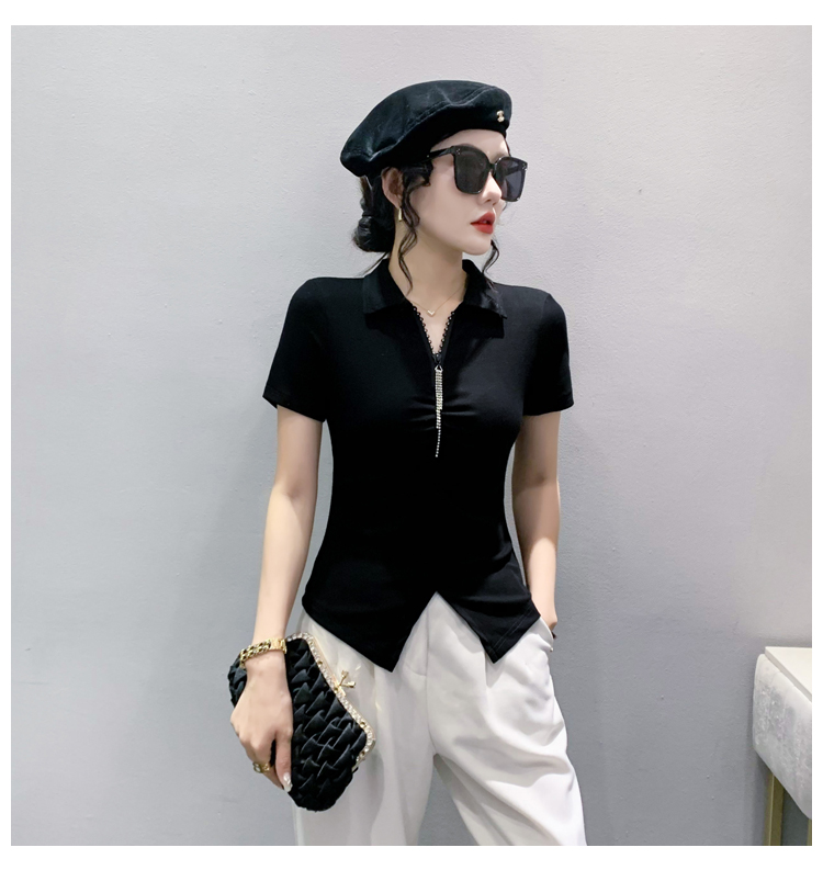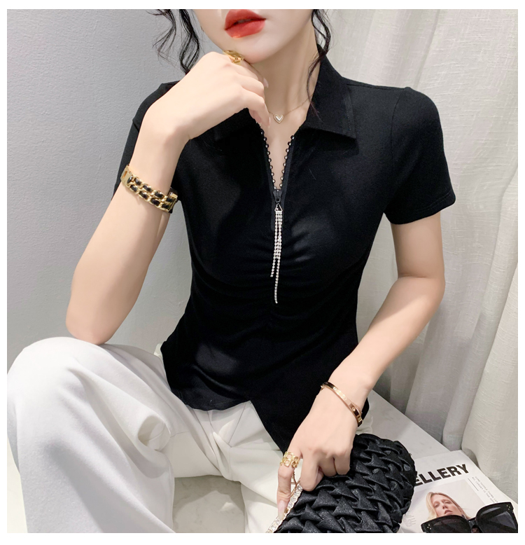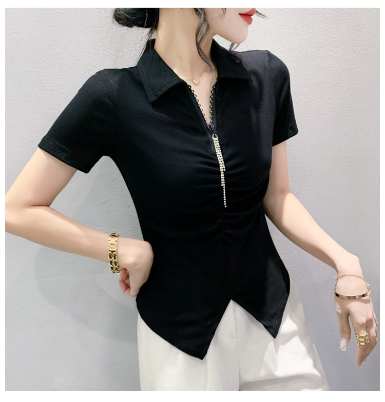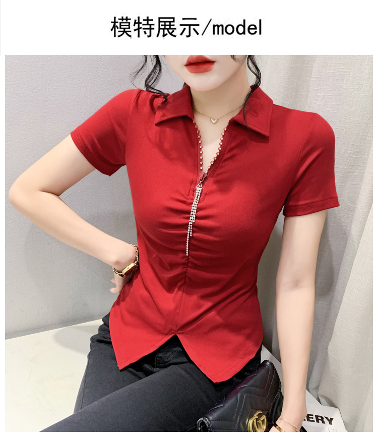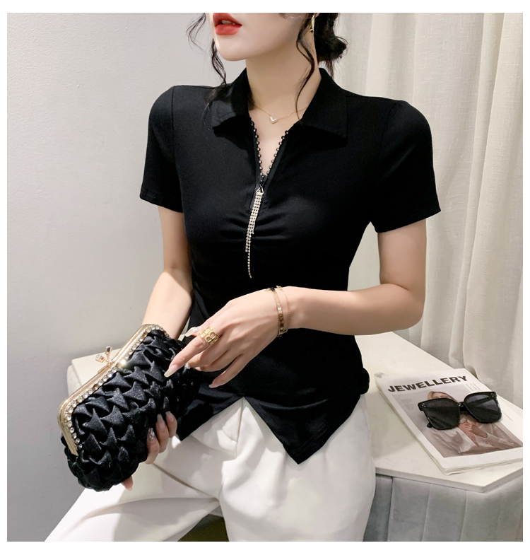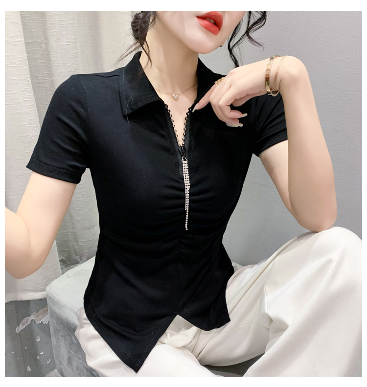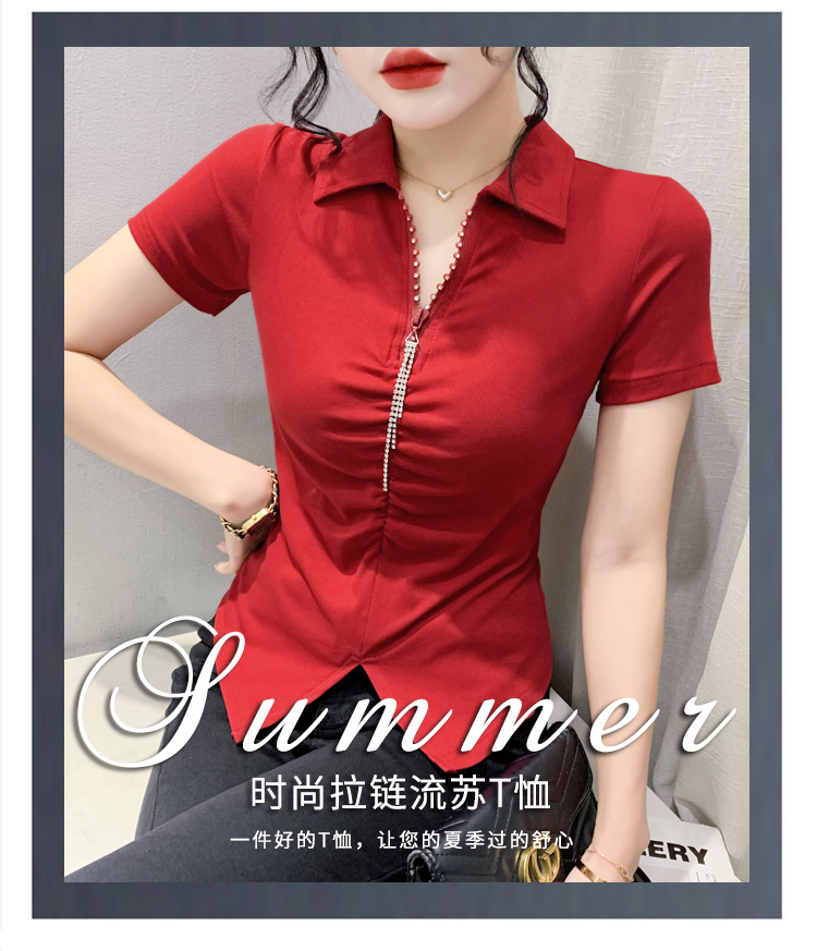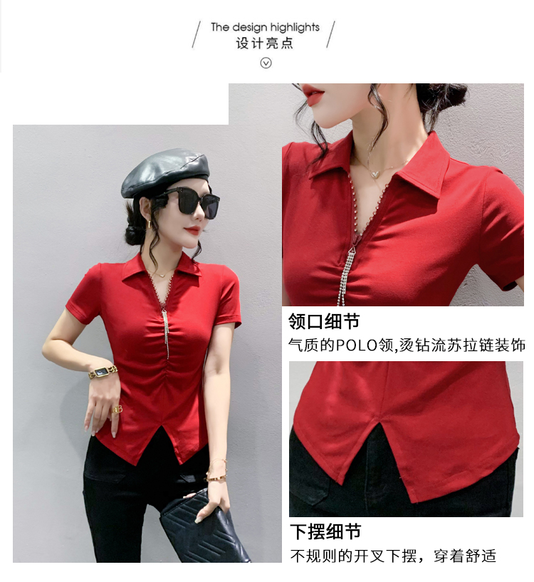 RY2180# 夏季新款洋气女装时尚镶钻拉链开叉短袖TPOLO领潮辣妹修身上衣