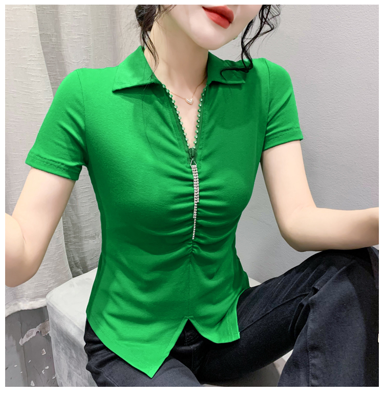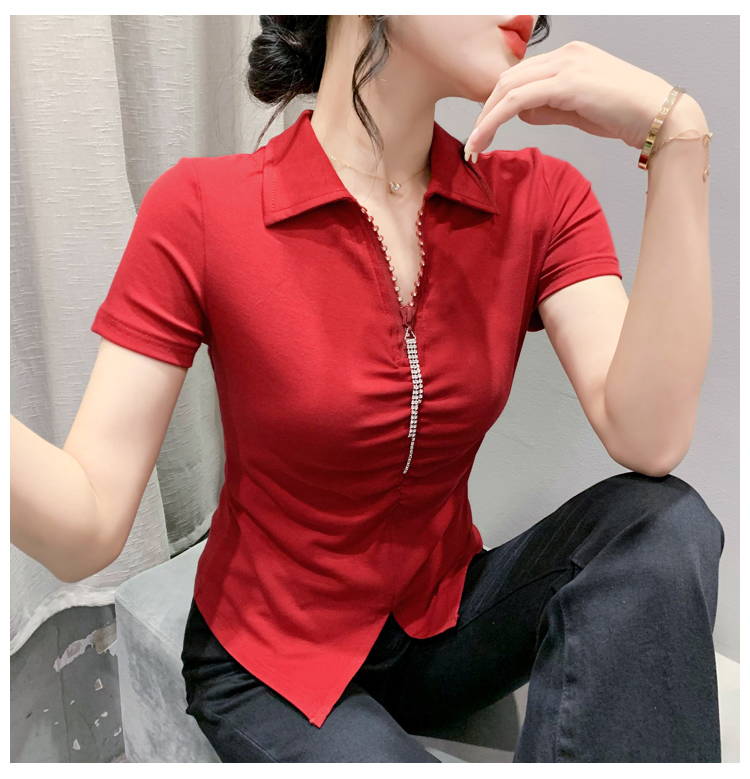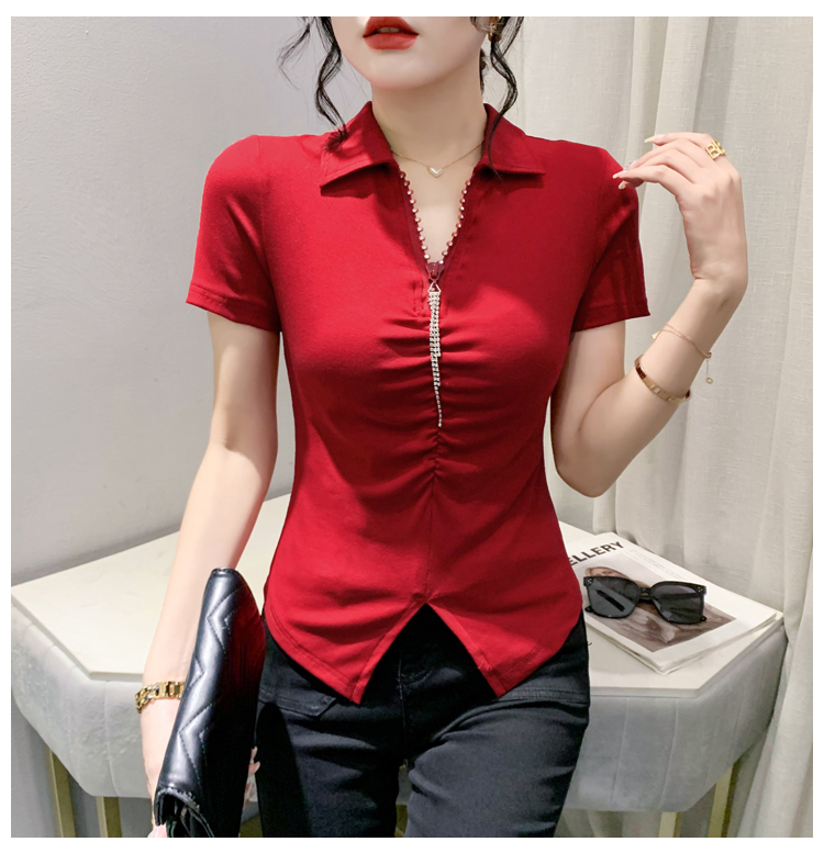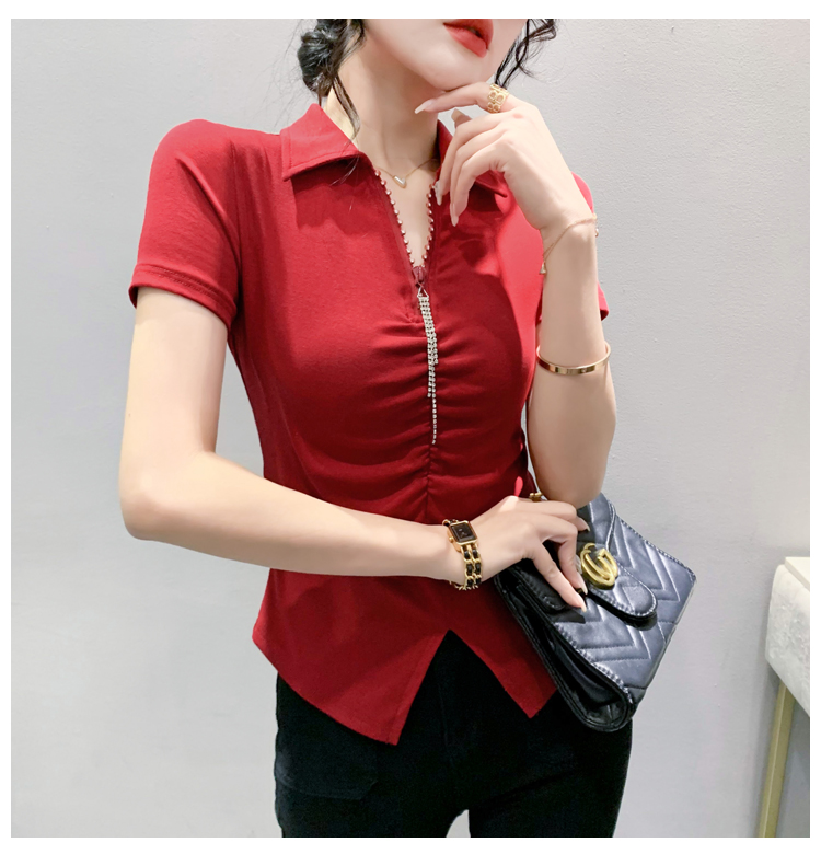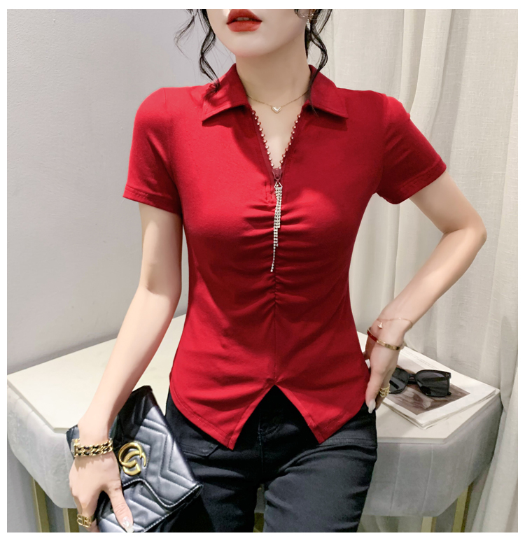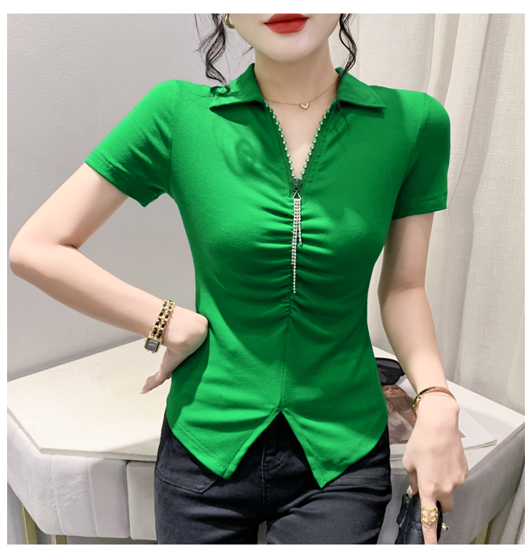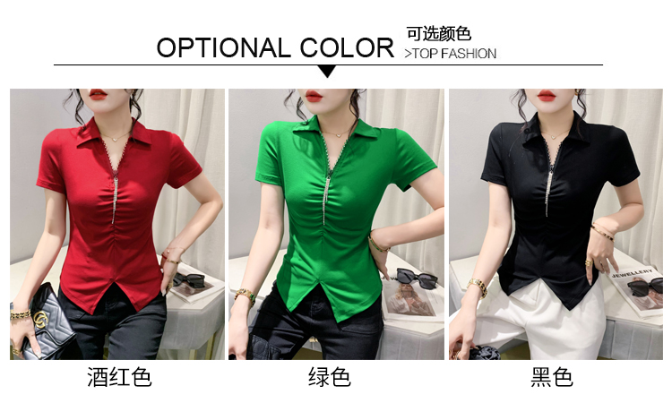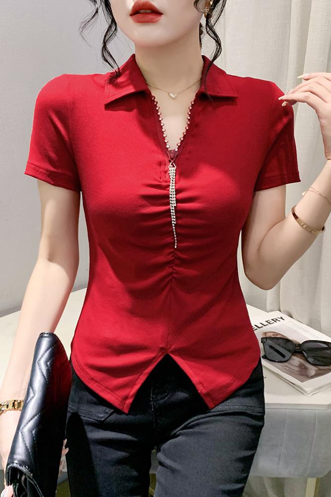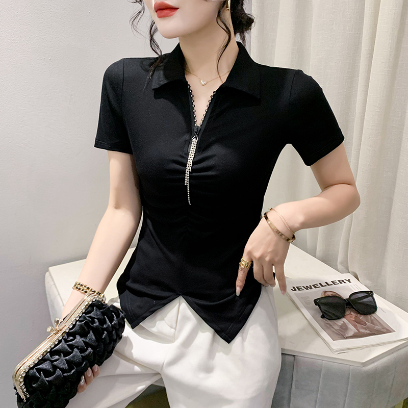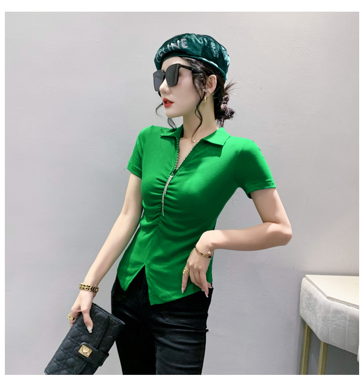 RY2180# 夏季新款洋气女装时尚镶钻拉链开叉短袖TPOLO领潮辣妹修身上衣