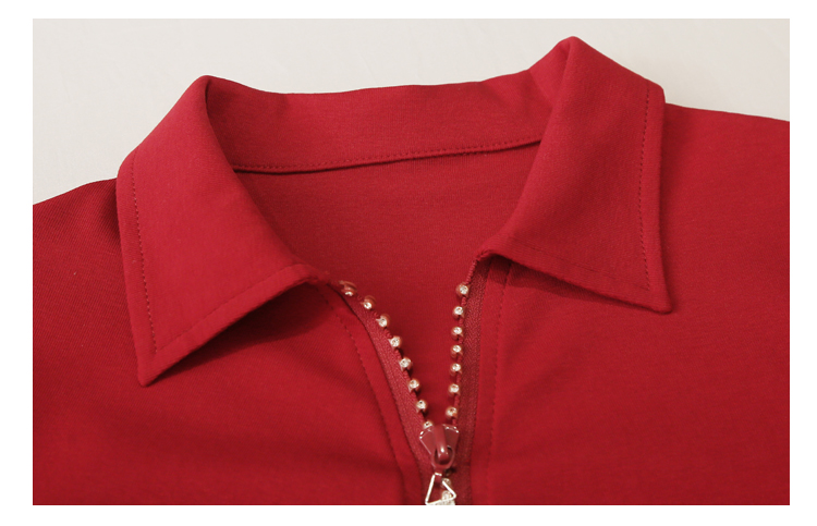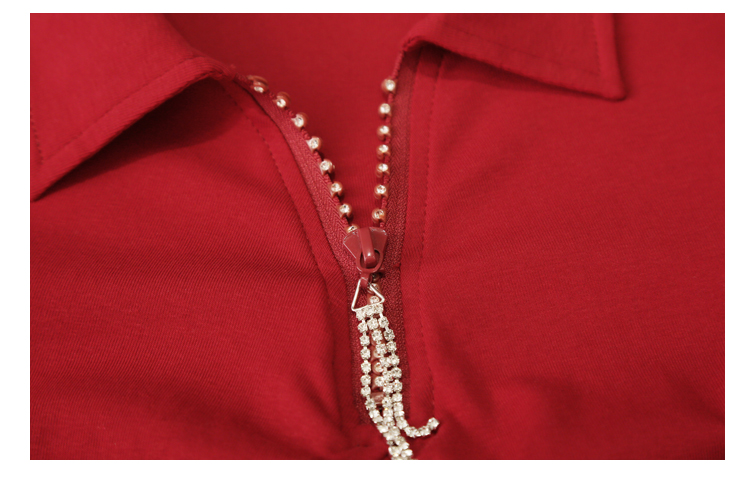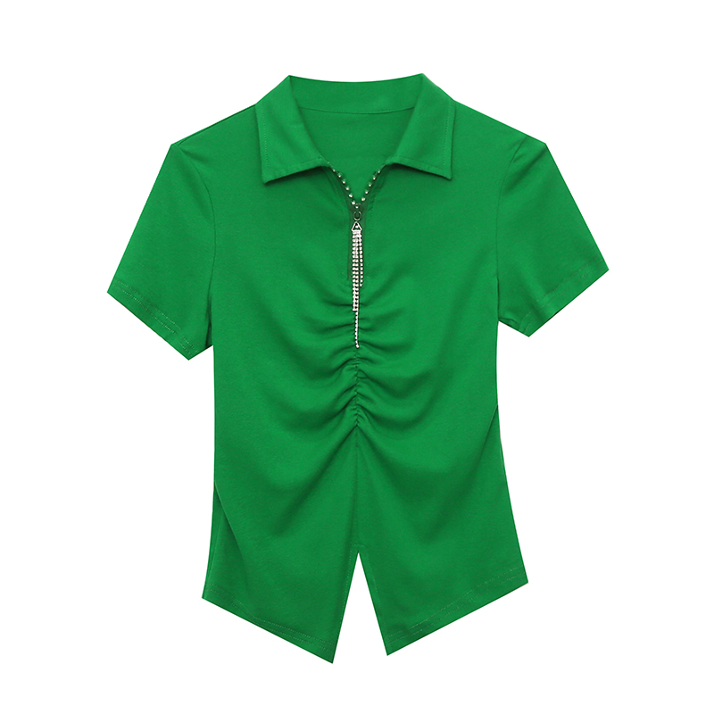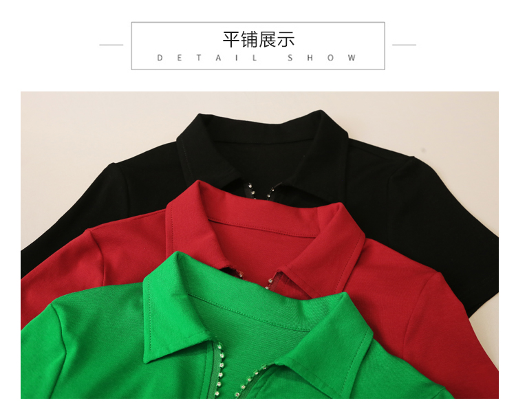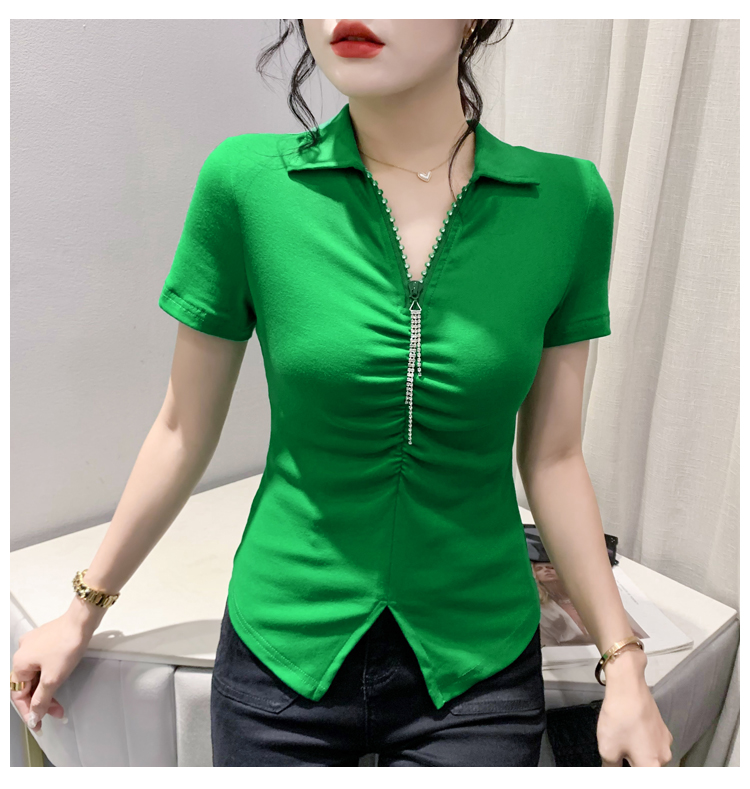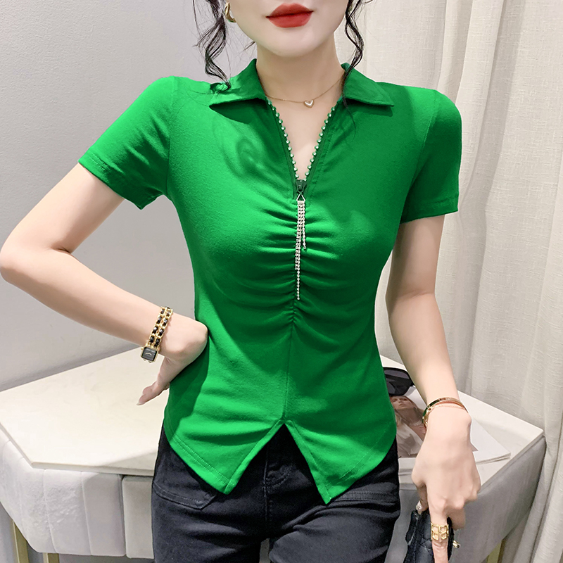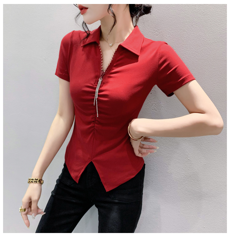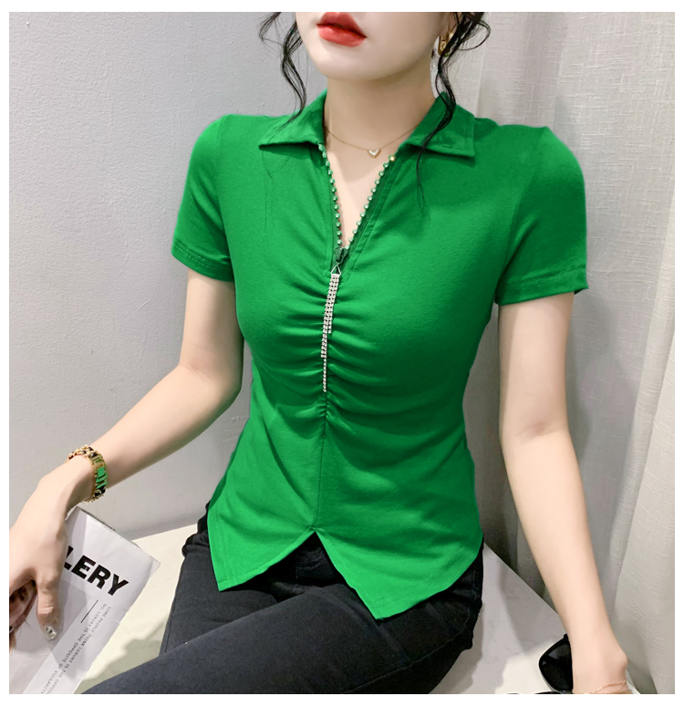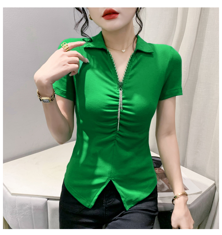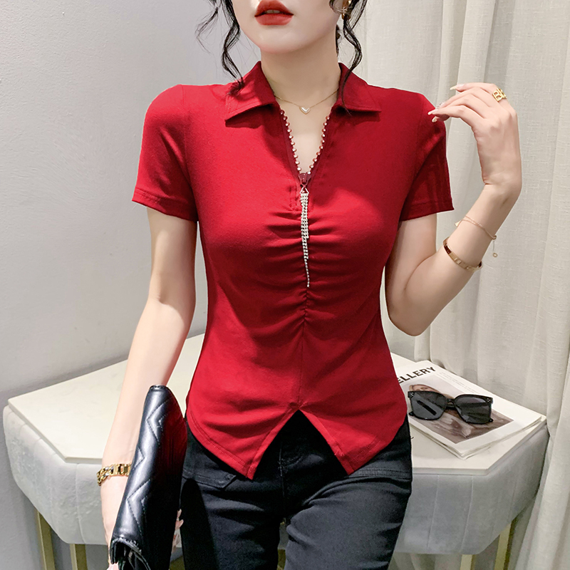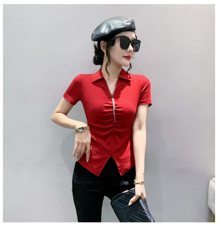 RY2180# 夏季新款洋气女装时尚镶钻拉链开叉短袖TPOLO领潮辣妹修身上衣