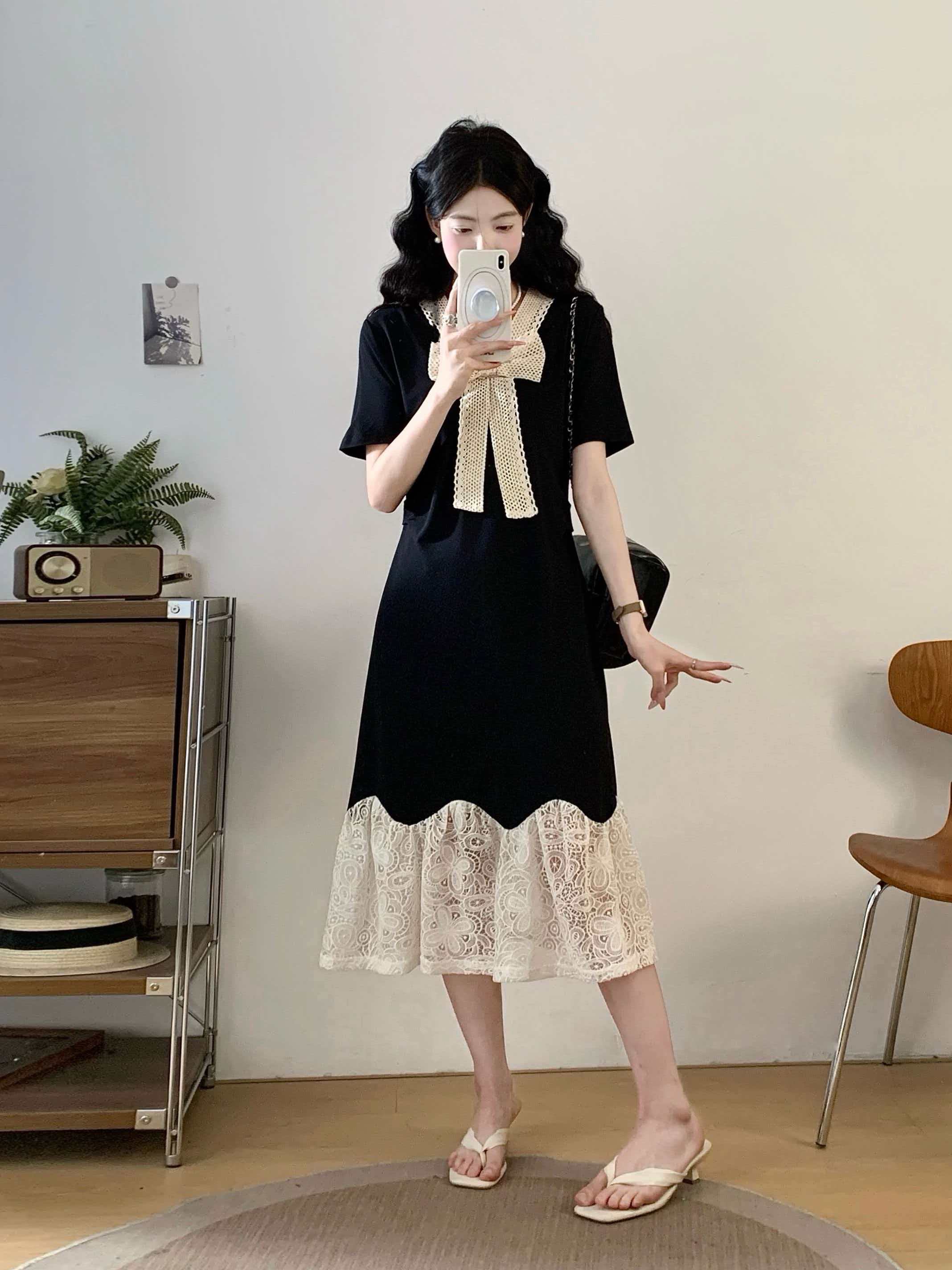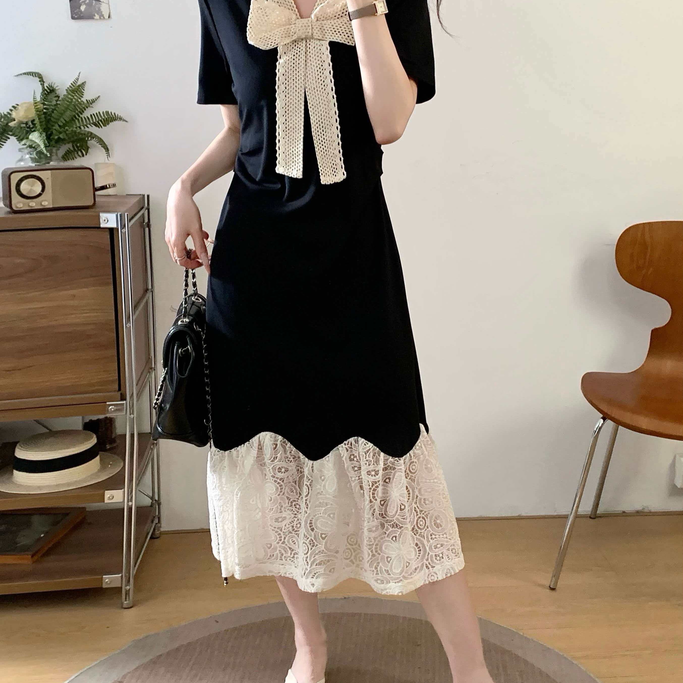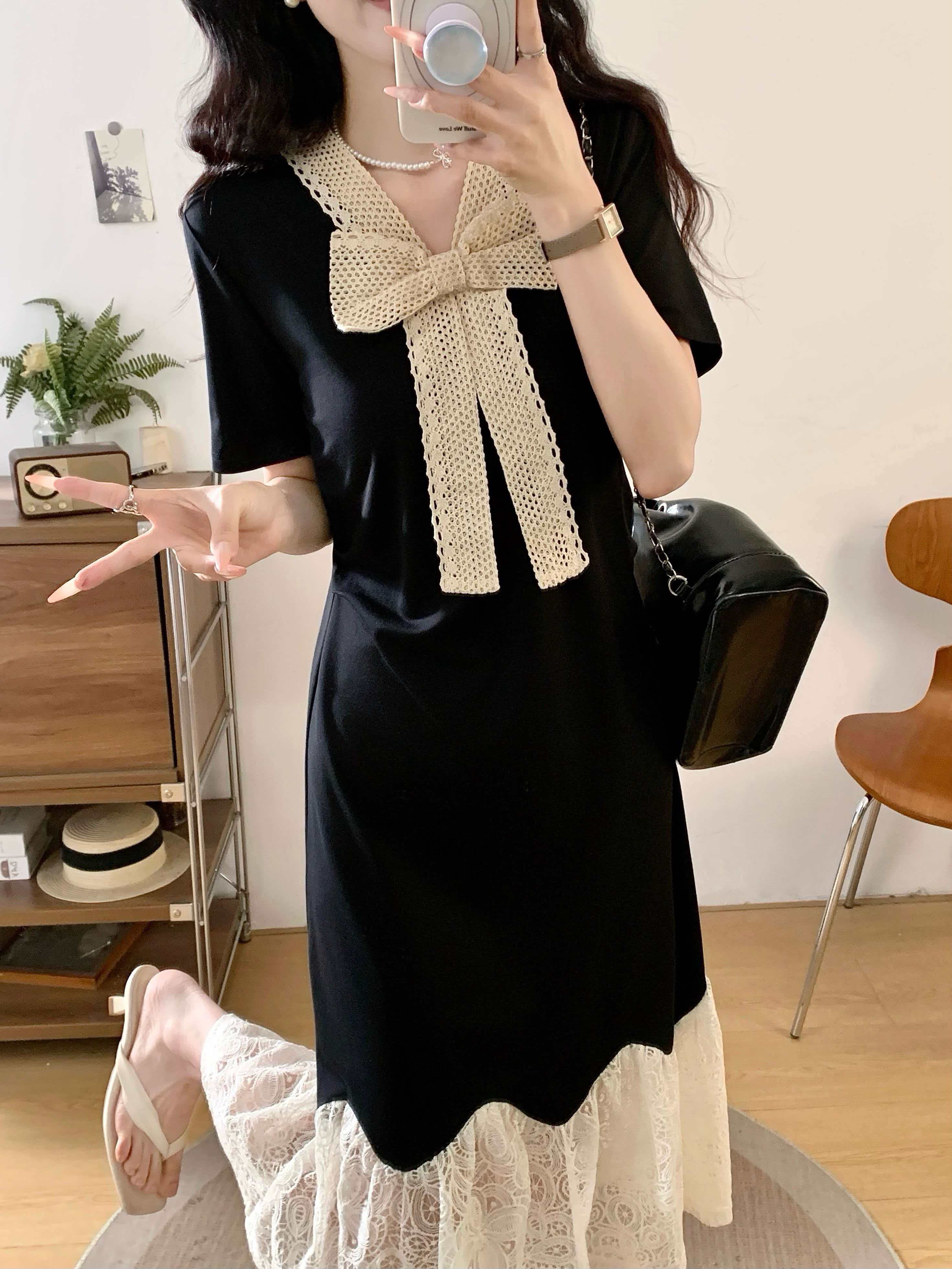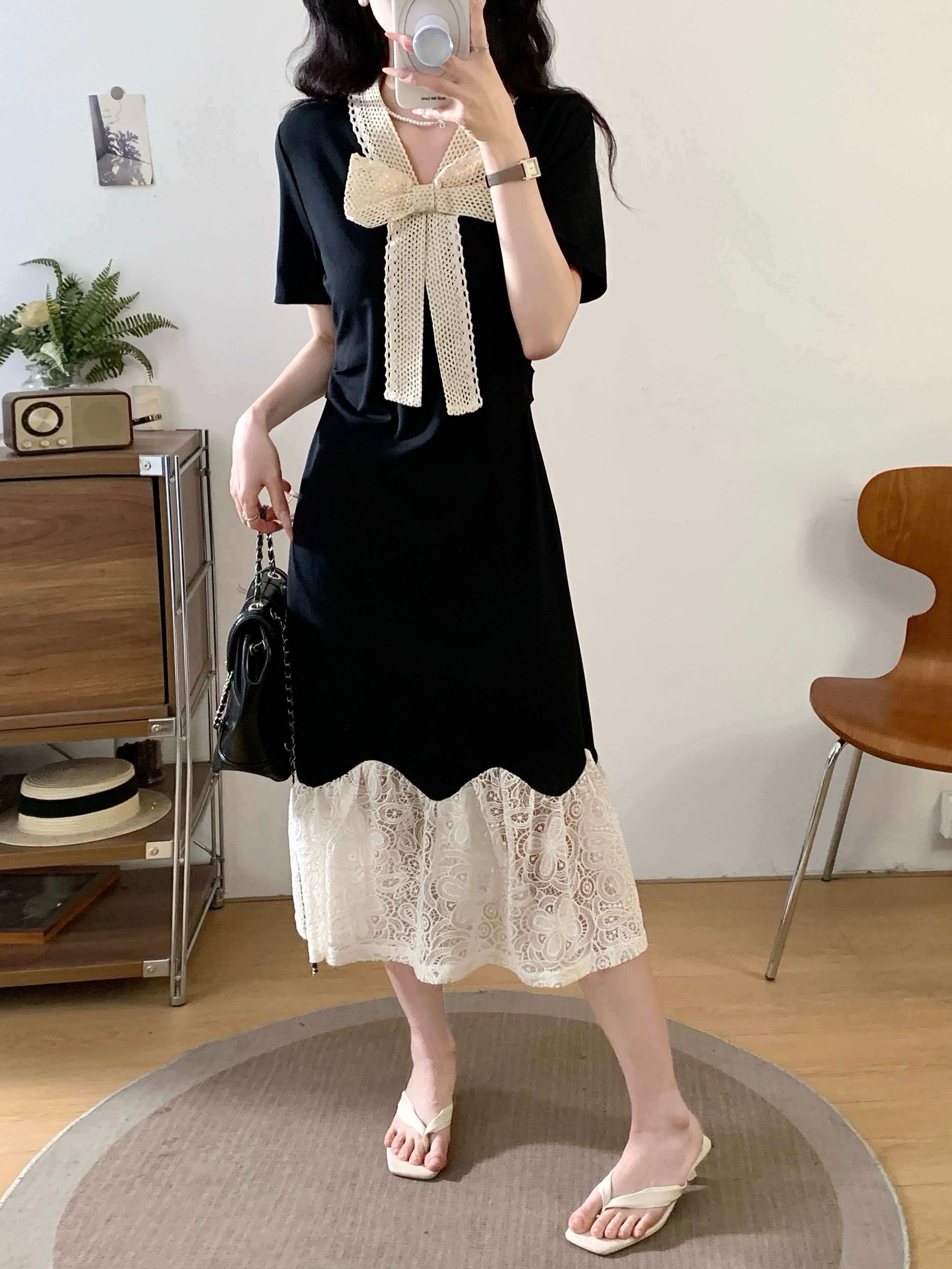 RY2190# 实拍 大码公主风刺绣中长裙拼接连衣裙系带蕾丝蝴蝶结V领显瘦裙子