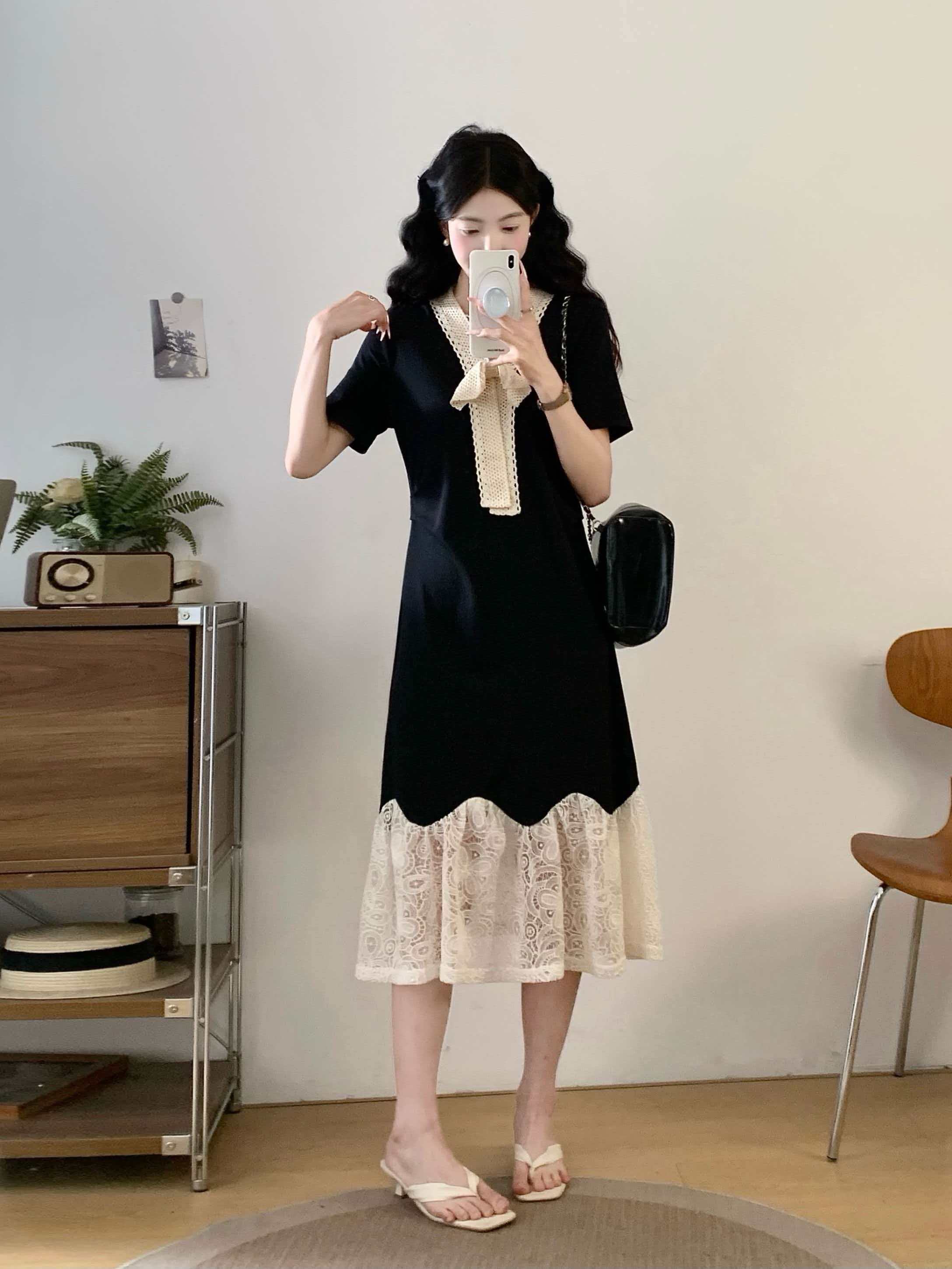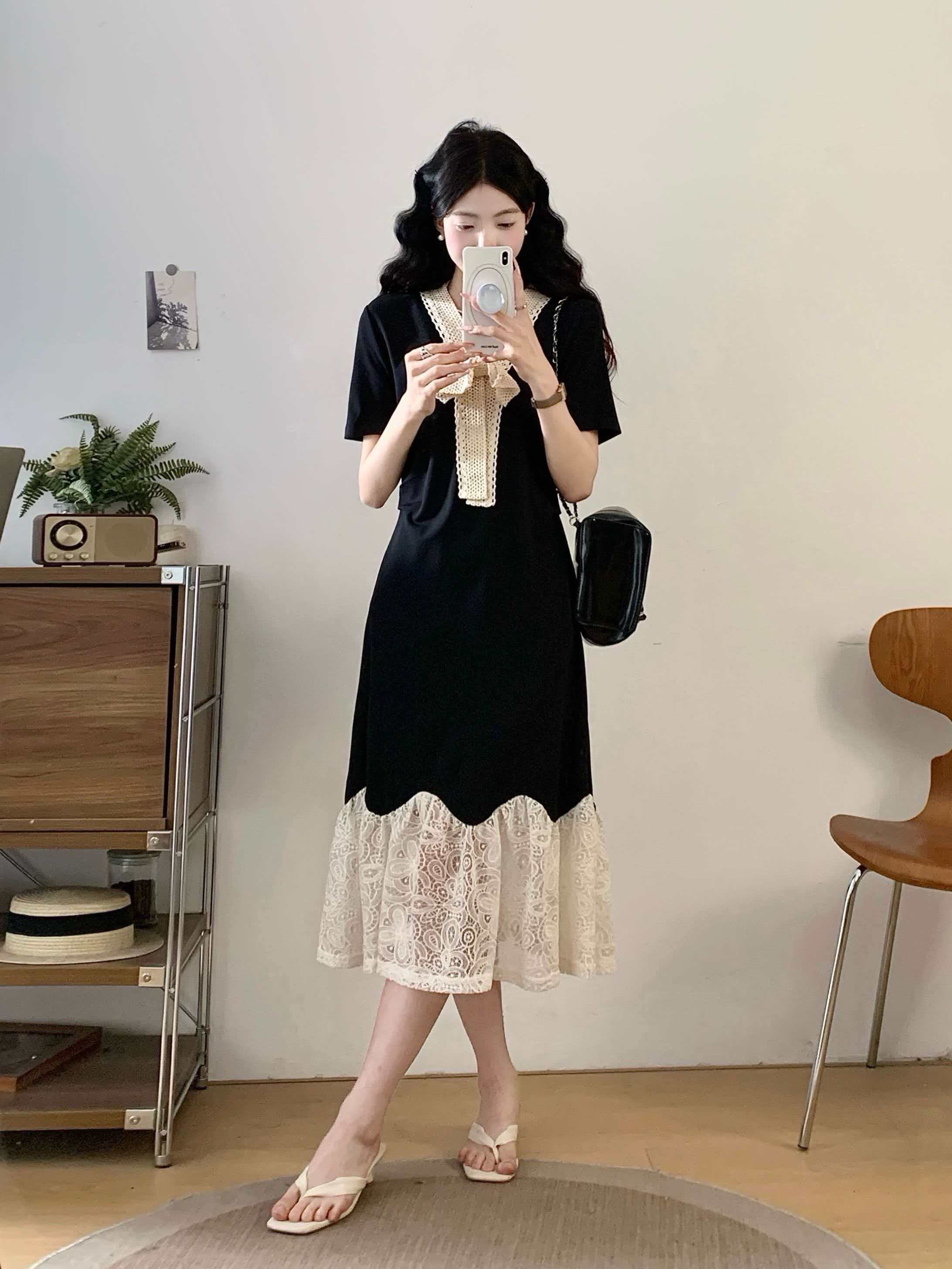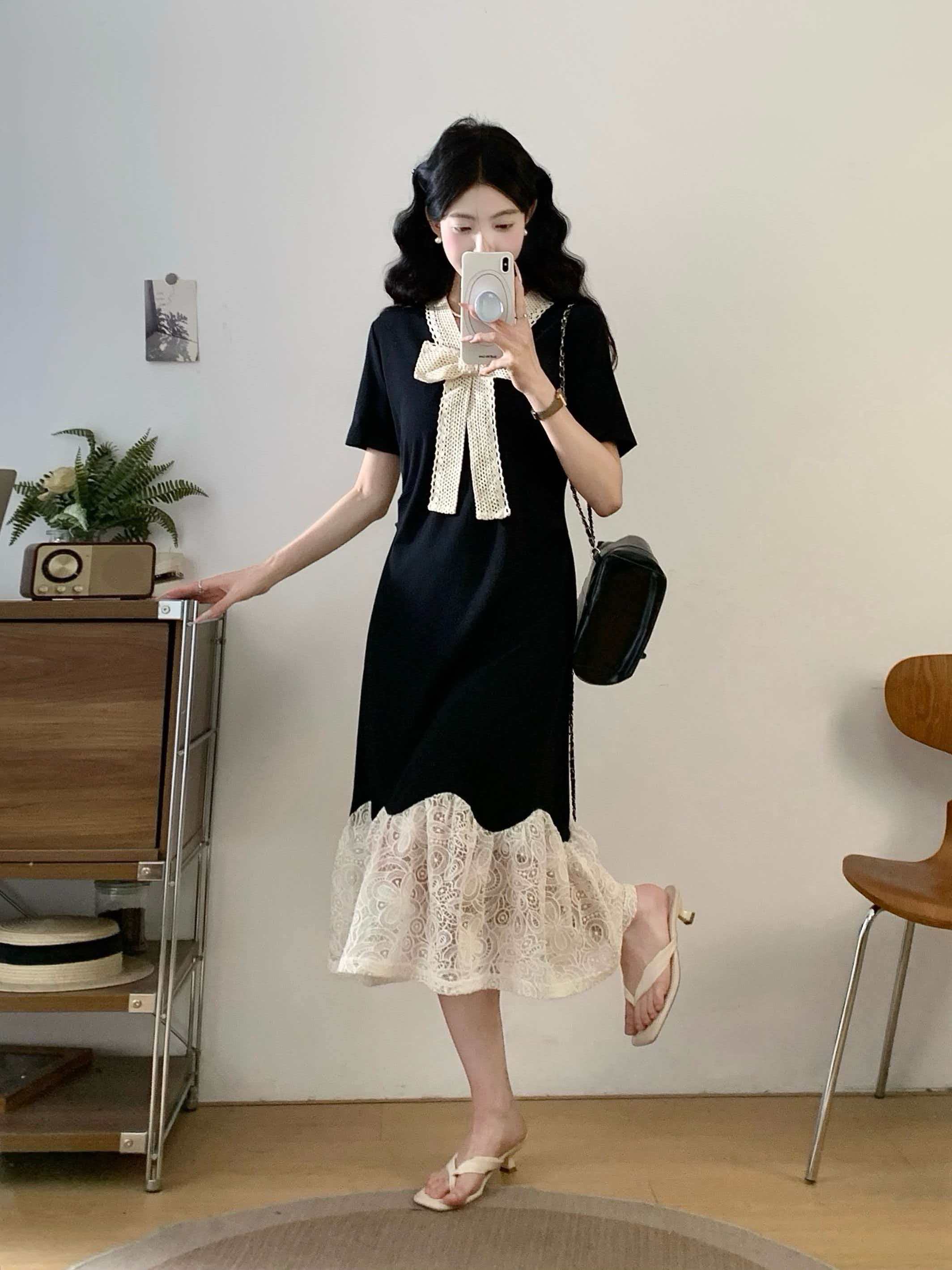 RY2190# 实拍 大码公主风刺绣中长裙拼接连衣裙系带蕾丝蝴蝶结V领显瘦裙子
