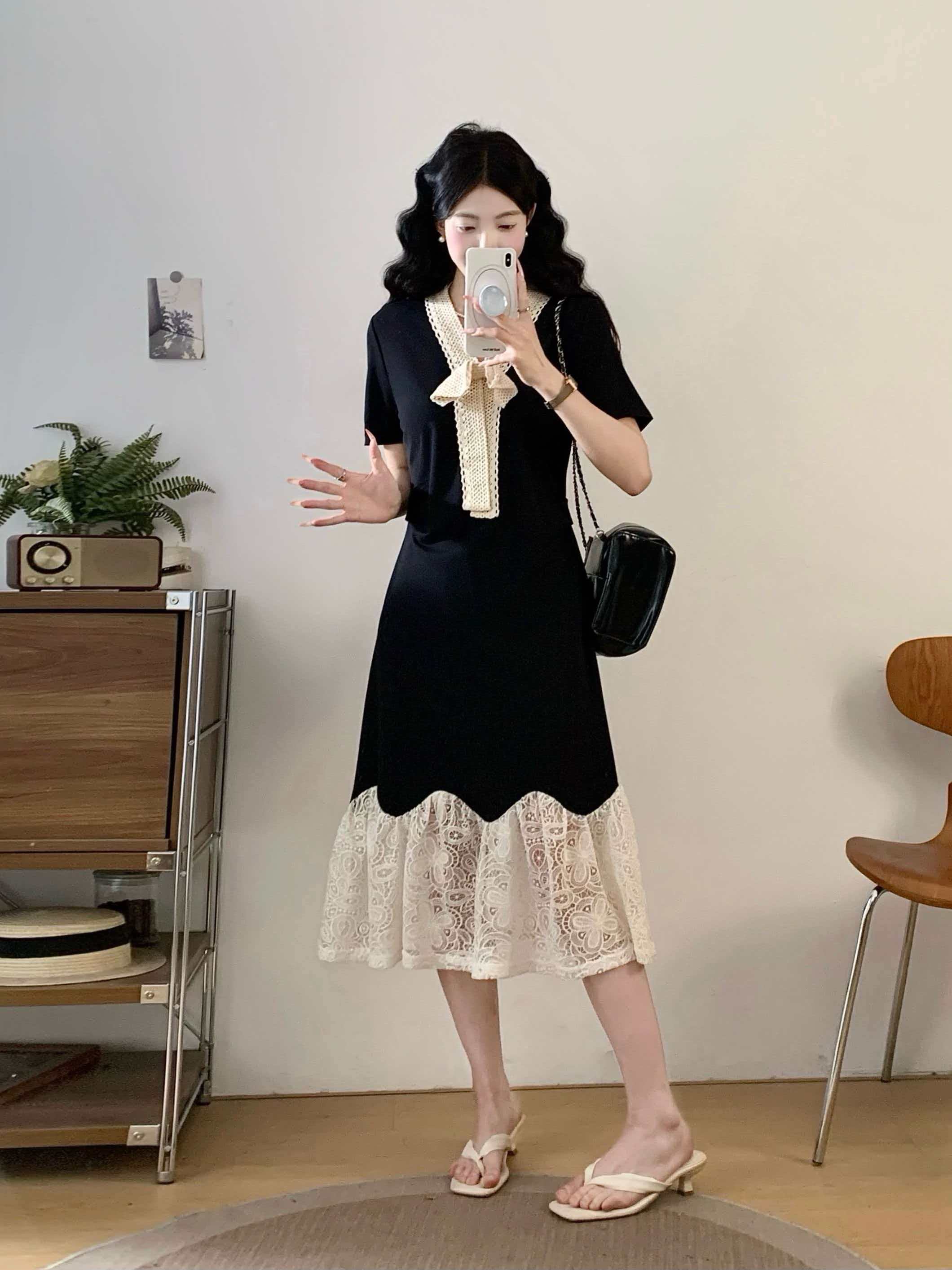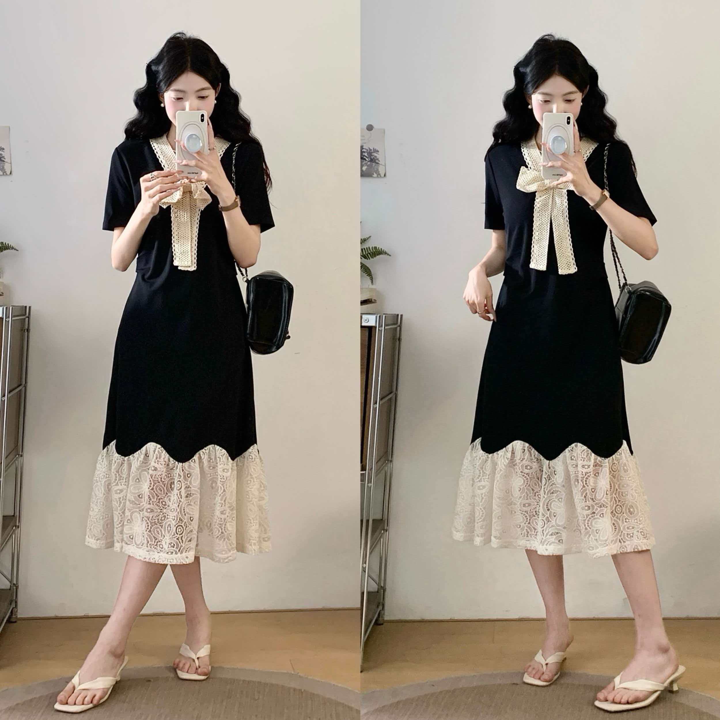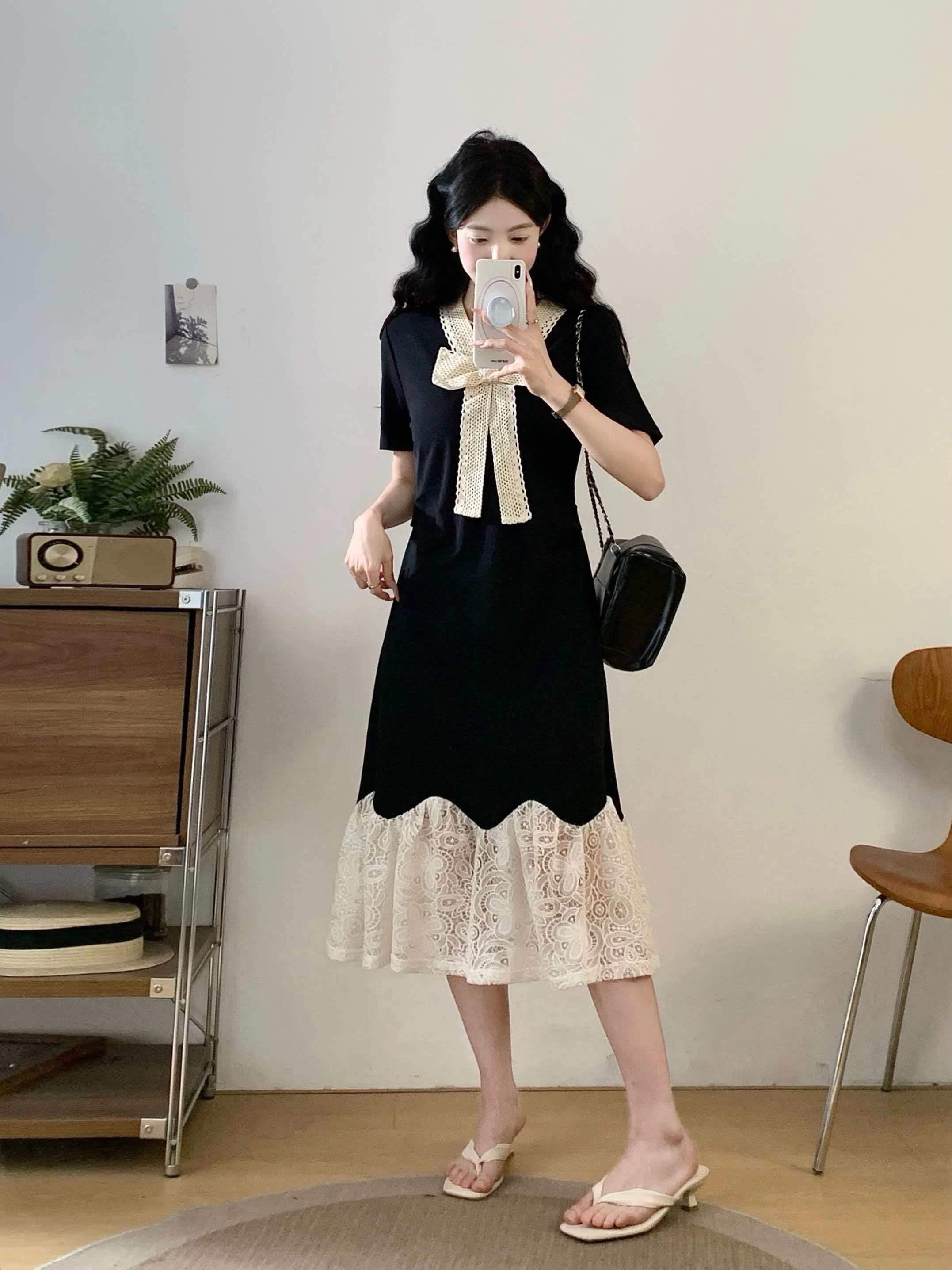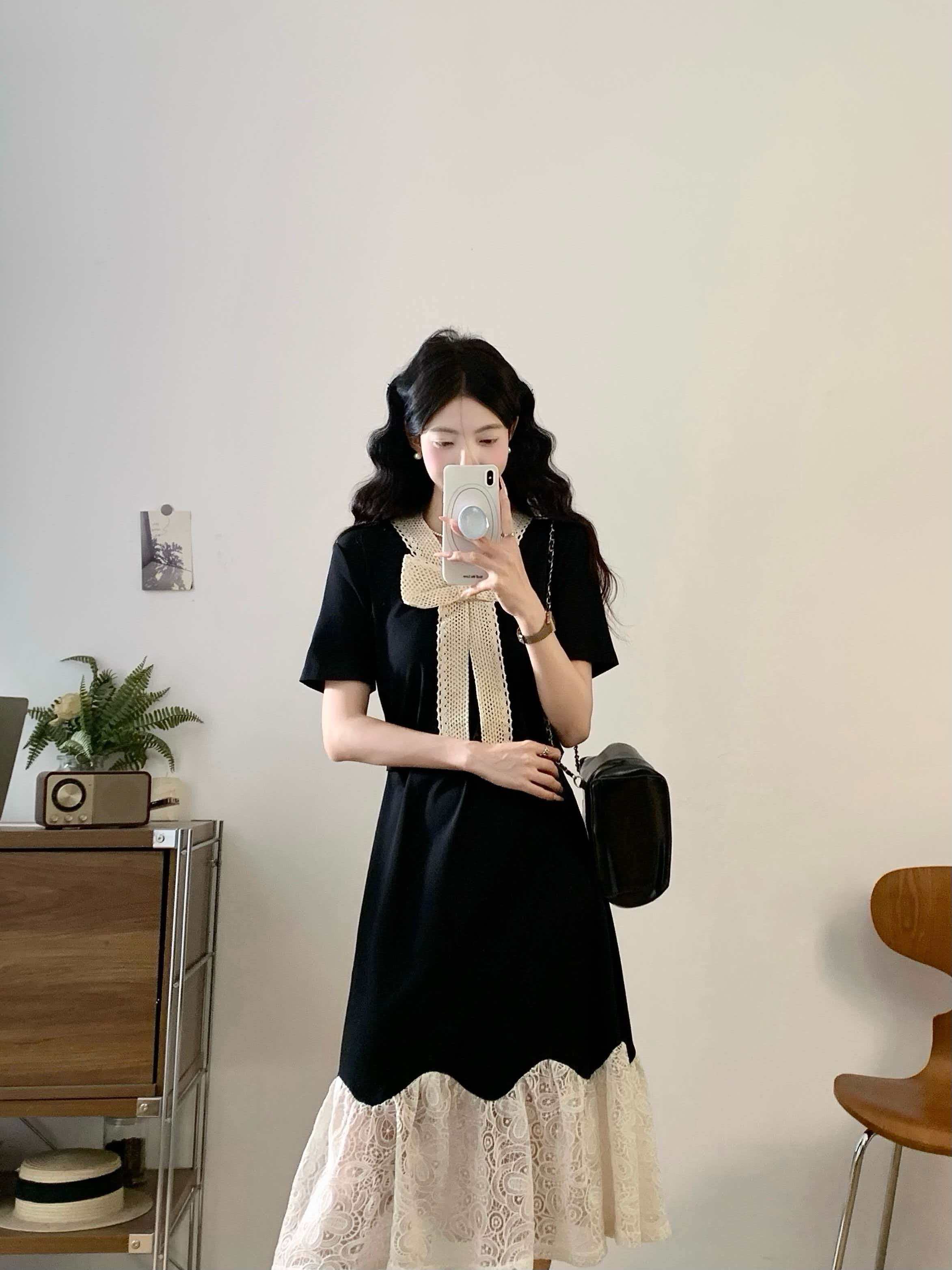 RY2190# 实拍 大码公主风刺绣中长裙拼接连衣裙系带蕾丝蝴蝶结V领显瘦裙子