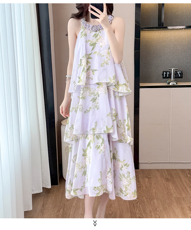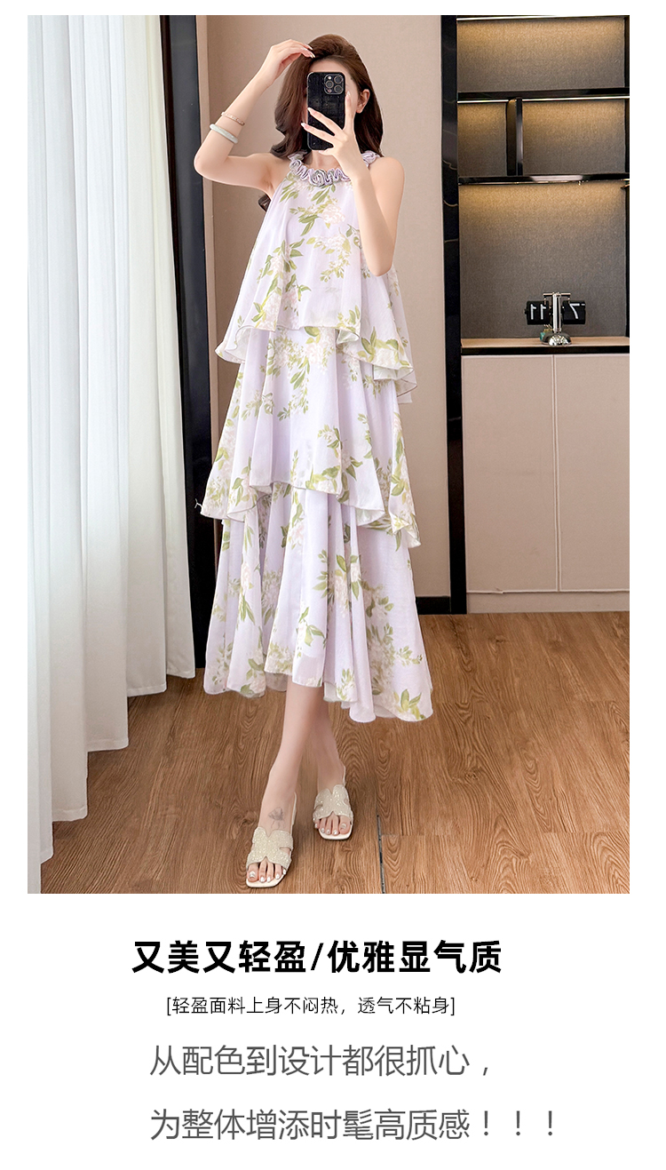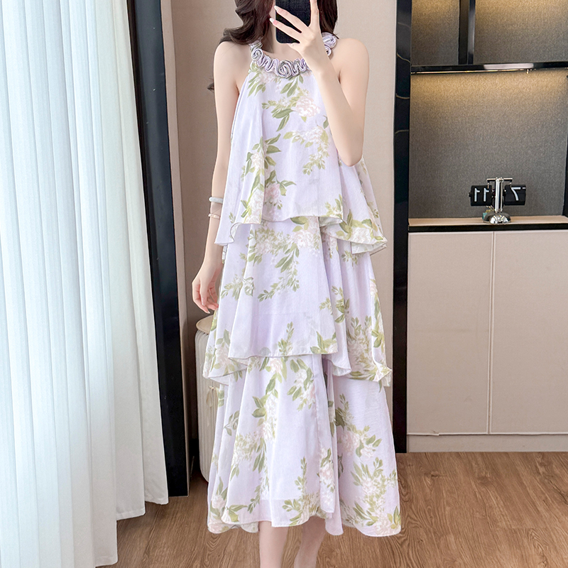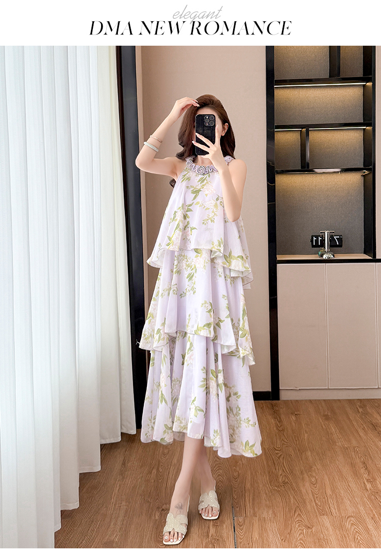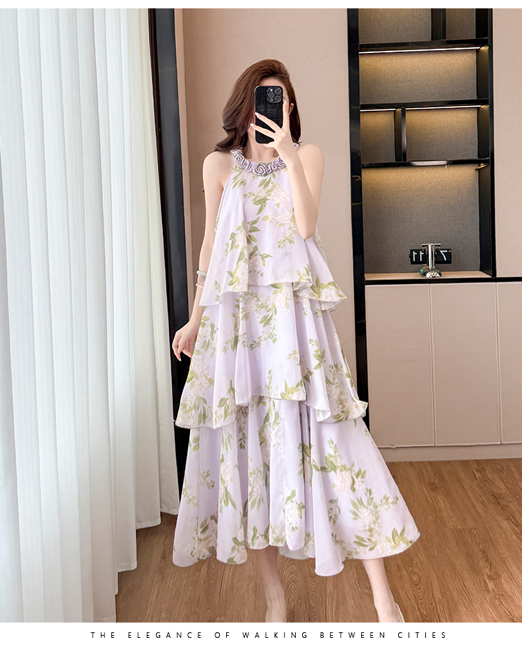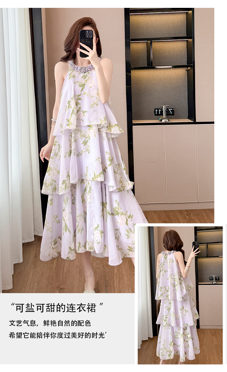 RY2202# 法式紫色碎花挂脖蛋糕裙女夏季度假风设计感小众中长款无袖连衣裙