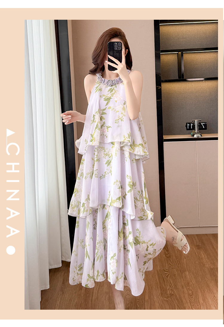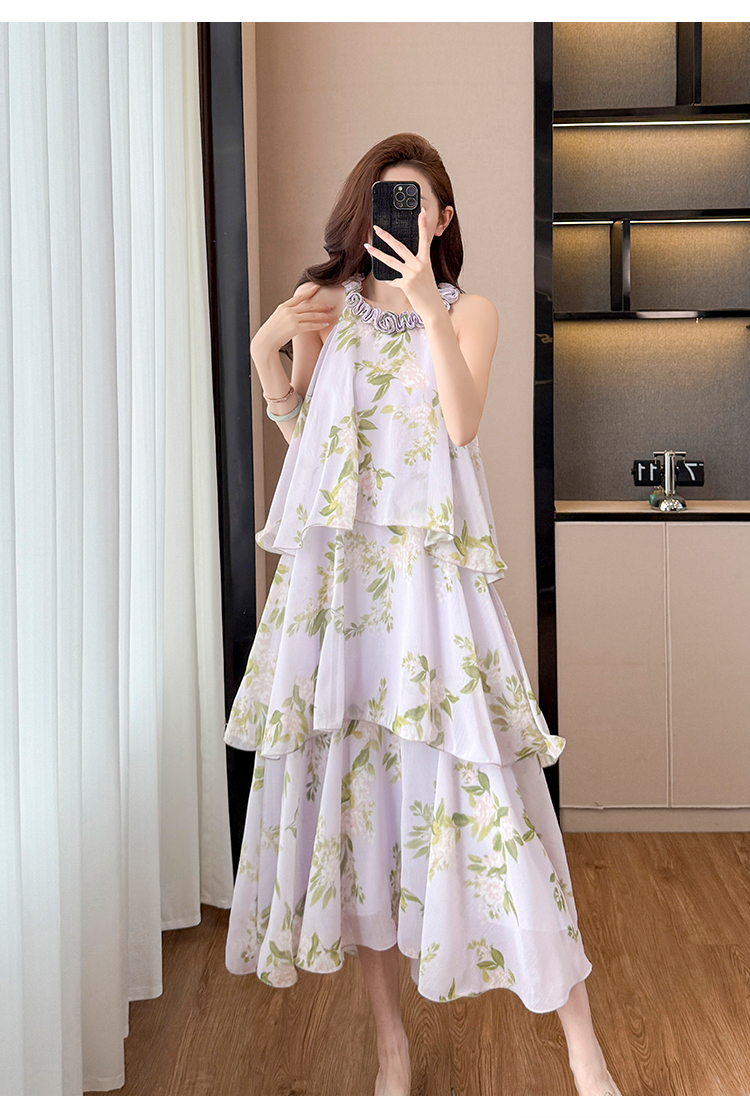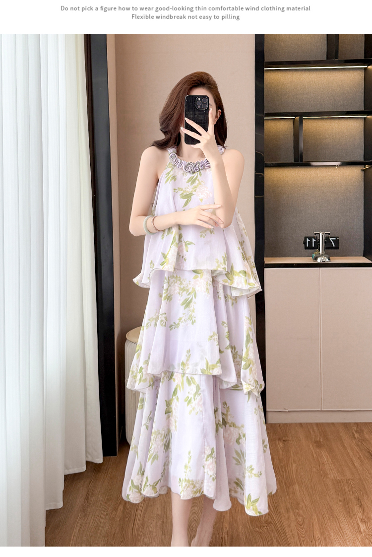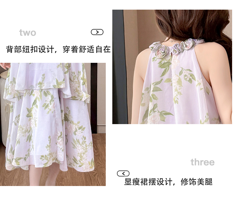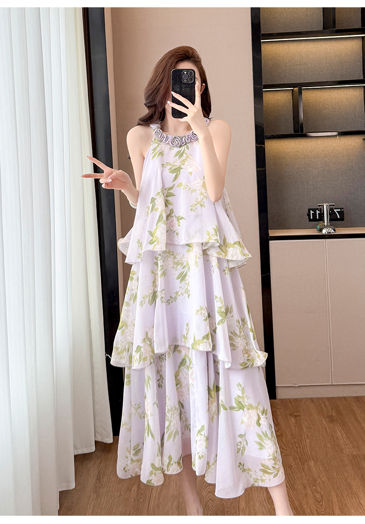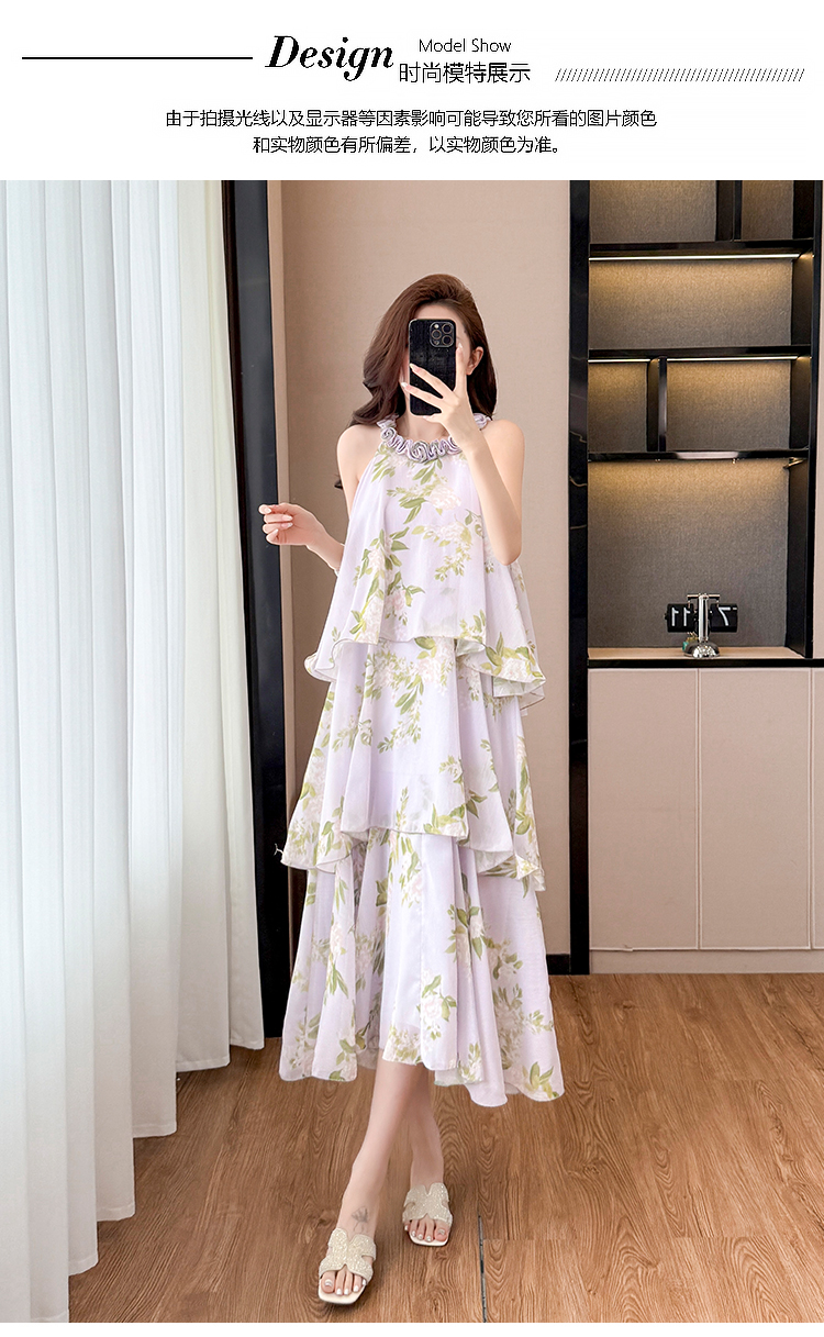 RY2202# 法式紫色碎花挂脖蛋糕裙女夏季度假风设计感小众中长款无袖连衣裙