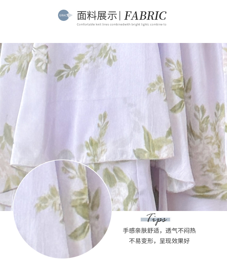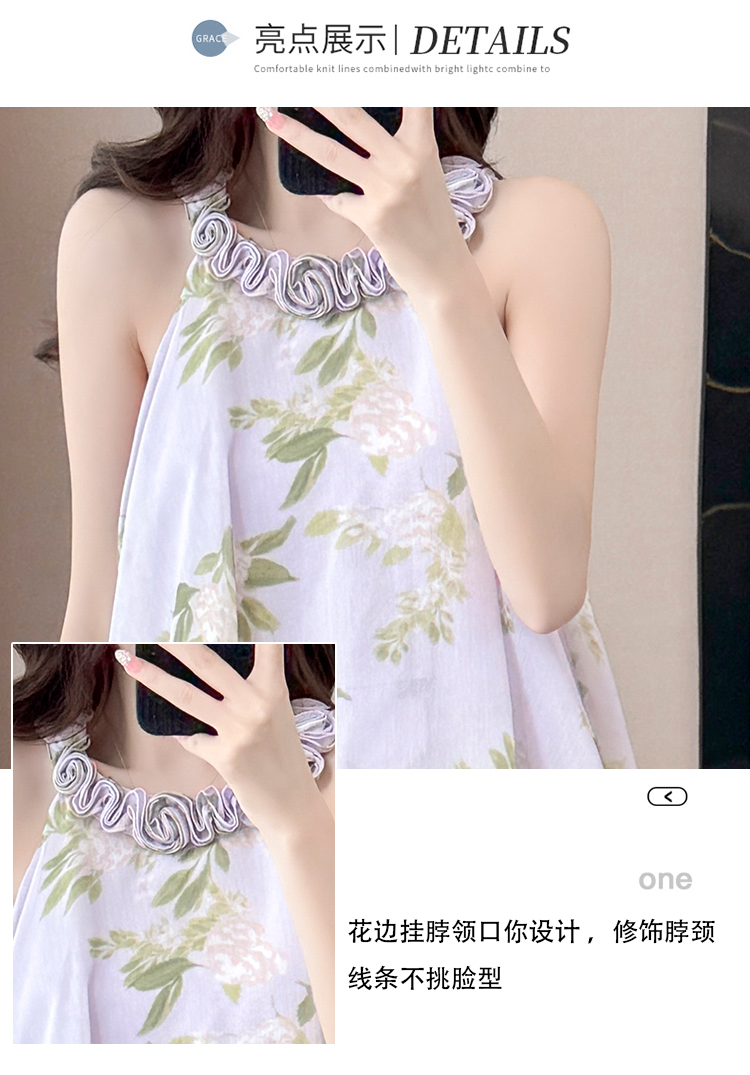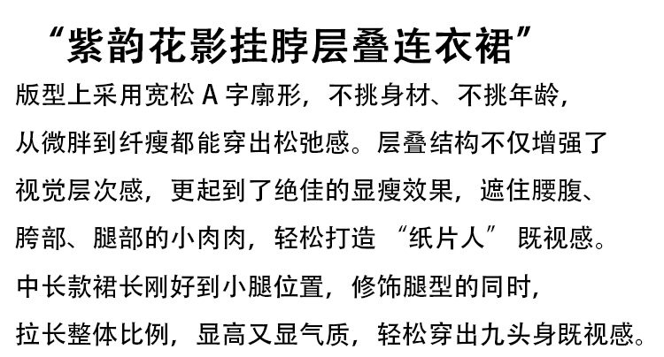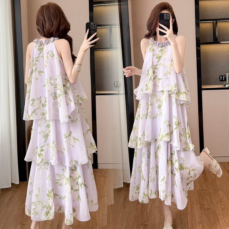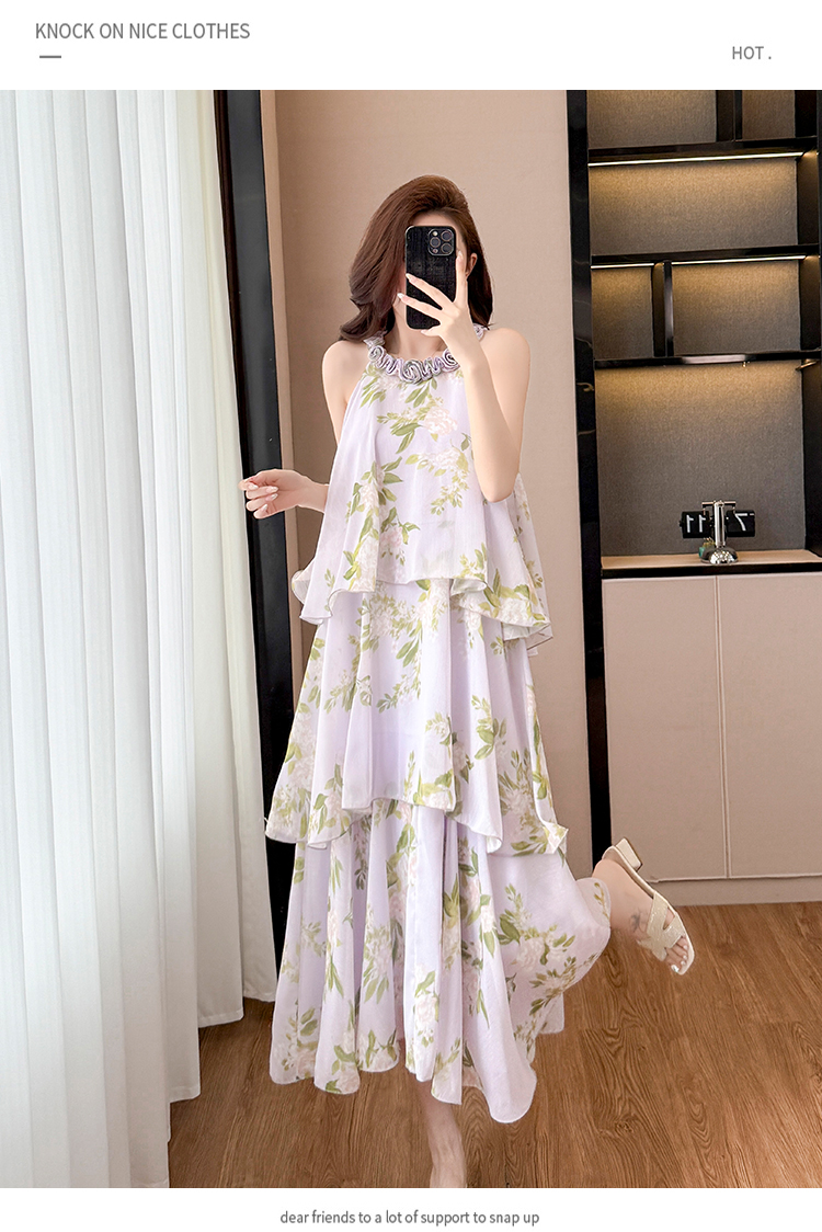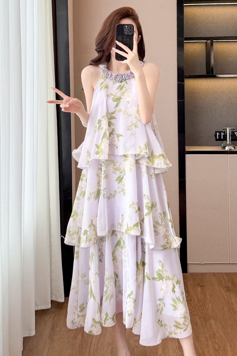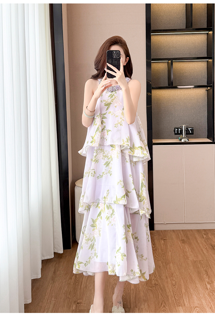 RY2202# 法式紫色碎花挂脖蛋糕裙女夏季度假风设计感小众中长款无袖连衣裙