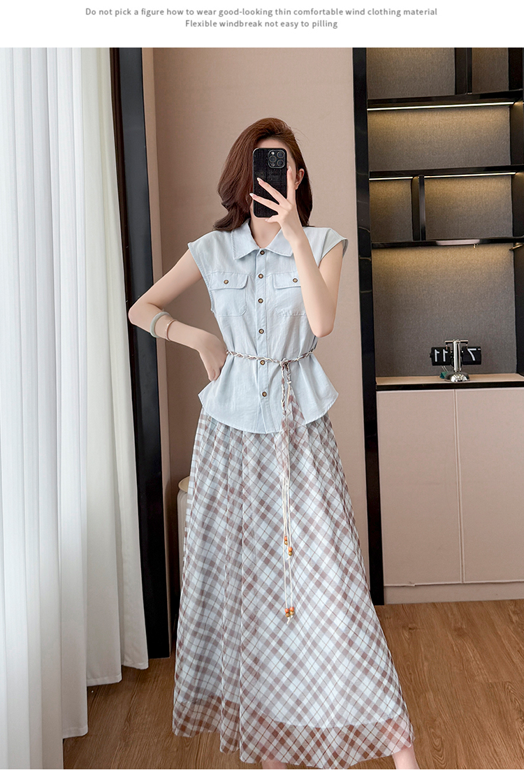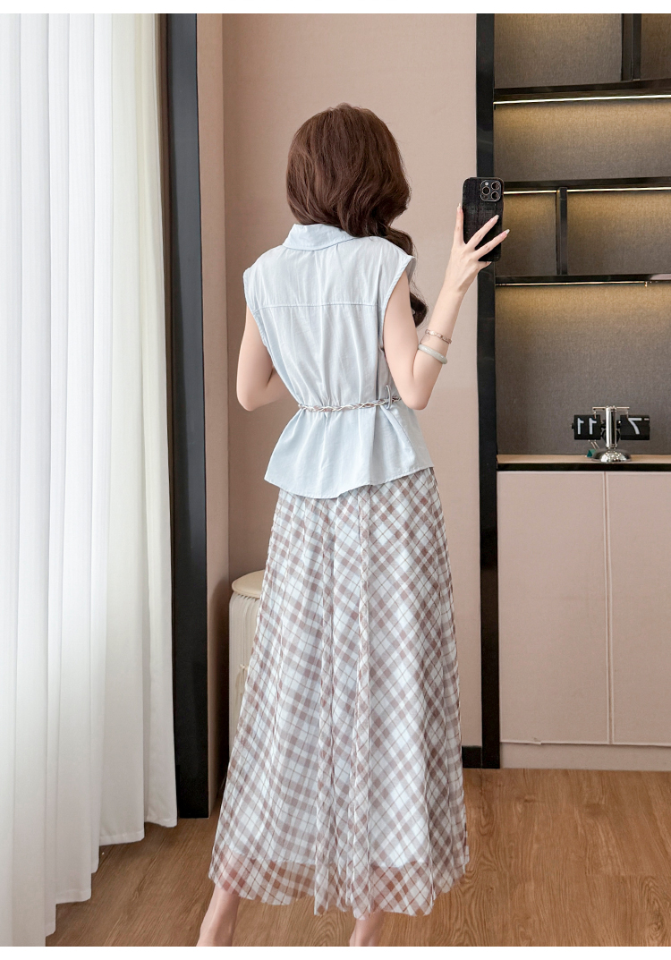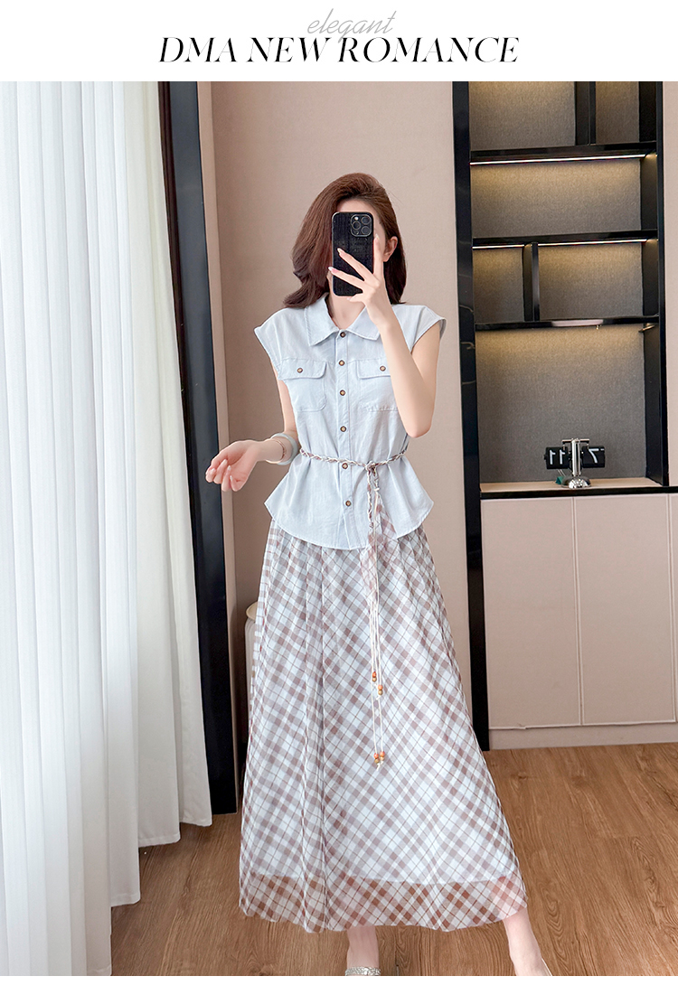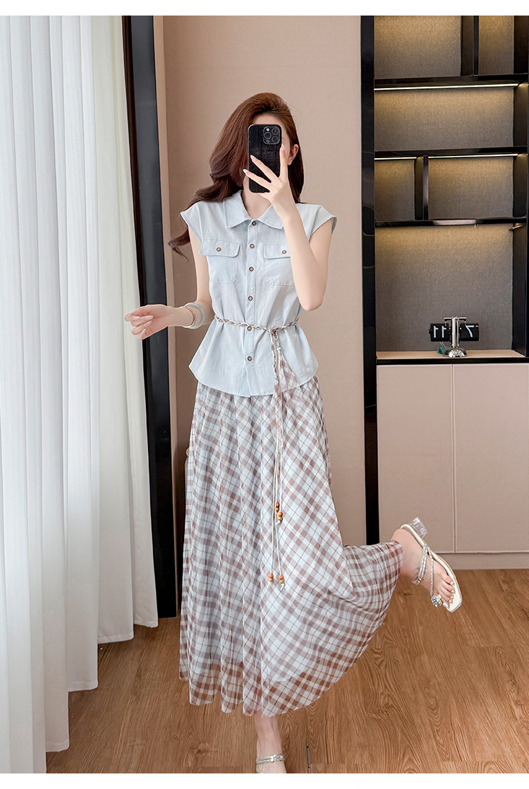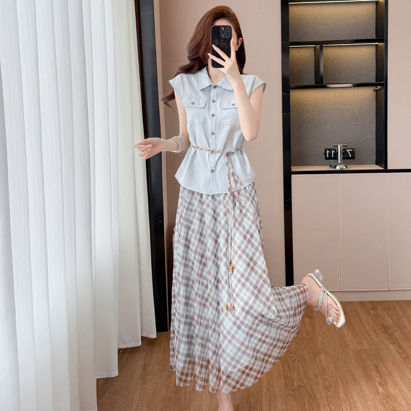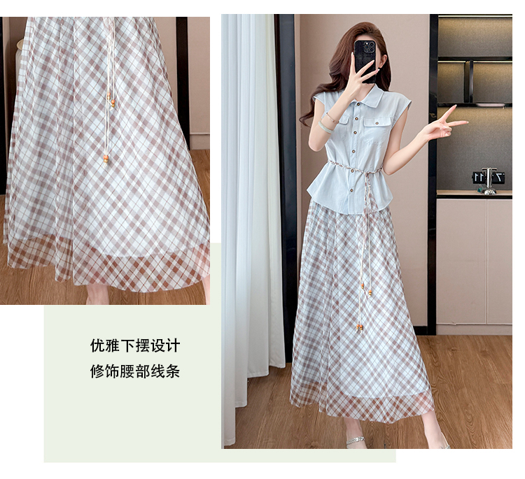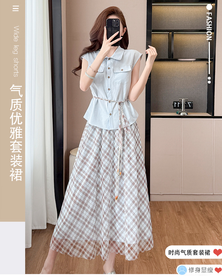 RY2203# 时尚休闲气质通勤套装夏季新款收腰显瘦无袖衬衫格纹半身裙两件套