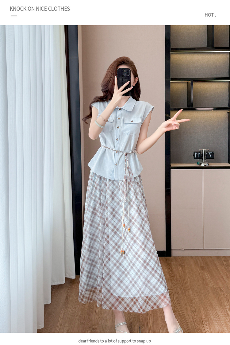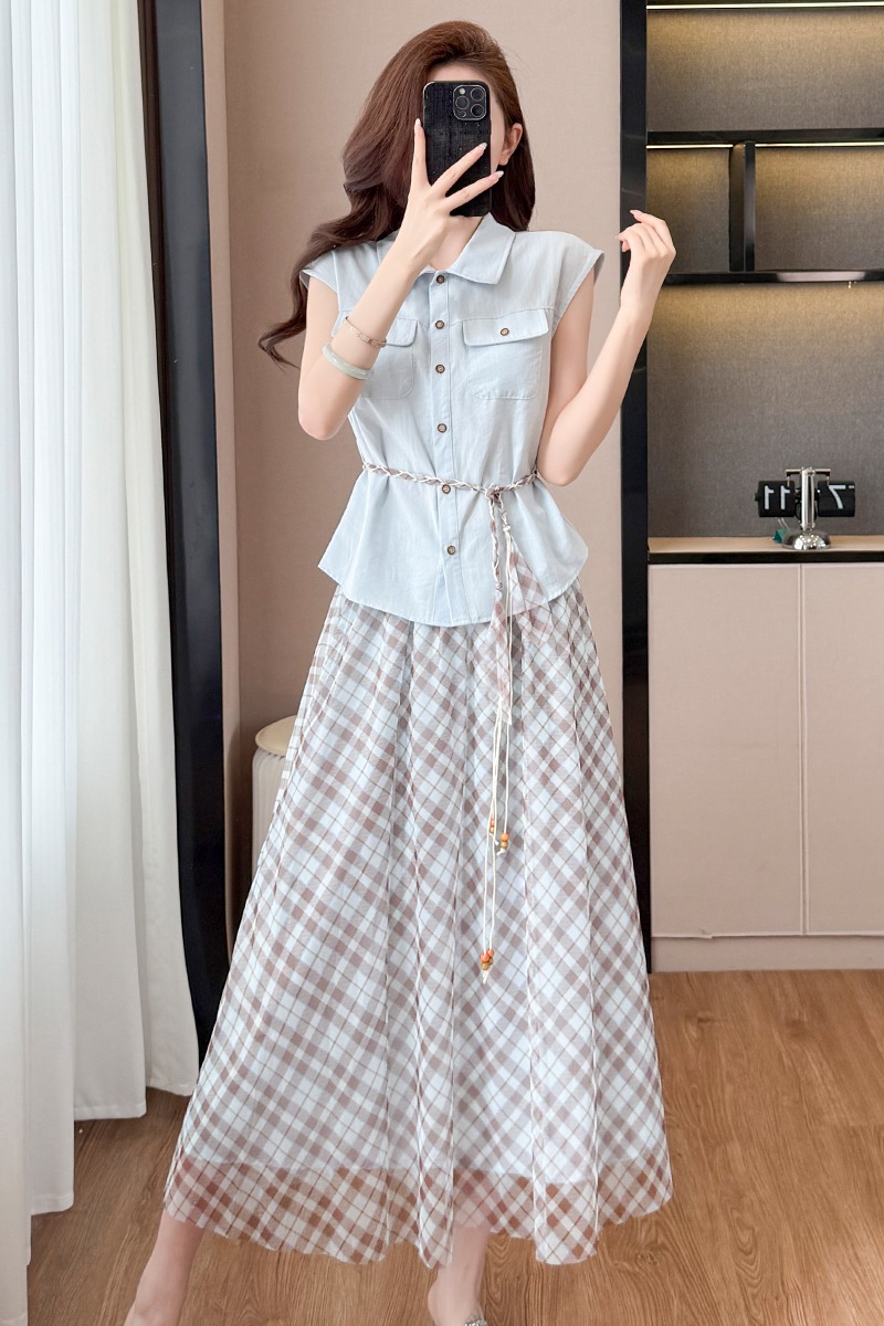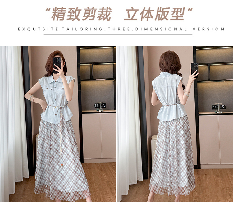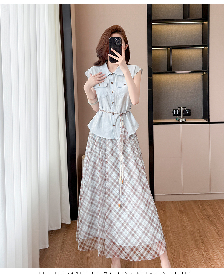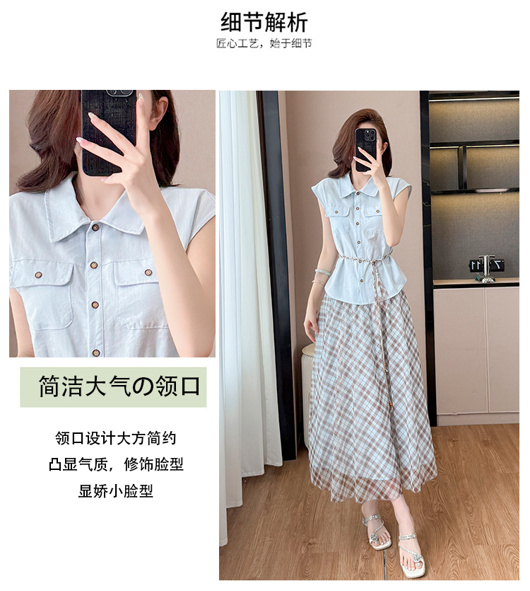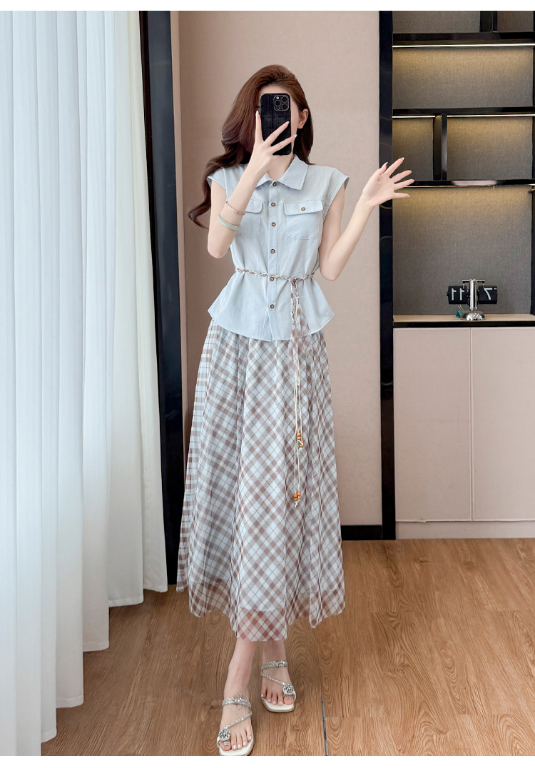 RY2203# 时尚休闲气质通勤套装夏季新款收腰显瘦无袖衬衫格纹半身裙两件套
