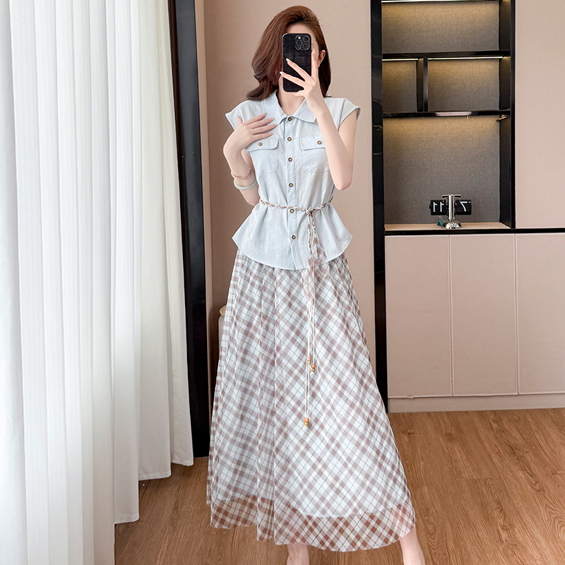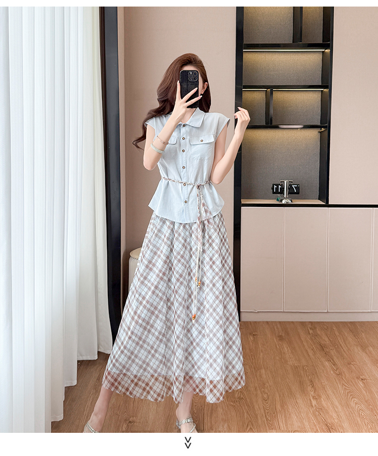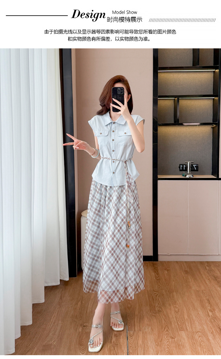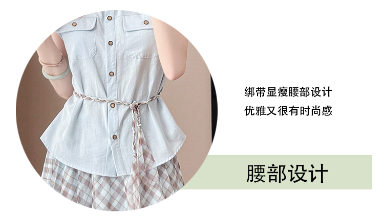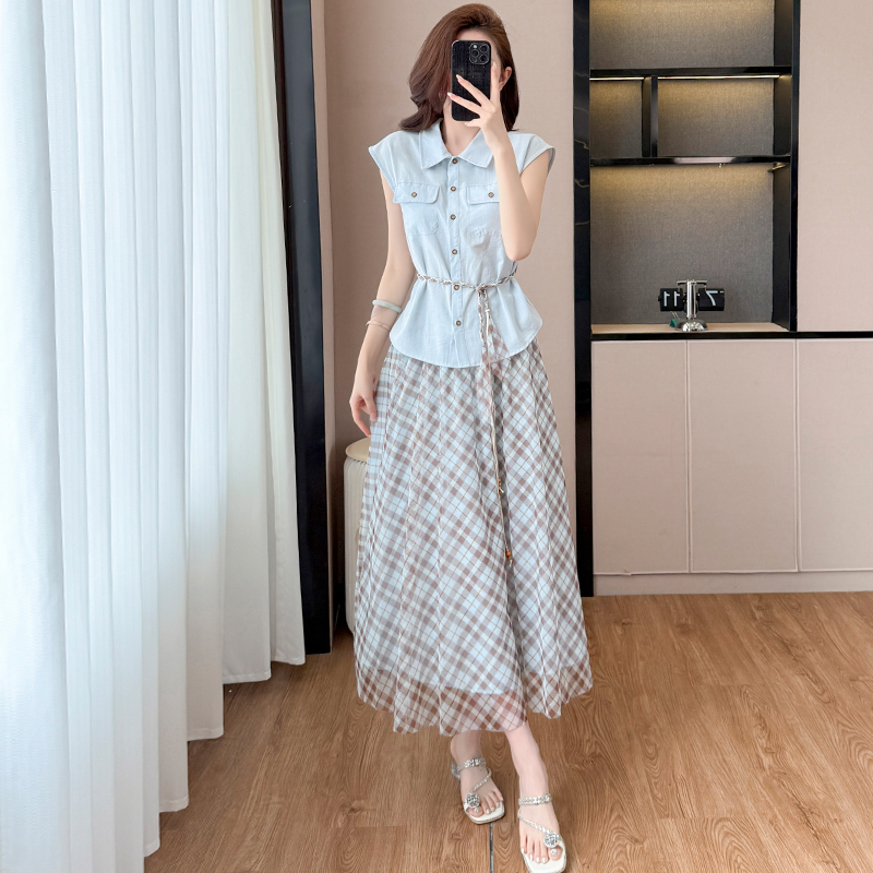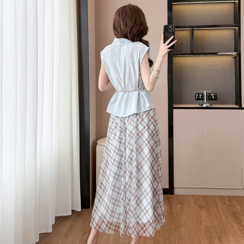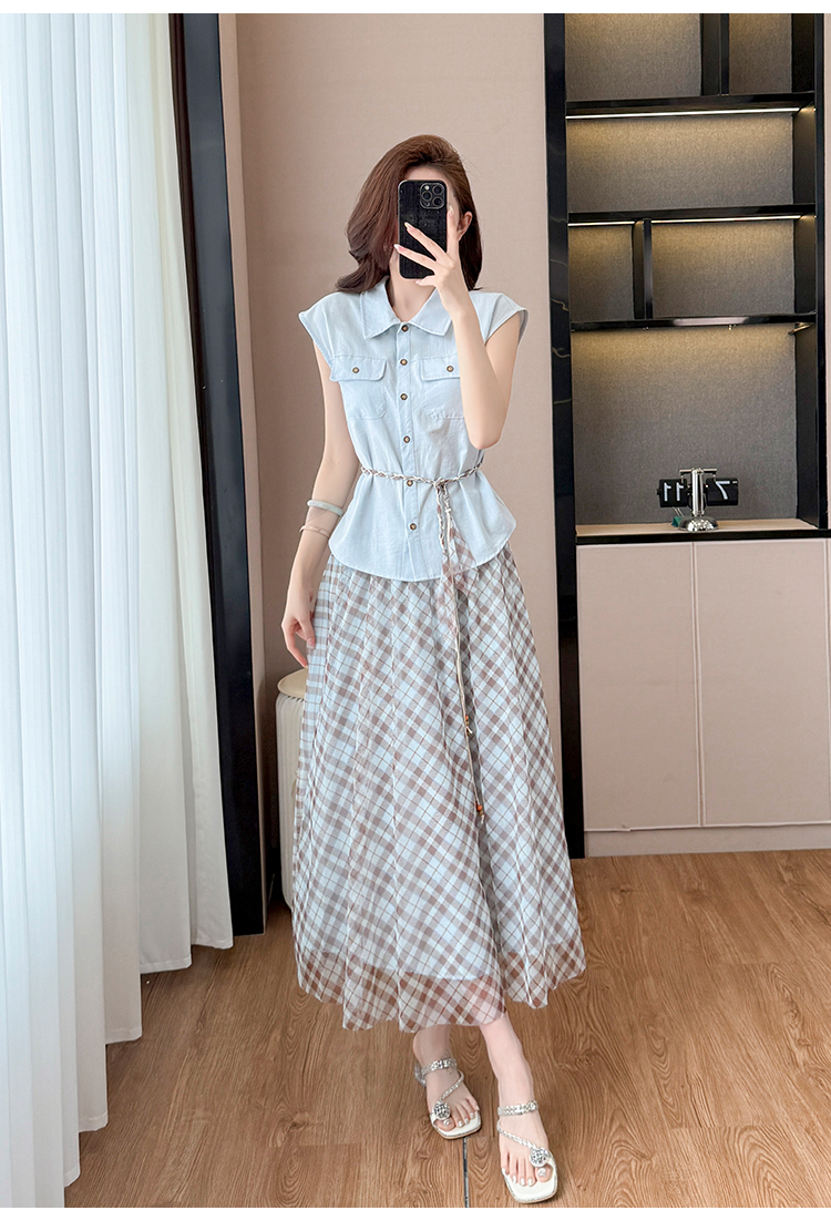 RY2203# 时尚休闲气质通勤套装夏季新款收腰显瘦无袖衬衫格纹半身裙两件套