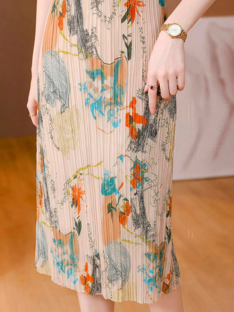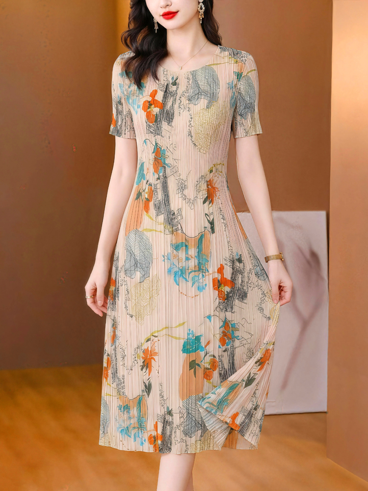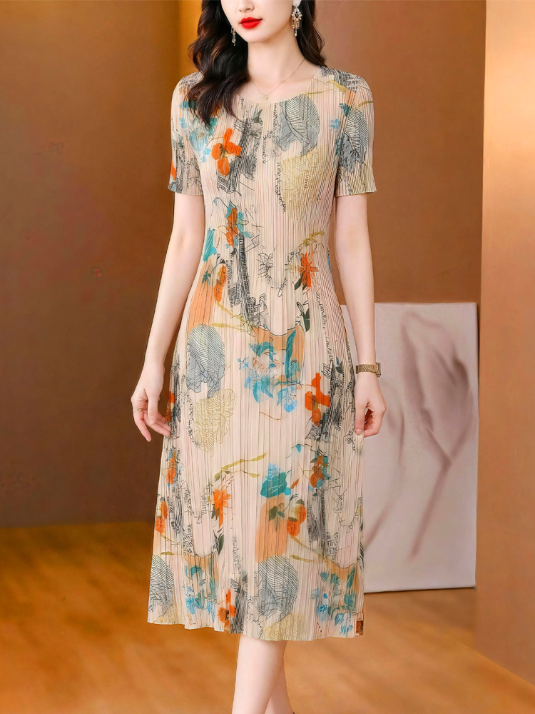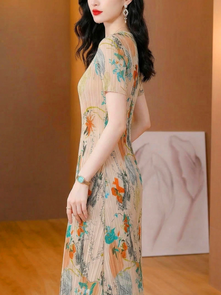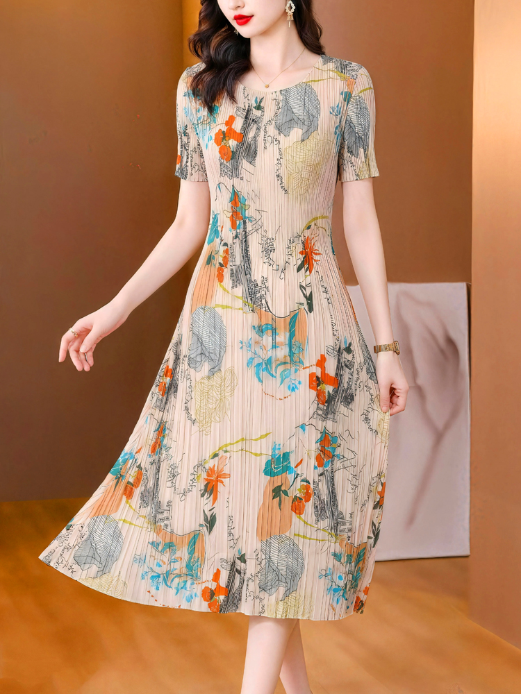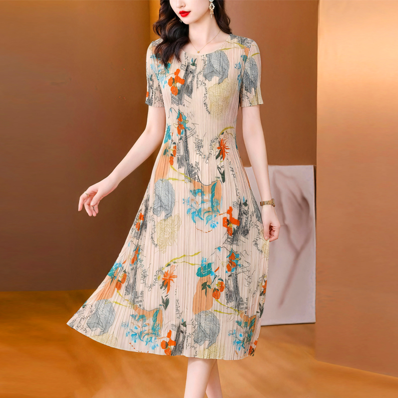 RY2223# 三宅褶皱2026夏季新款大码阔太太宽松复古印花气质显瘦A字连衣裙