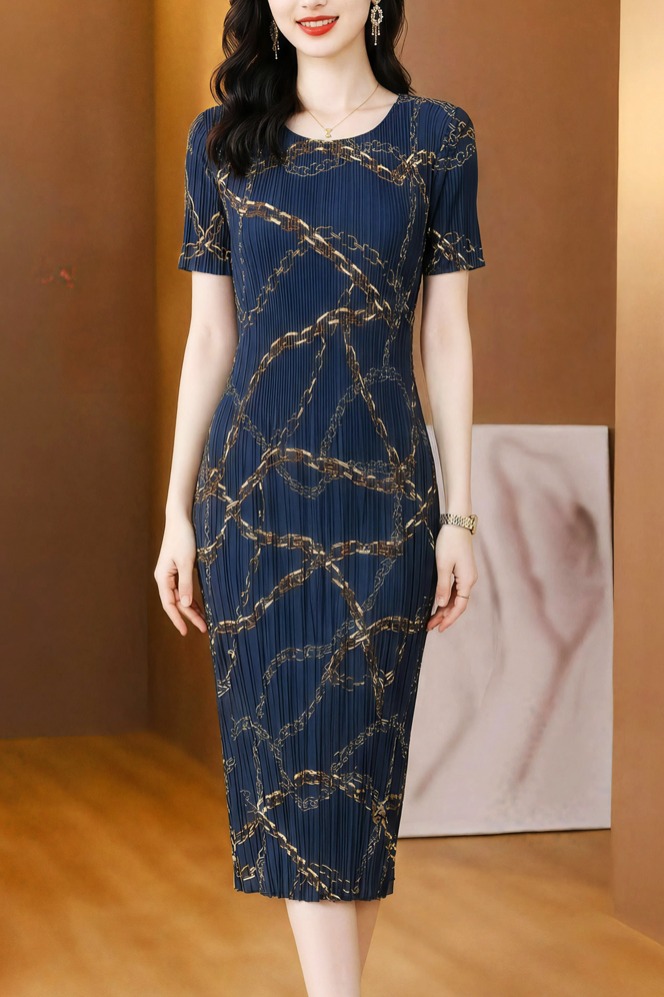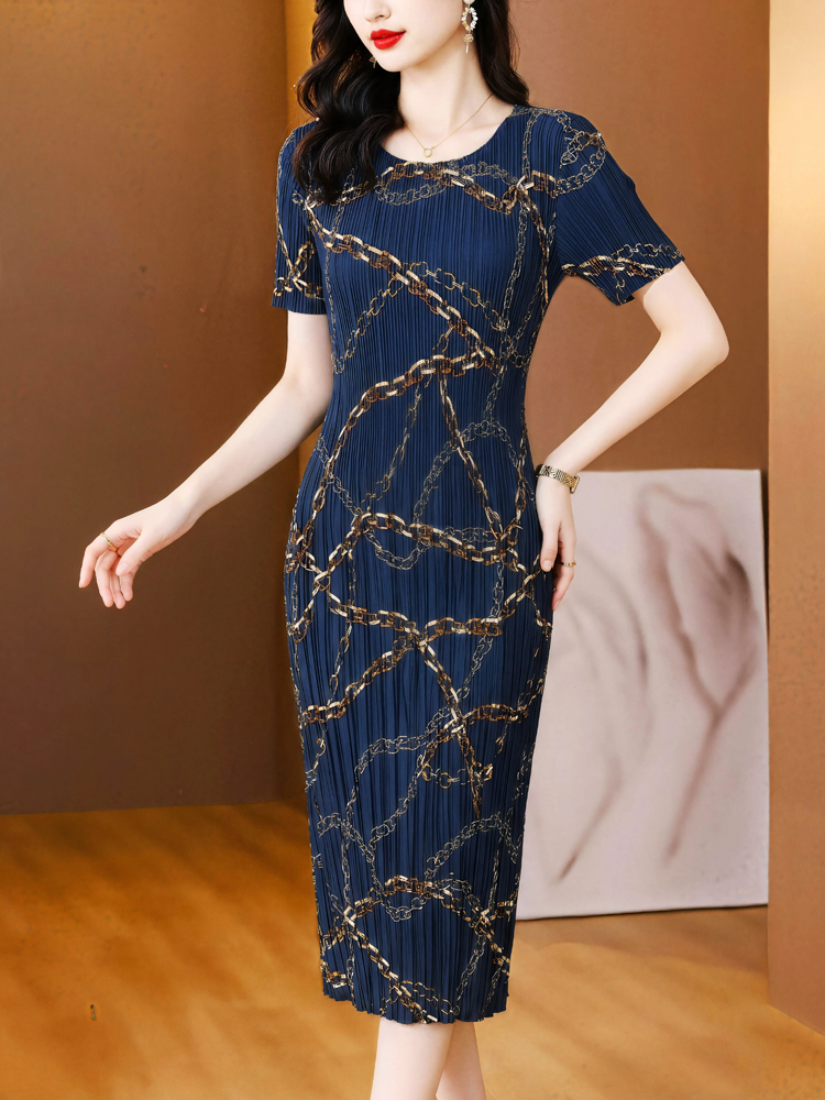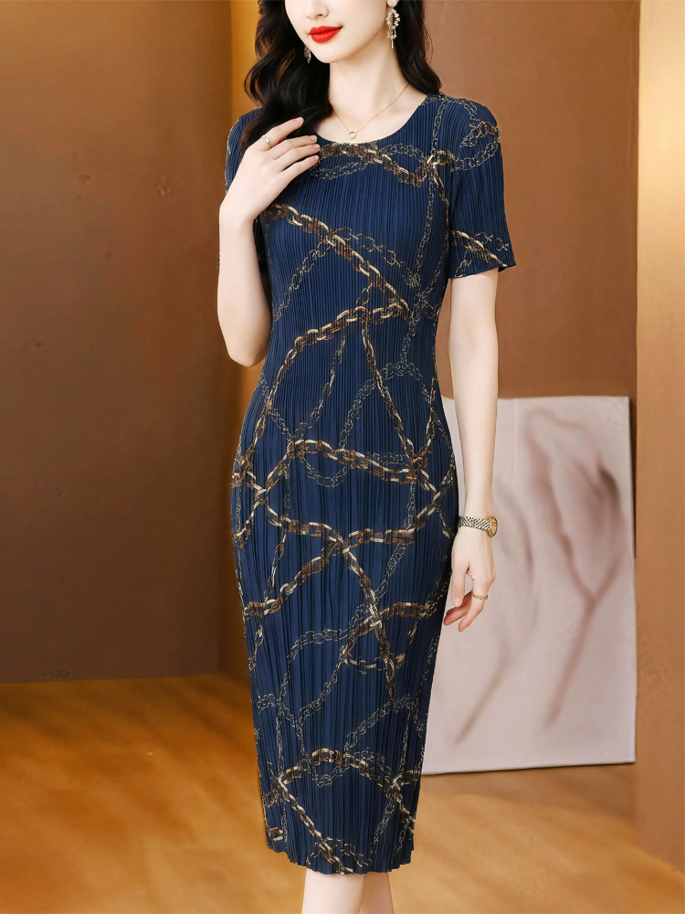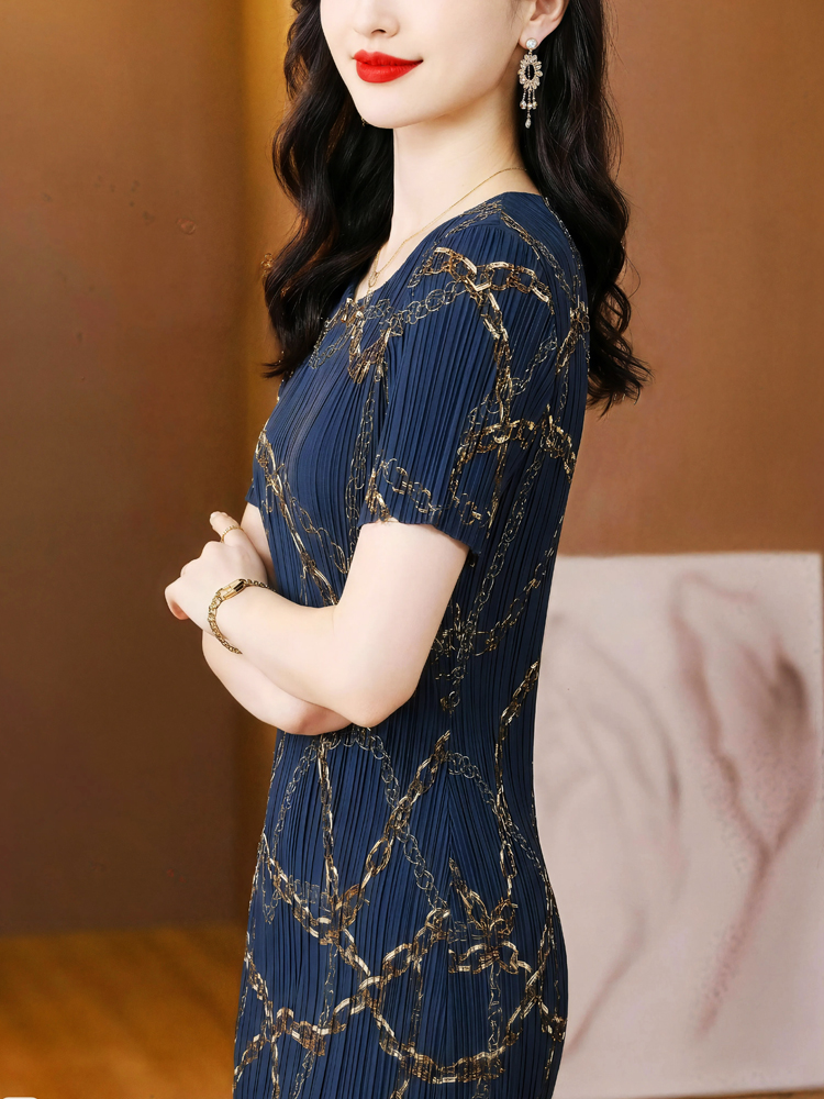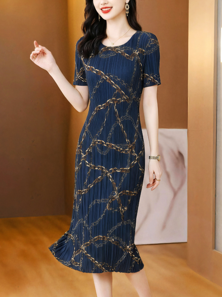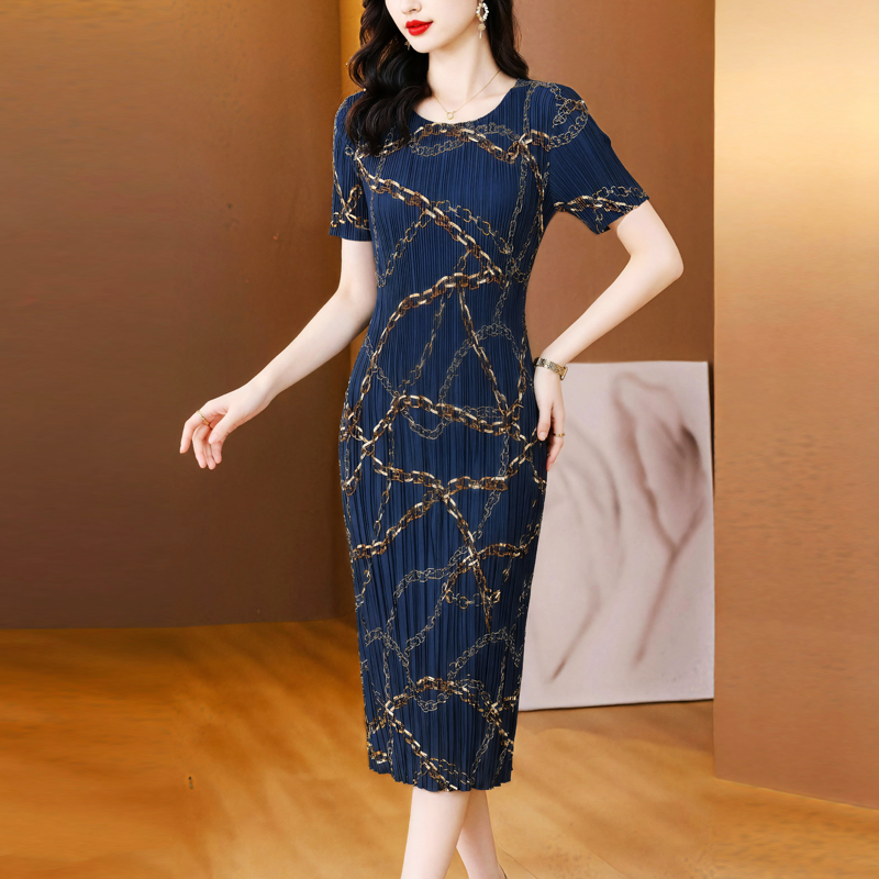 RY2225# 三宅褶皱2026夏季新款大码阔太太宽松复古印花气质显瘦A字连衣裙