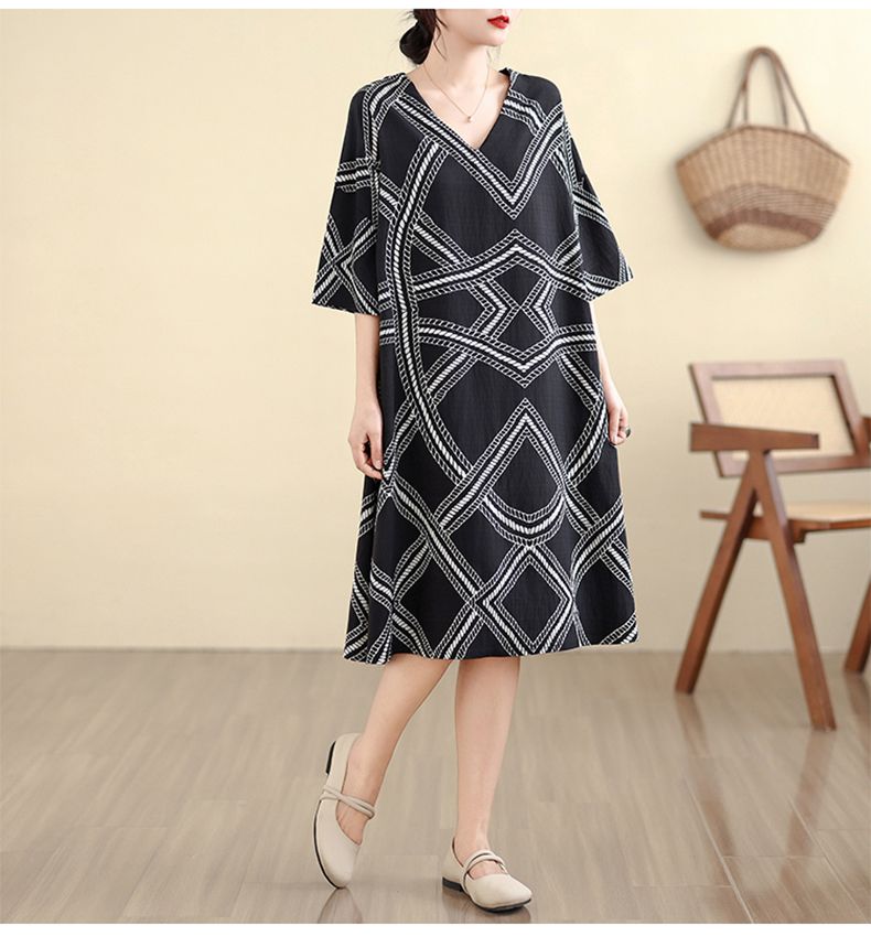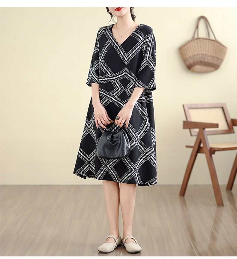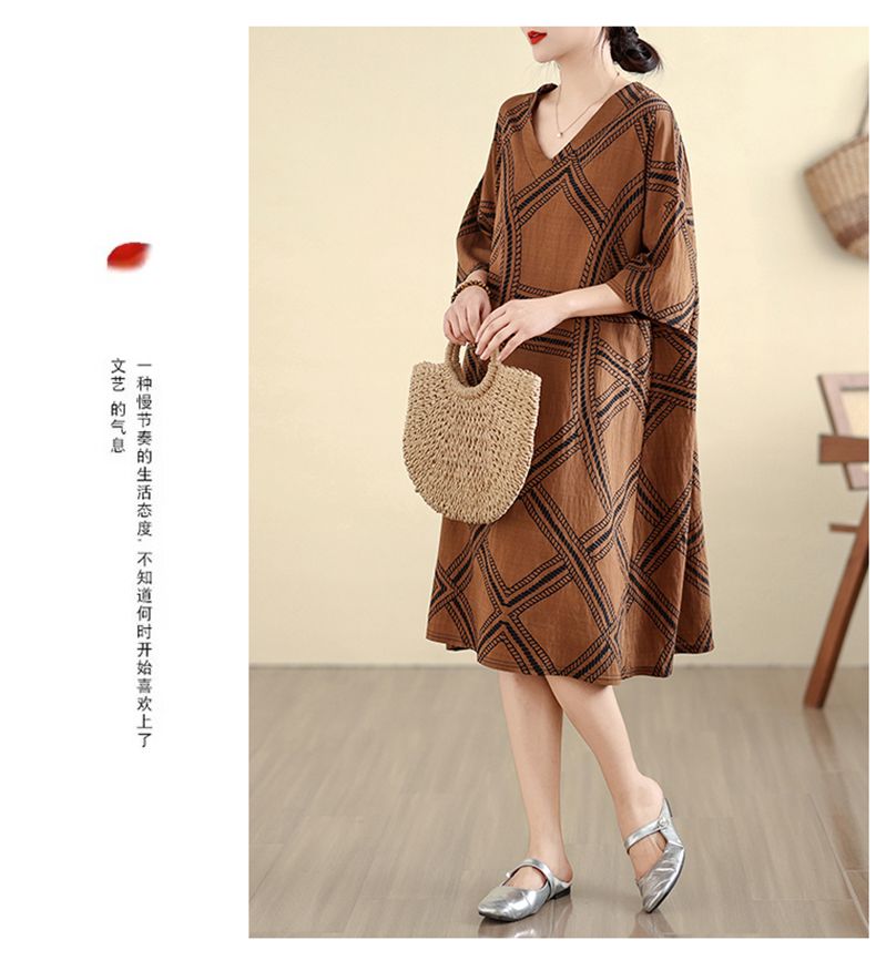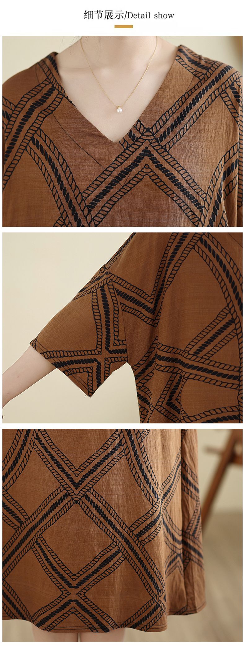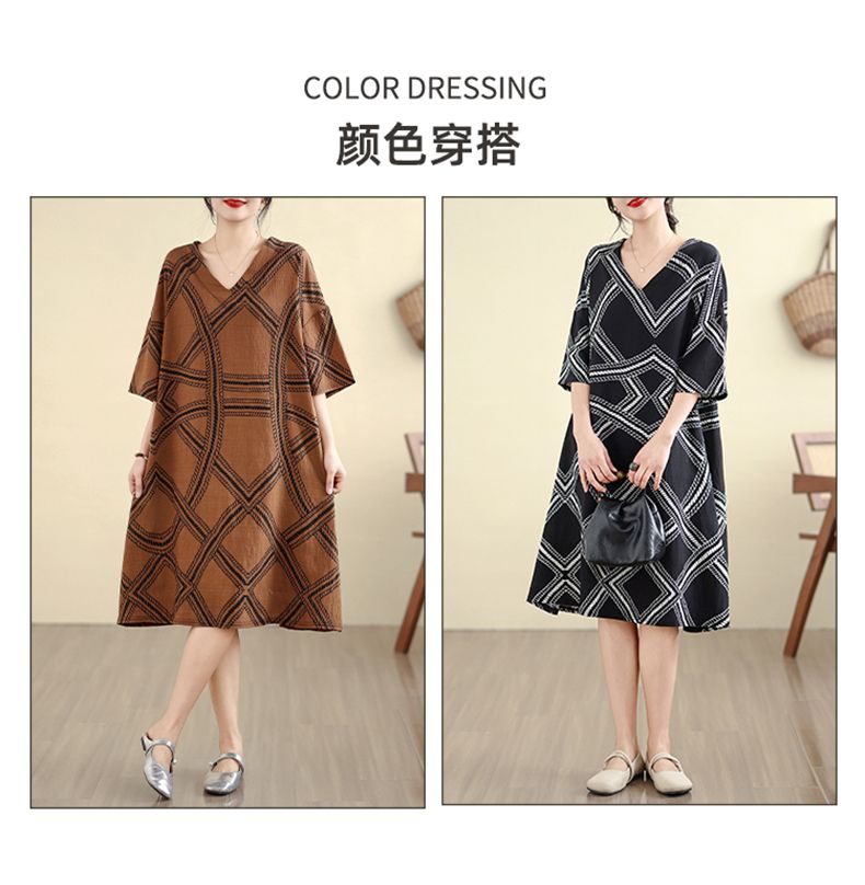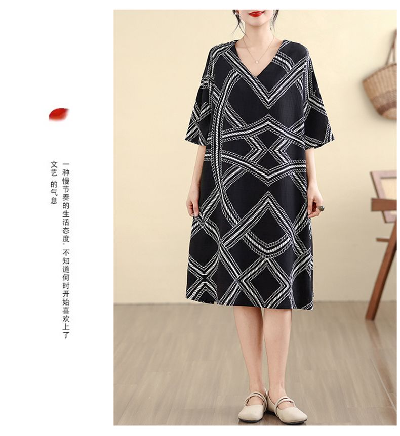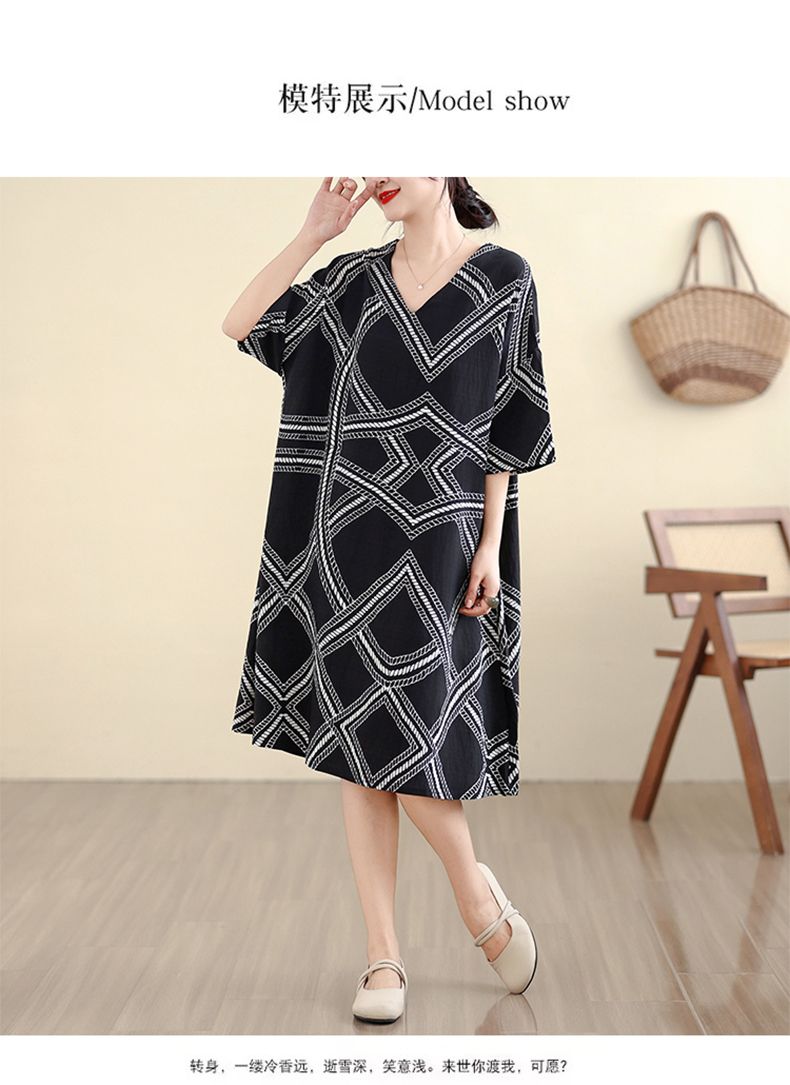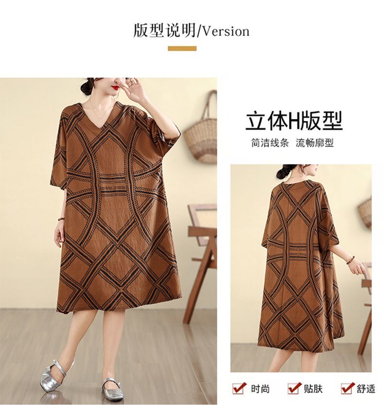 RY2228# 实拍 棉麻夏季新款大码宽松休闲V领遮肉慵懒风过膝几何印花连衣裙