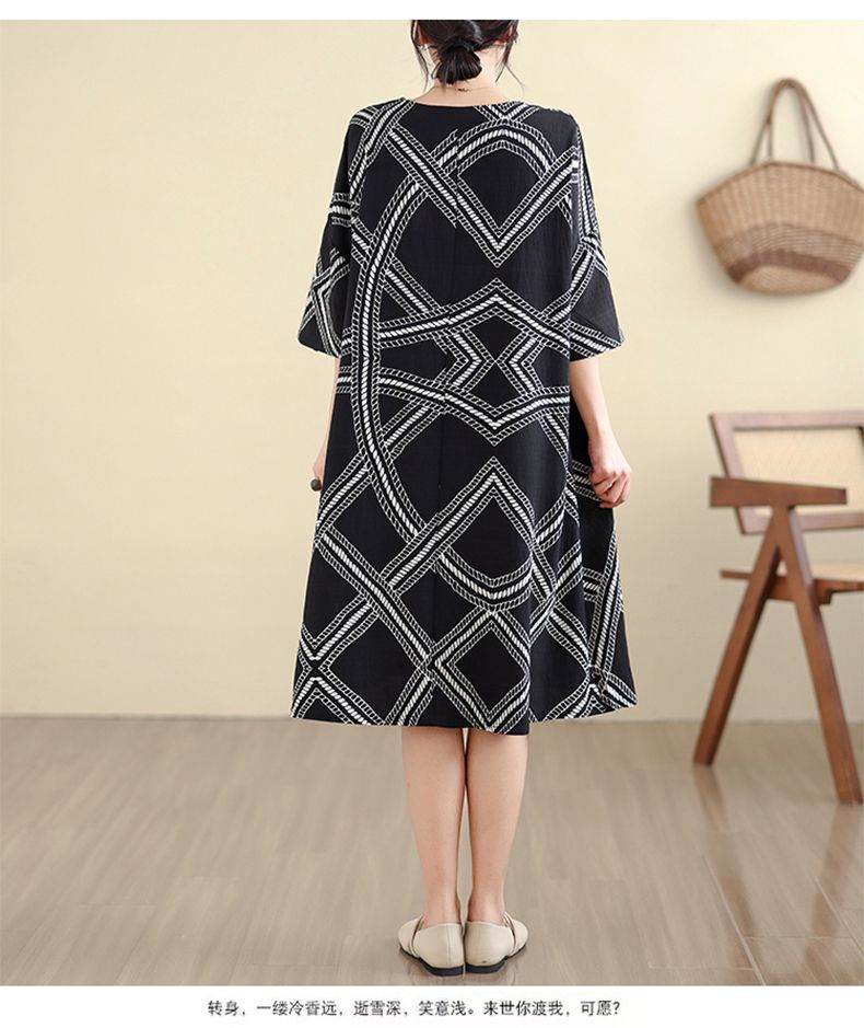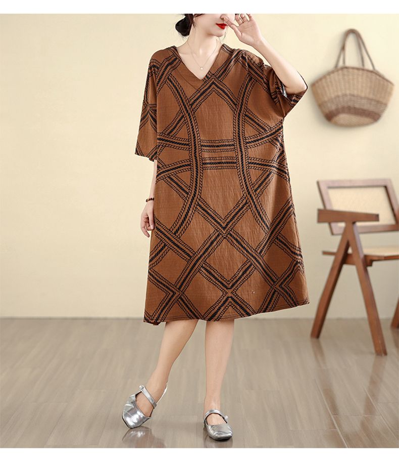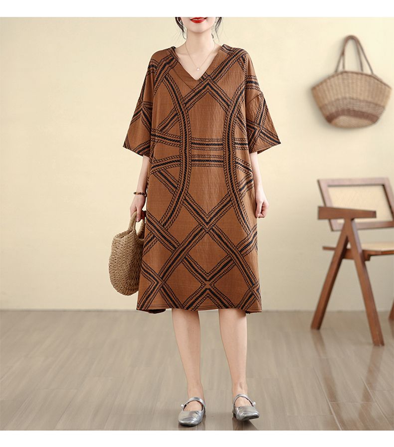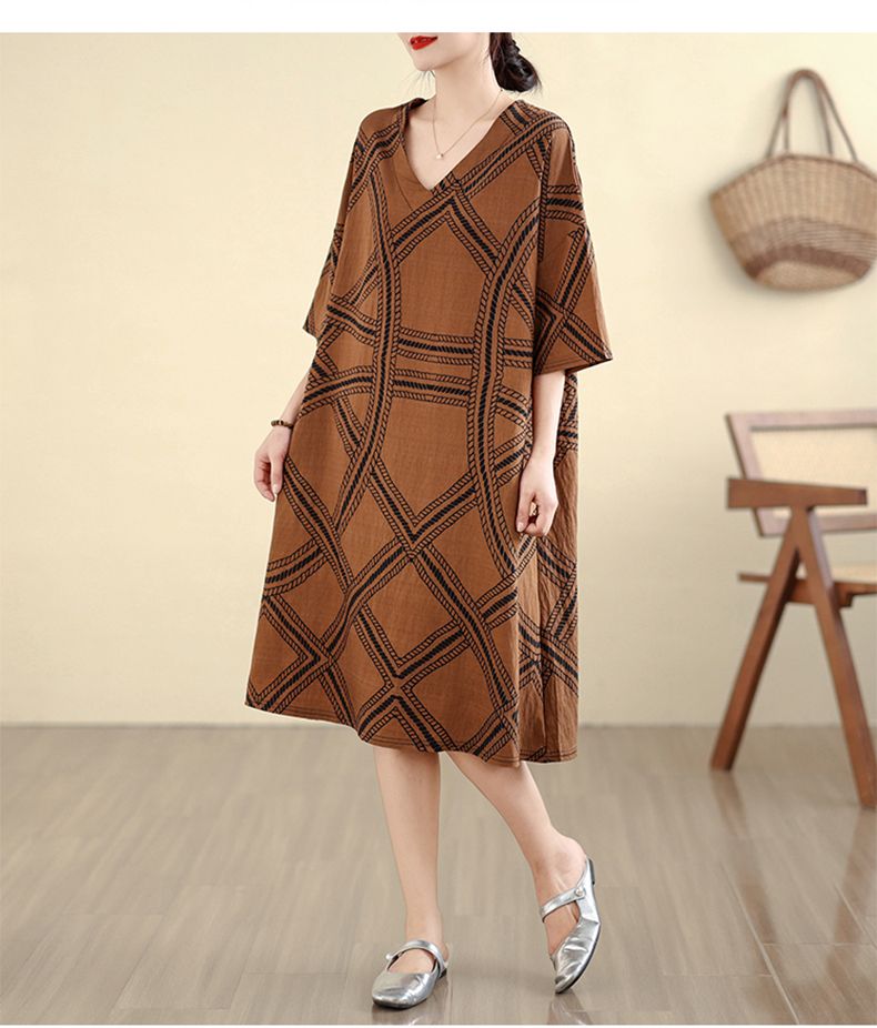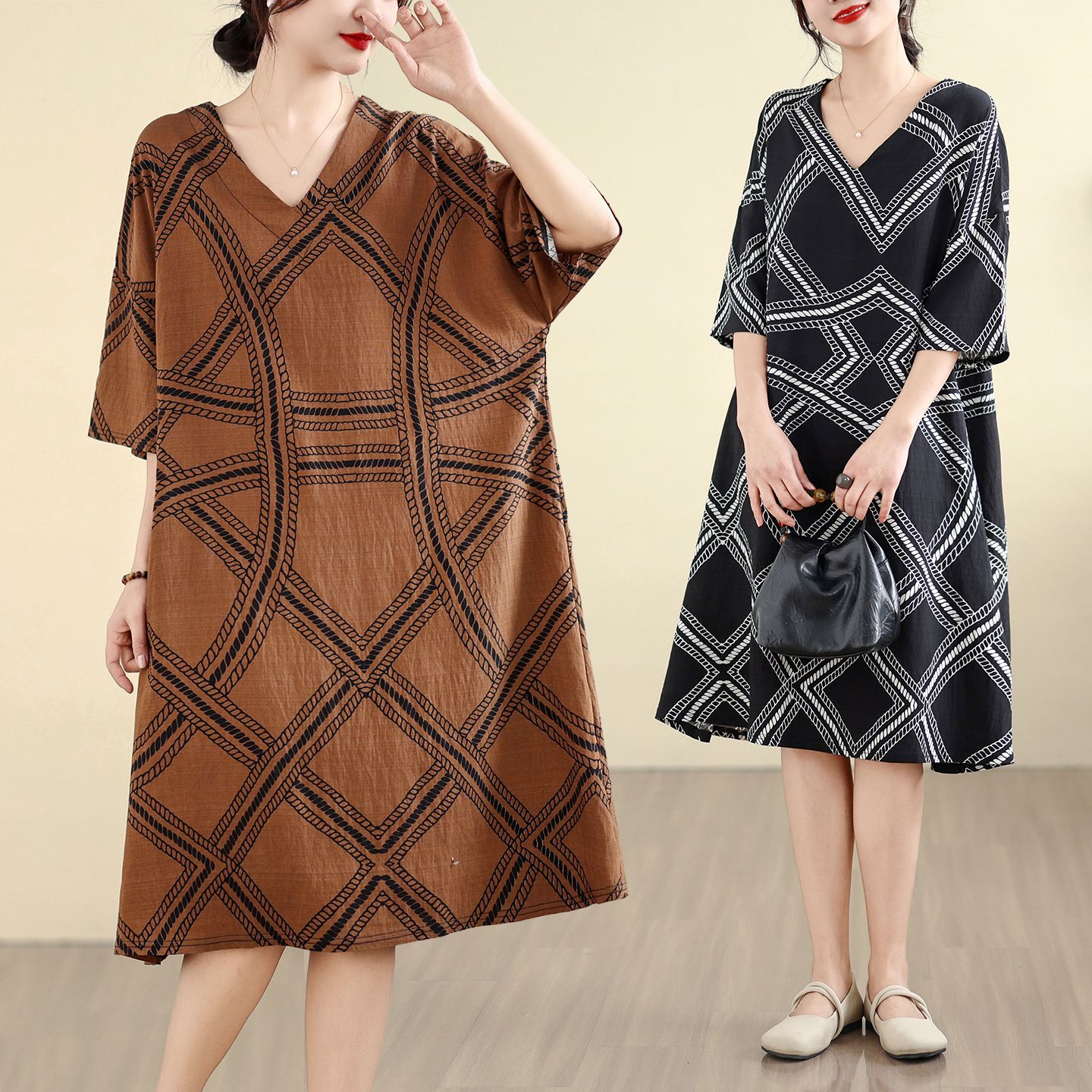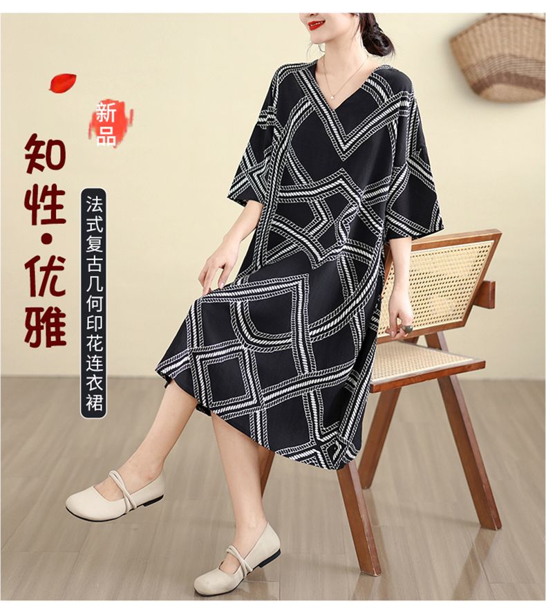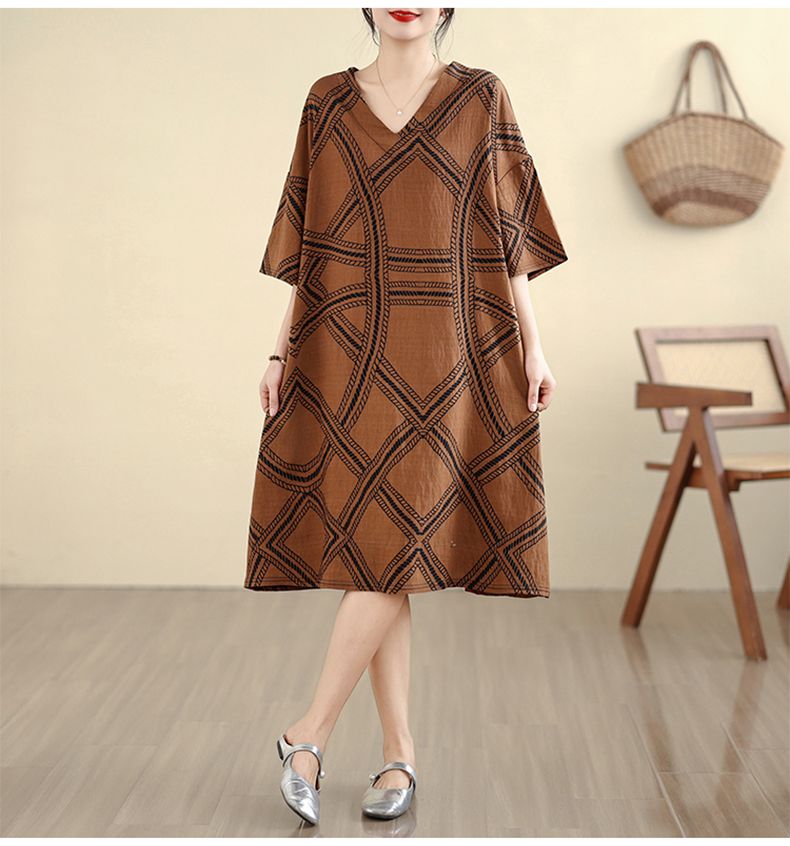 RY2228# 实拍 棉麻夏季新款大码宽松休闲V领遮肉慵懒风过膝几何印花连衣裙