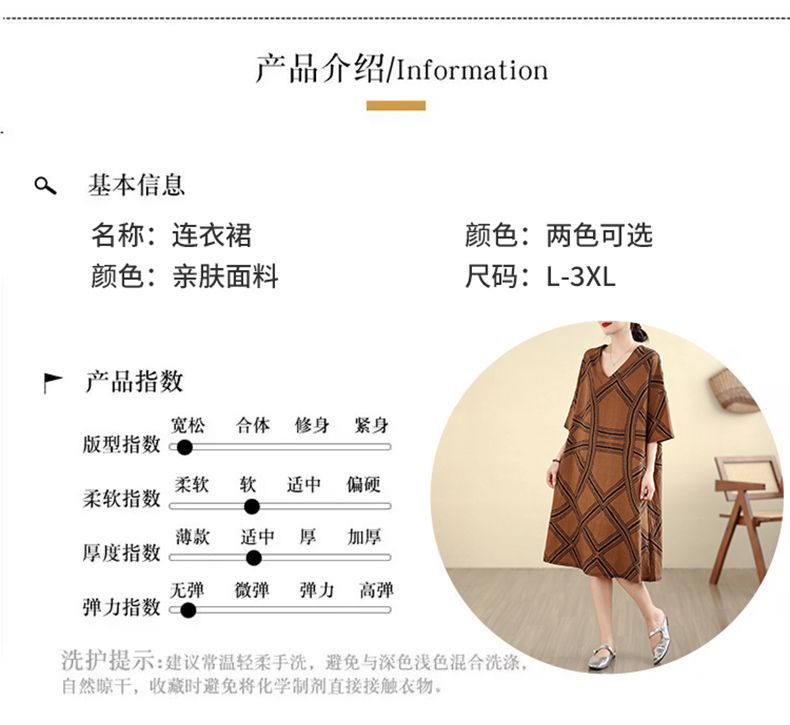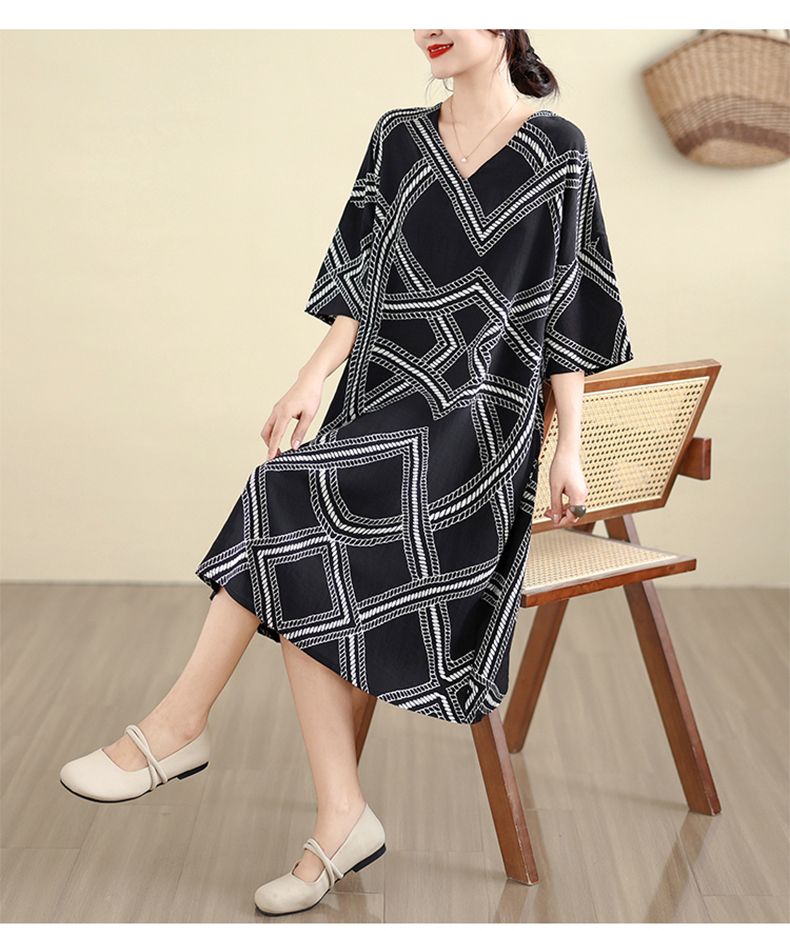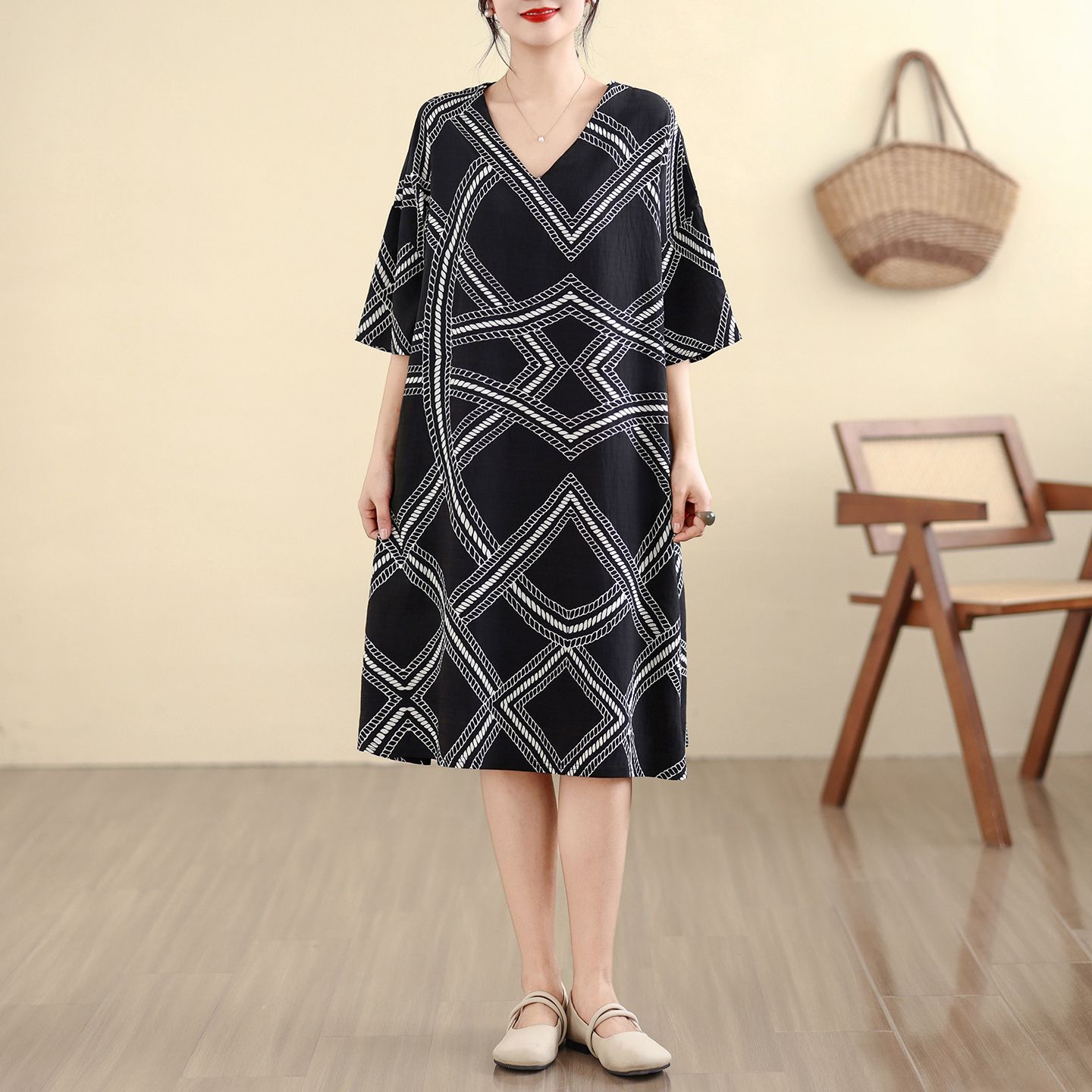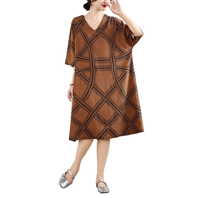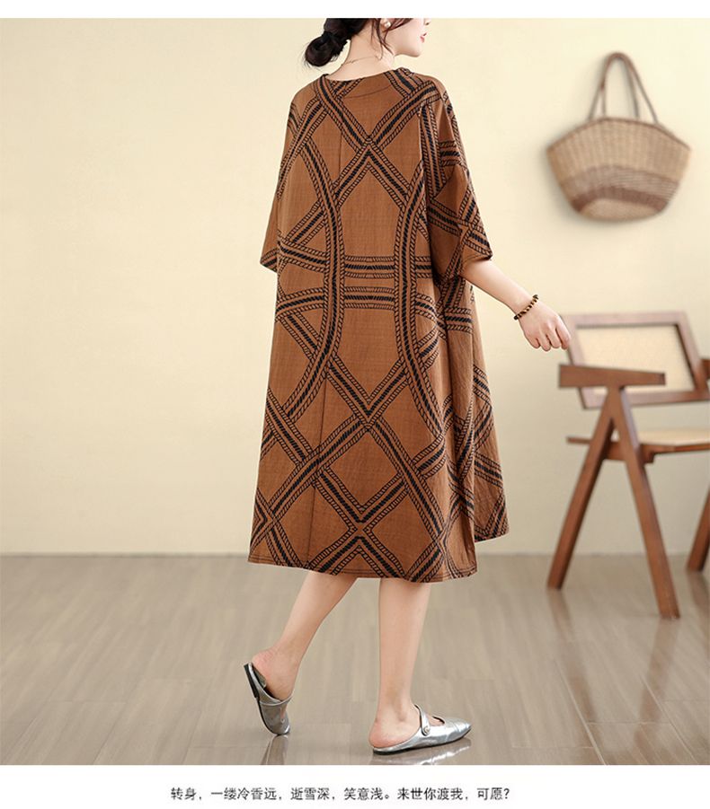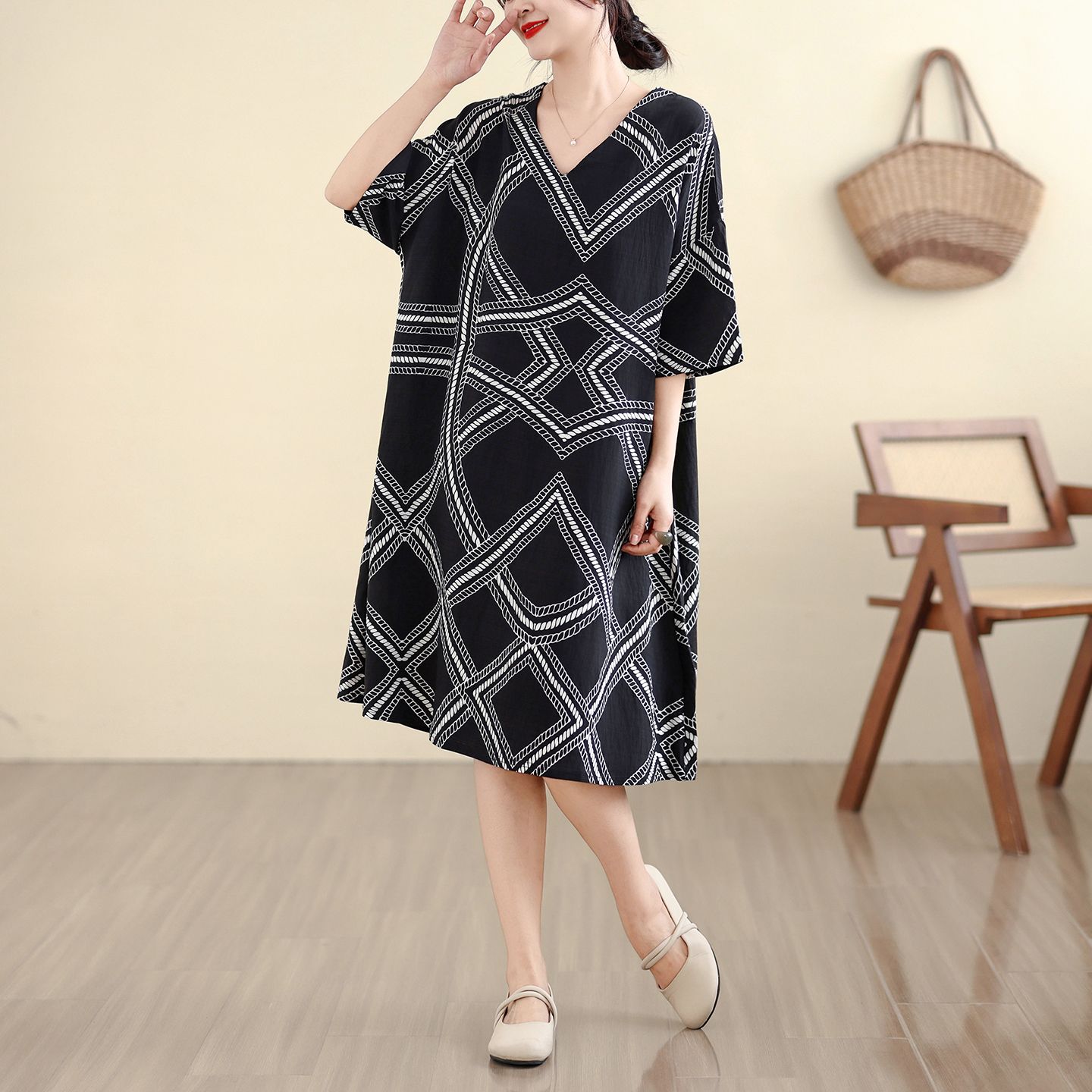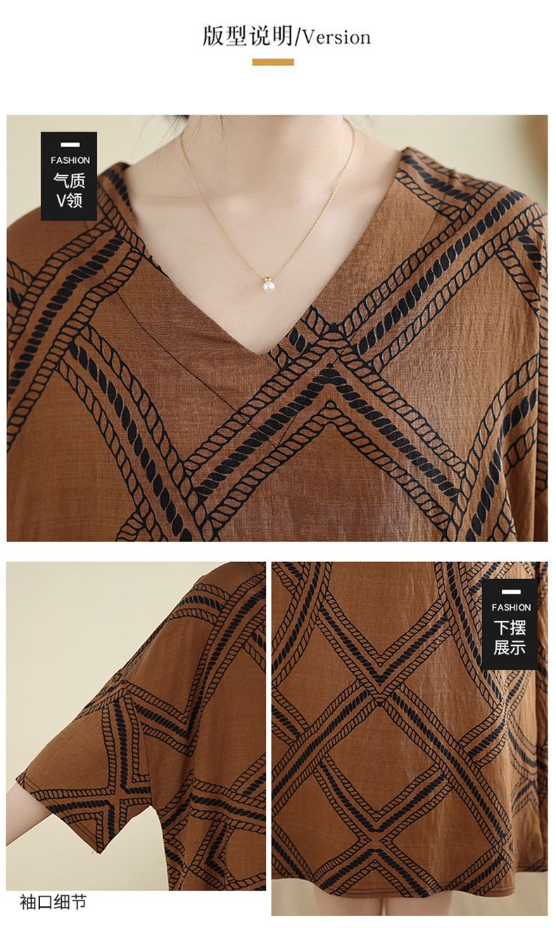 RY2228# 实拍 棉麻夏季新款大码宽松休闲V领遮肉慵懒风过膝几何印花连衣裙