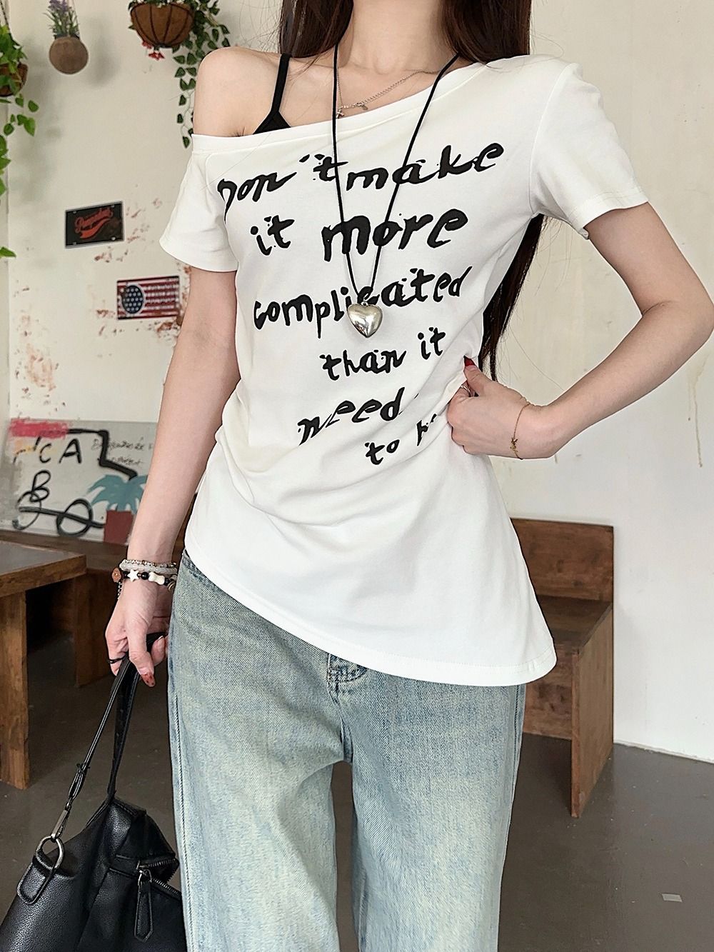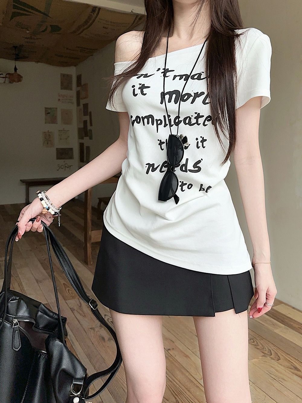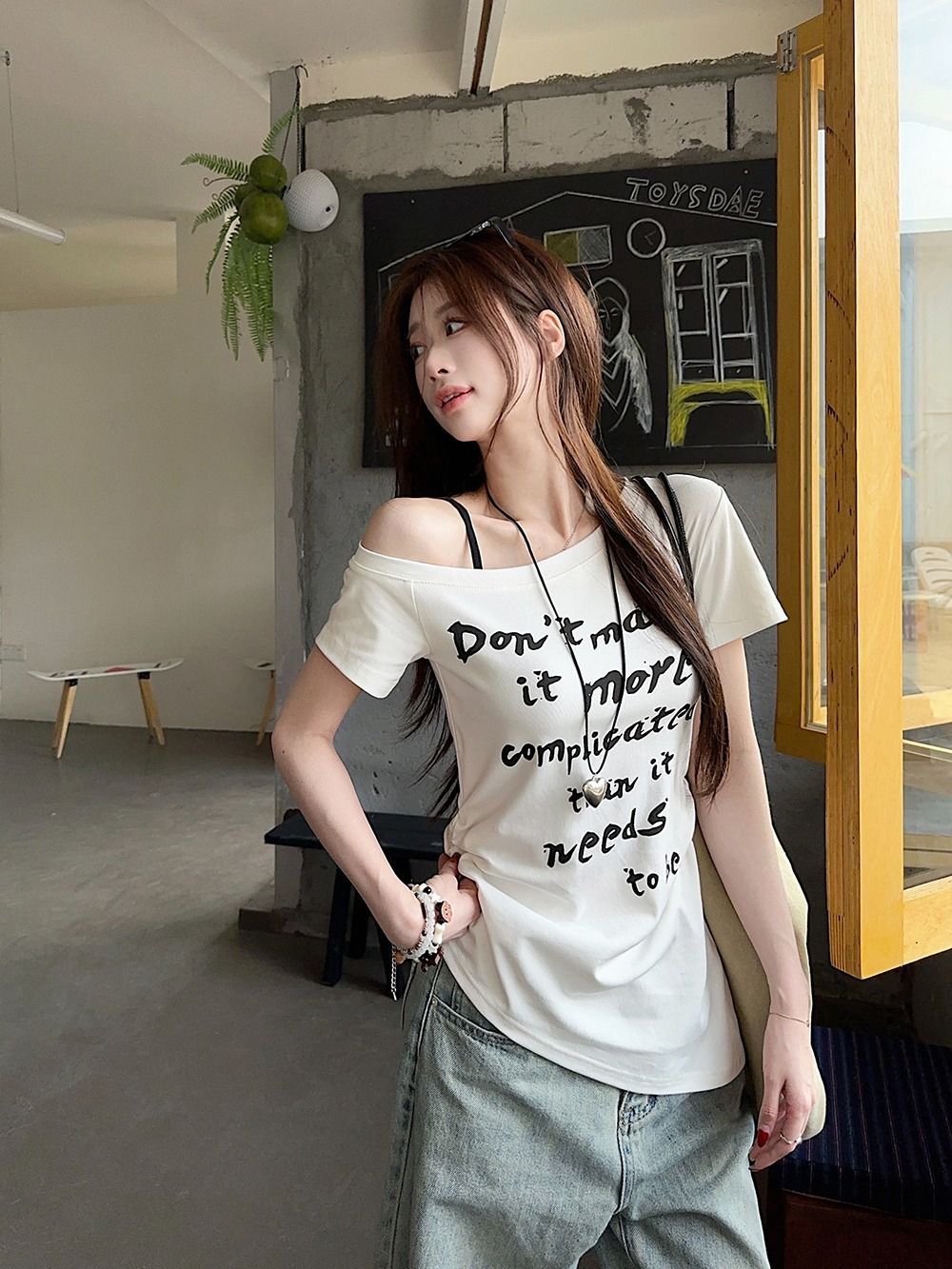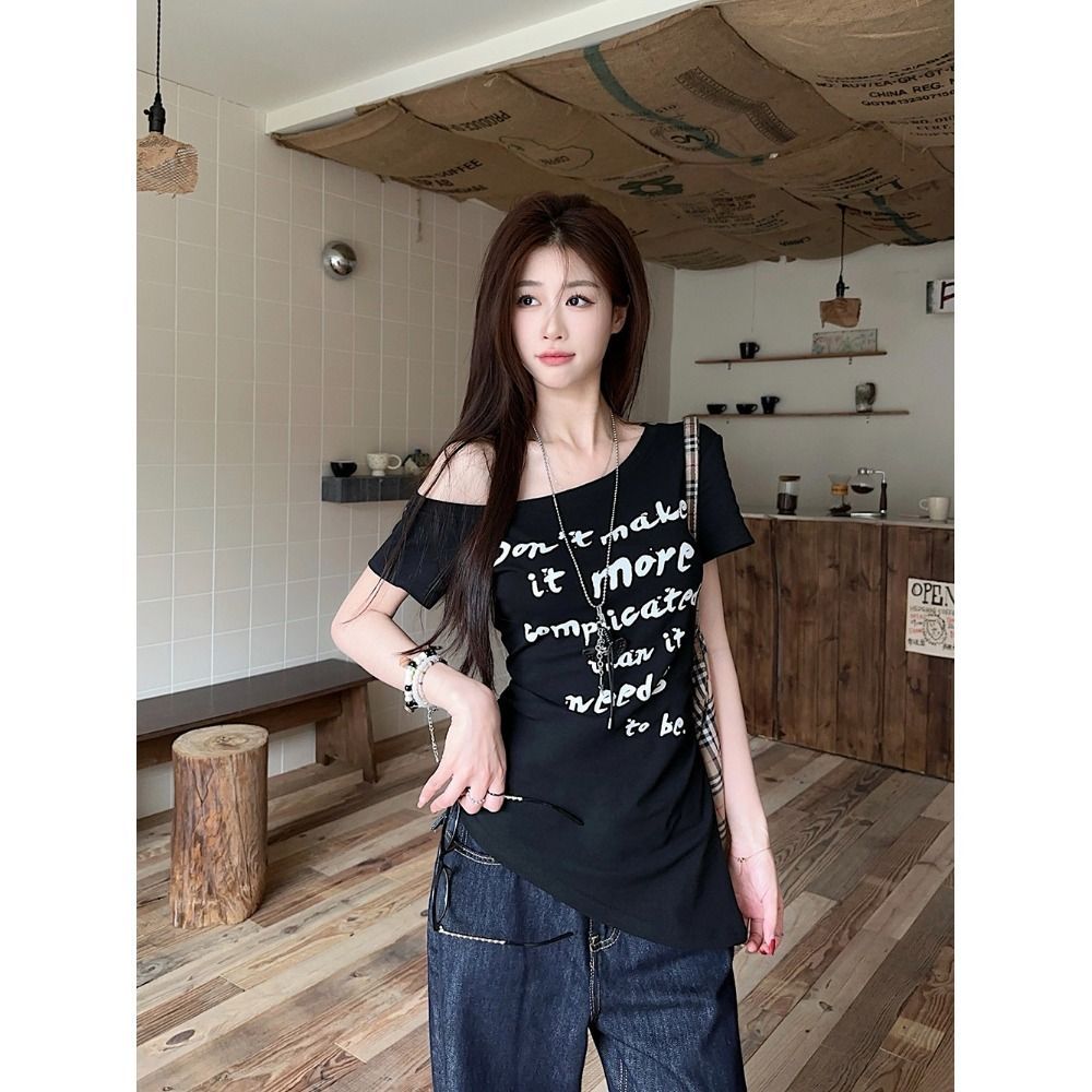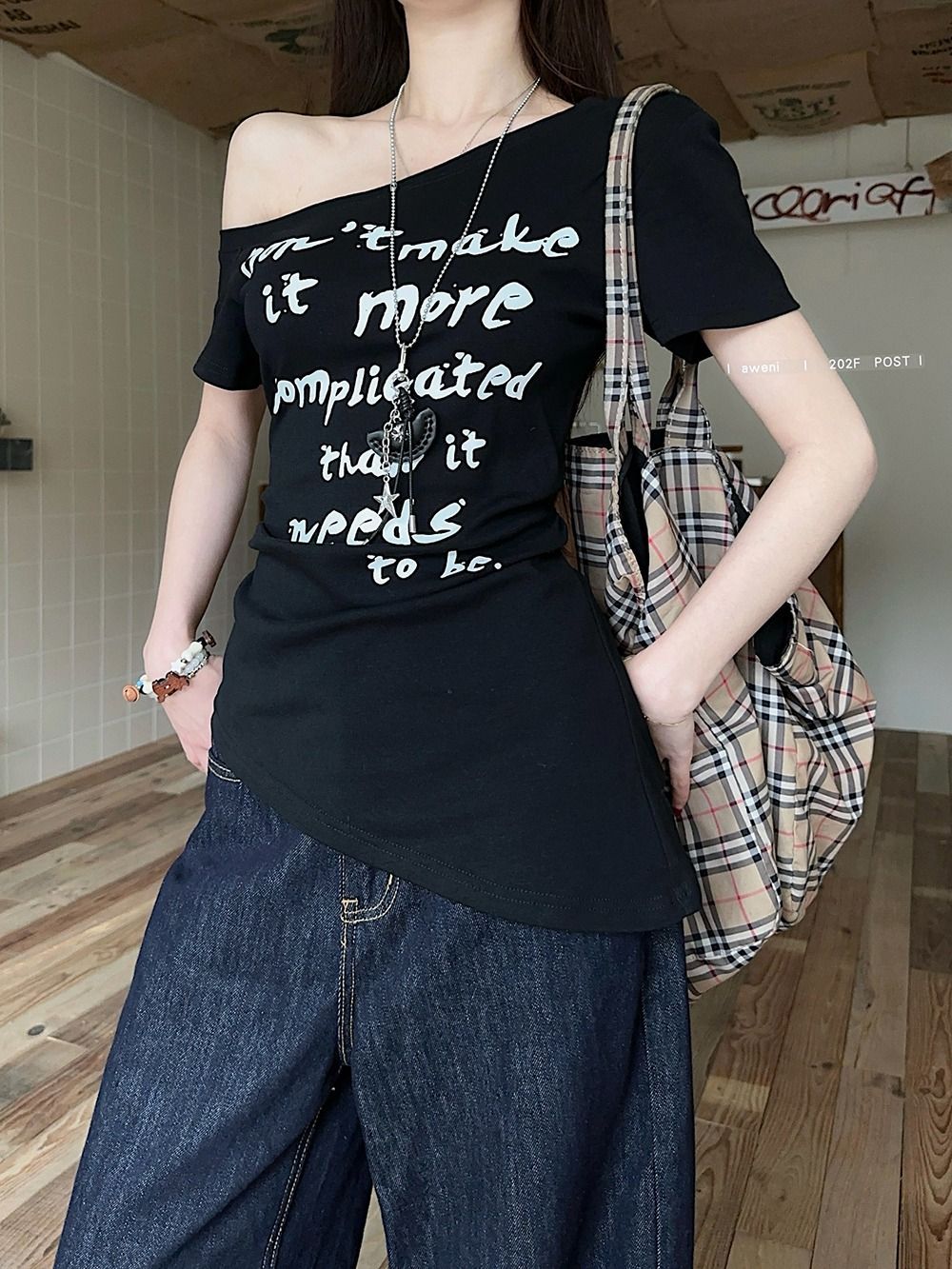 RY2502# 随心裁美式辣妹字母印花斜肩短袖T恤女夏设计感收腰露肩上衣