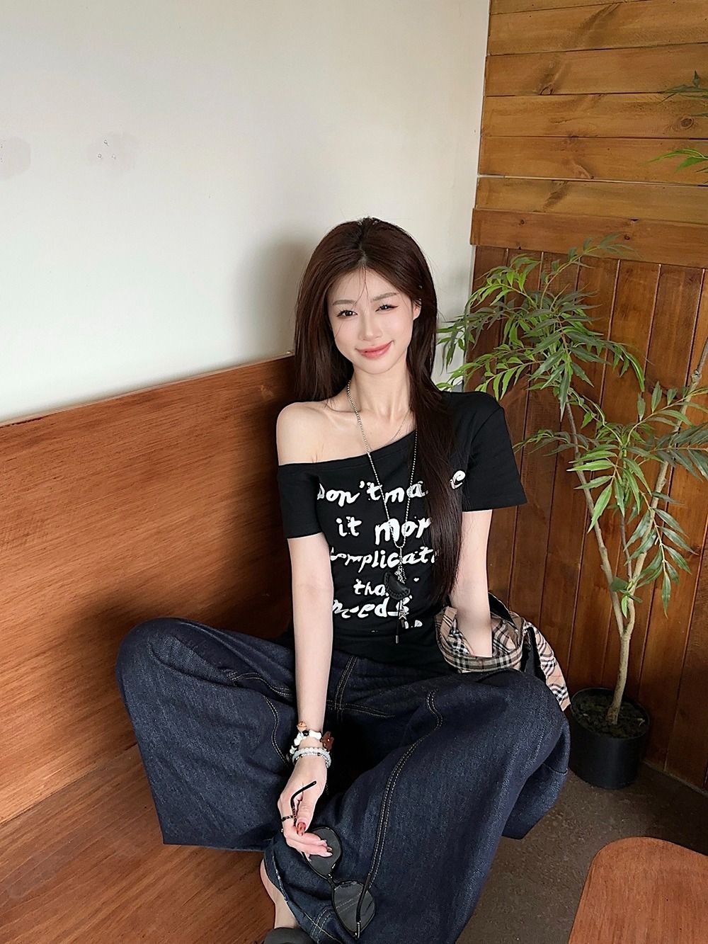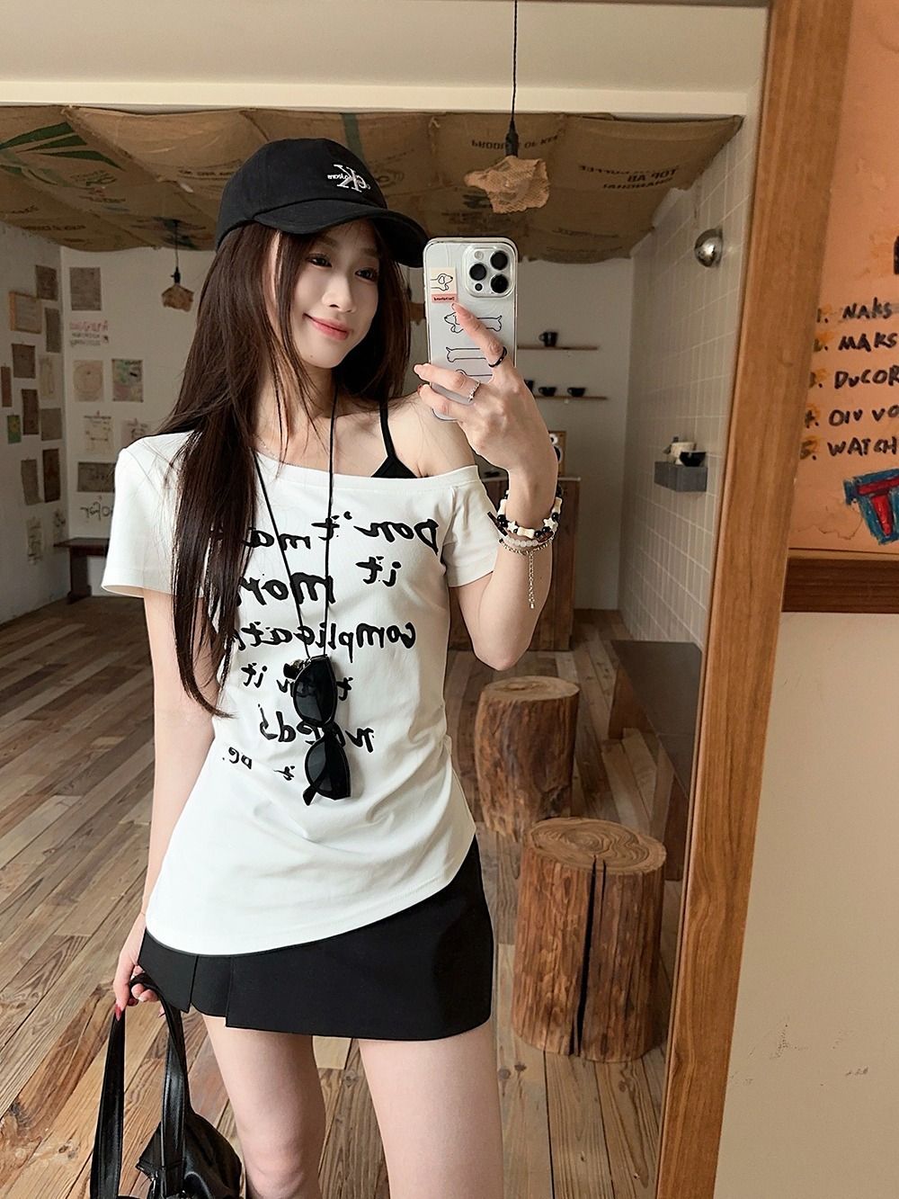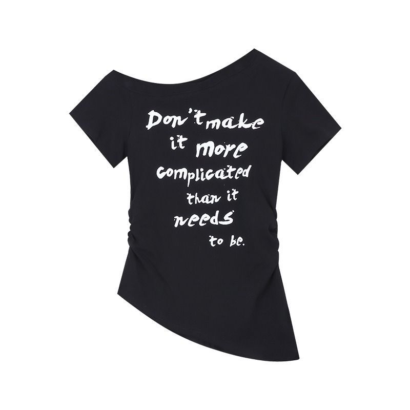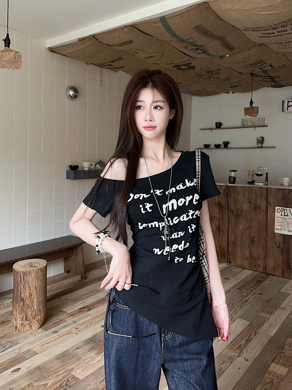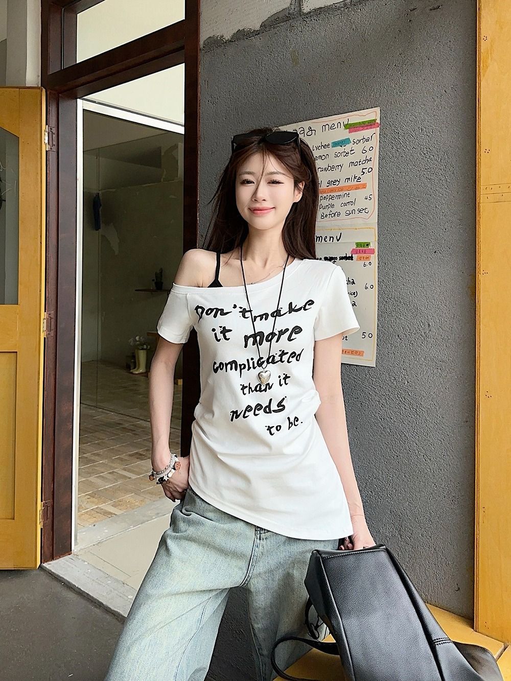RY2502# 随心裁美式辣妹字母印花斜肩短袖T恤女夏设计感收腰露肩上衣