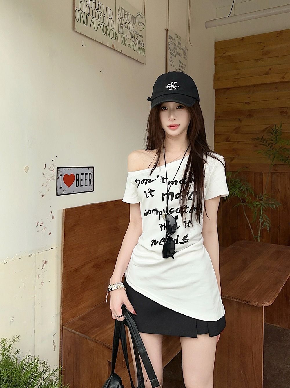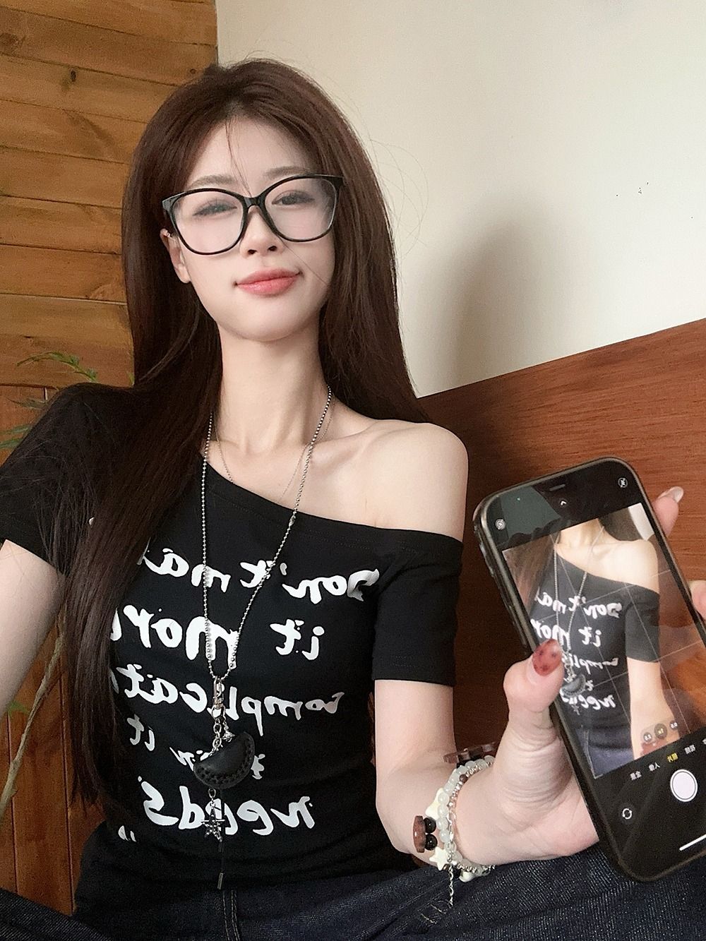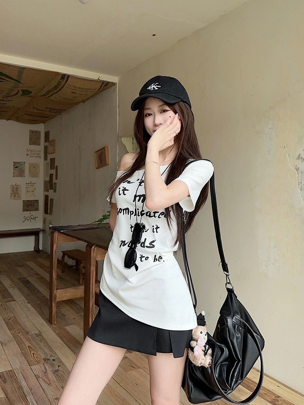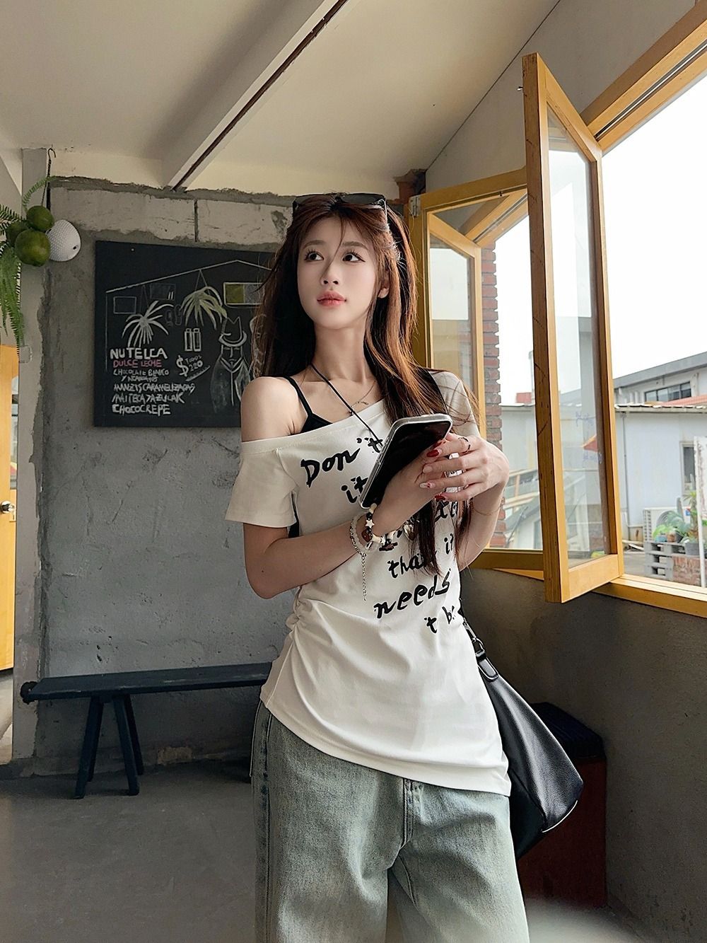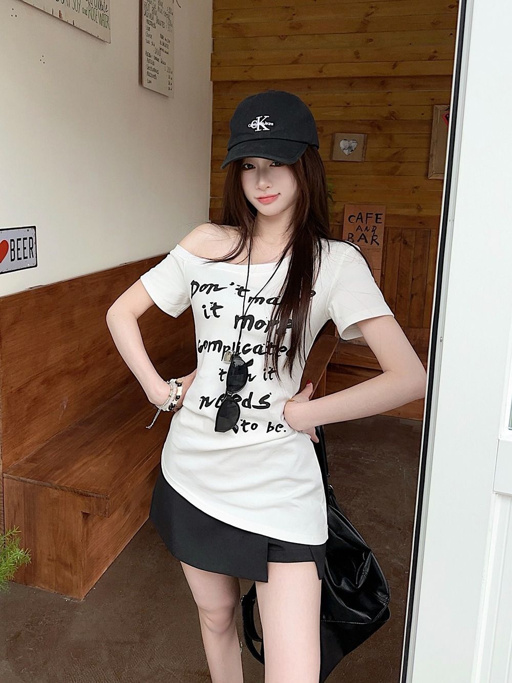 RY2502# 随心裁美式辣妹字母印花斜肩短袖T恤女夏设计感收腰露肩上衣