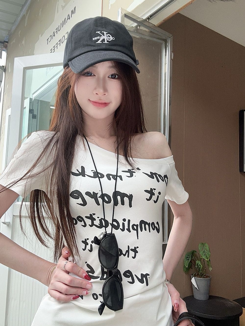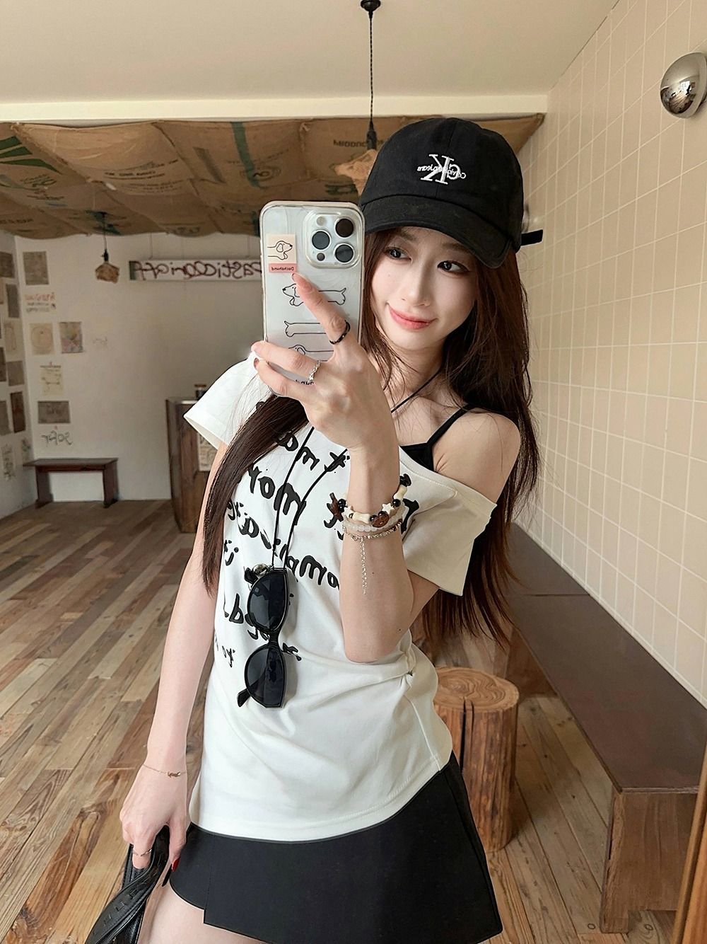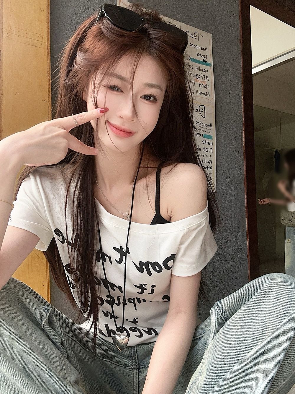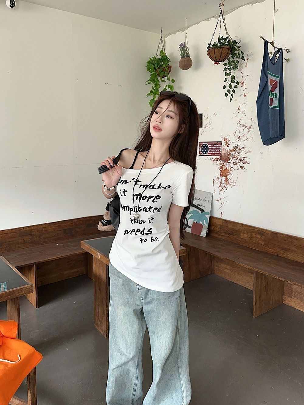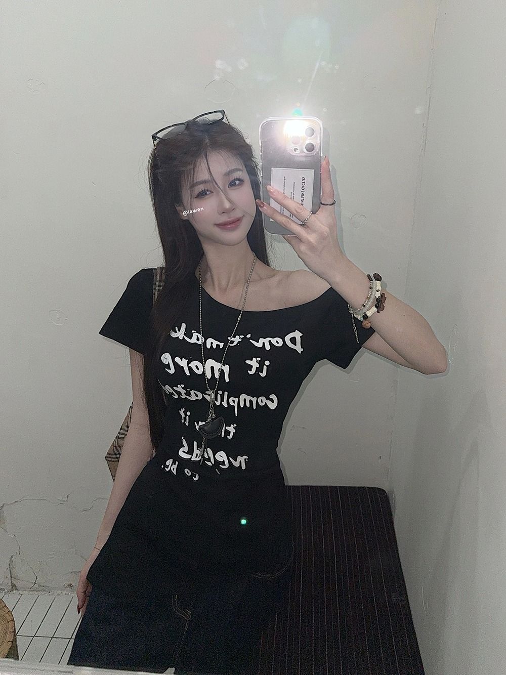 RY2502# 随心裁美式辣妹字母印花斜肩短袖T恤女夏设计感收腰露肩上衣
