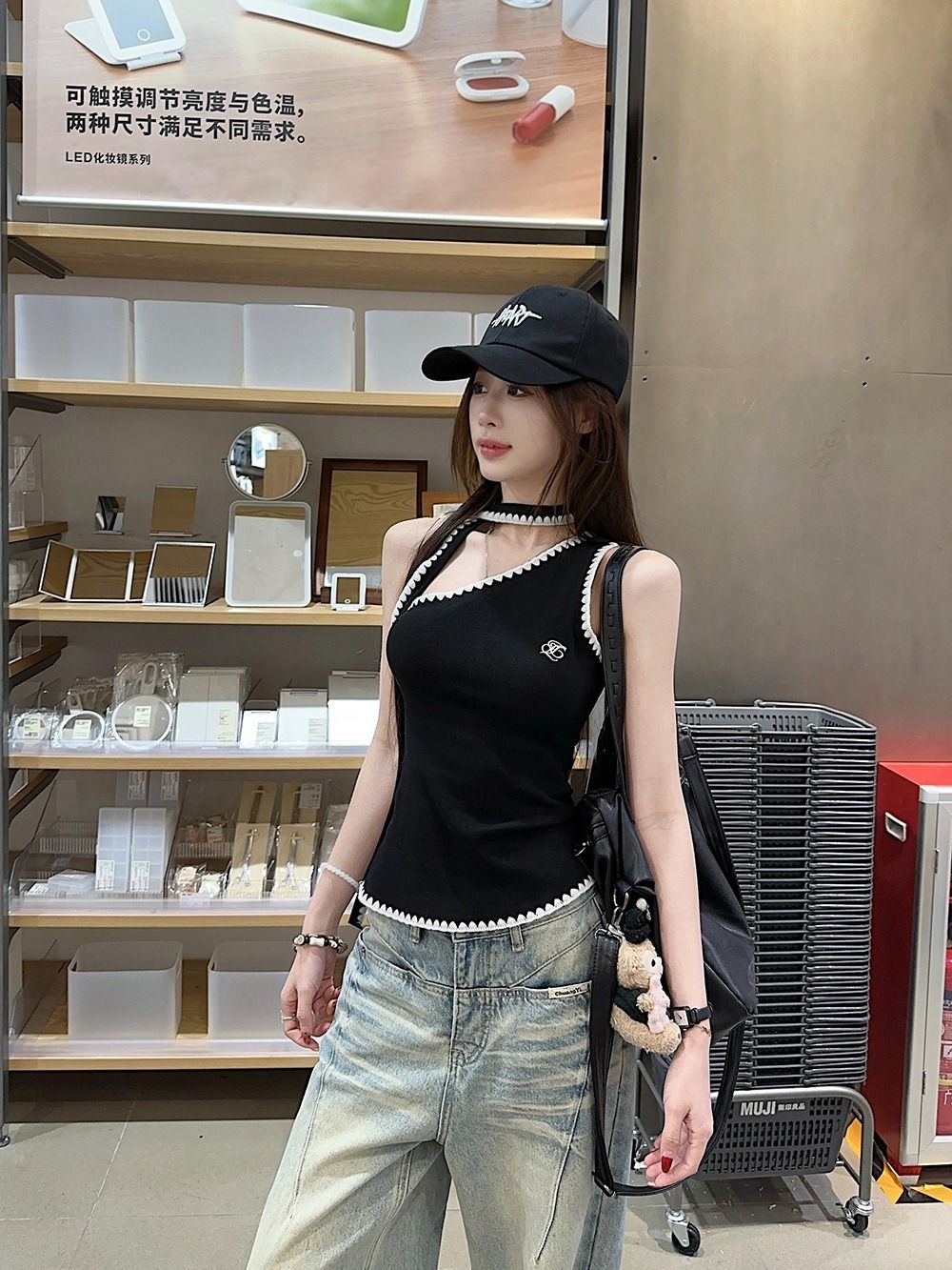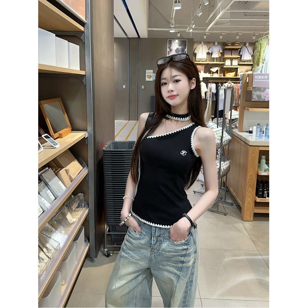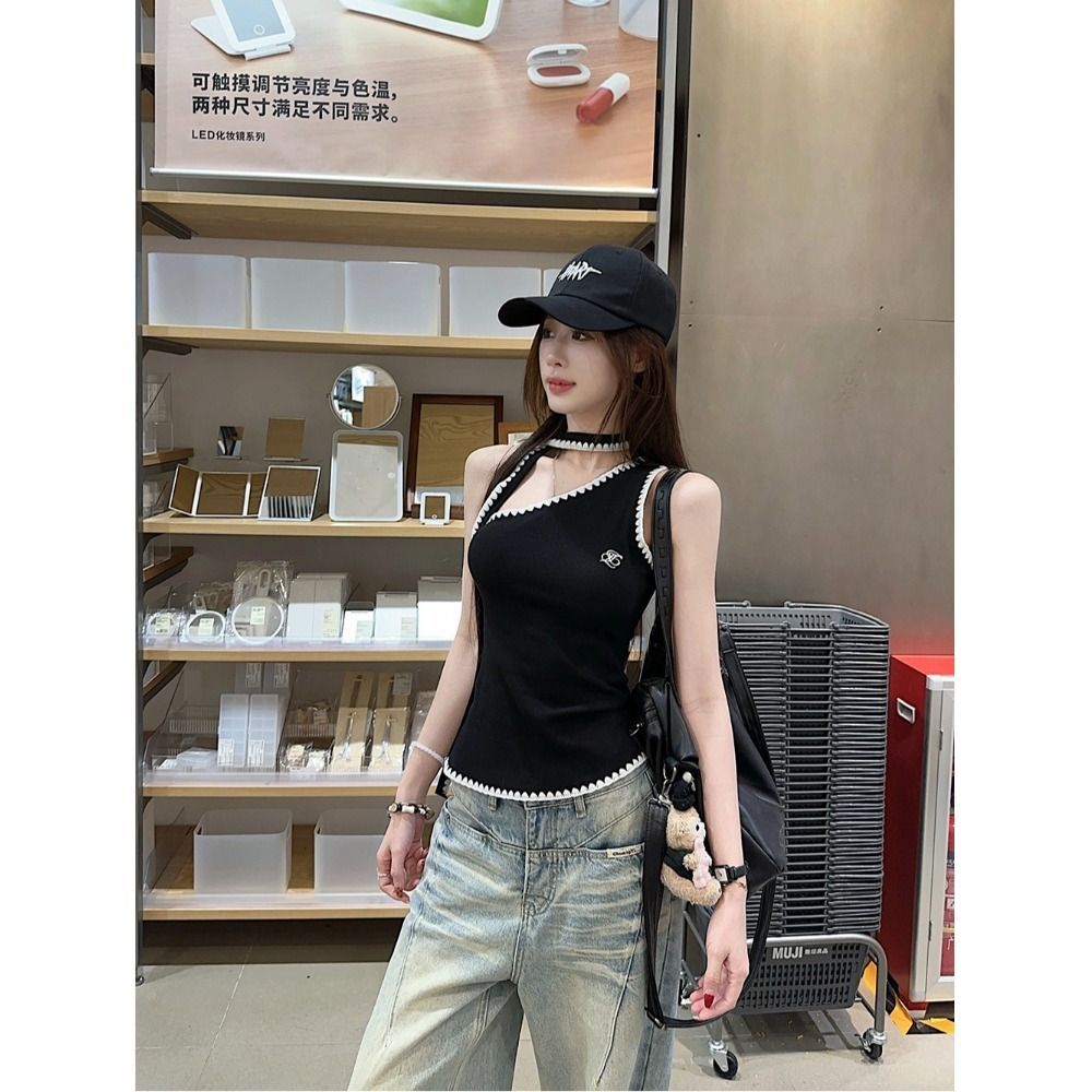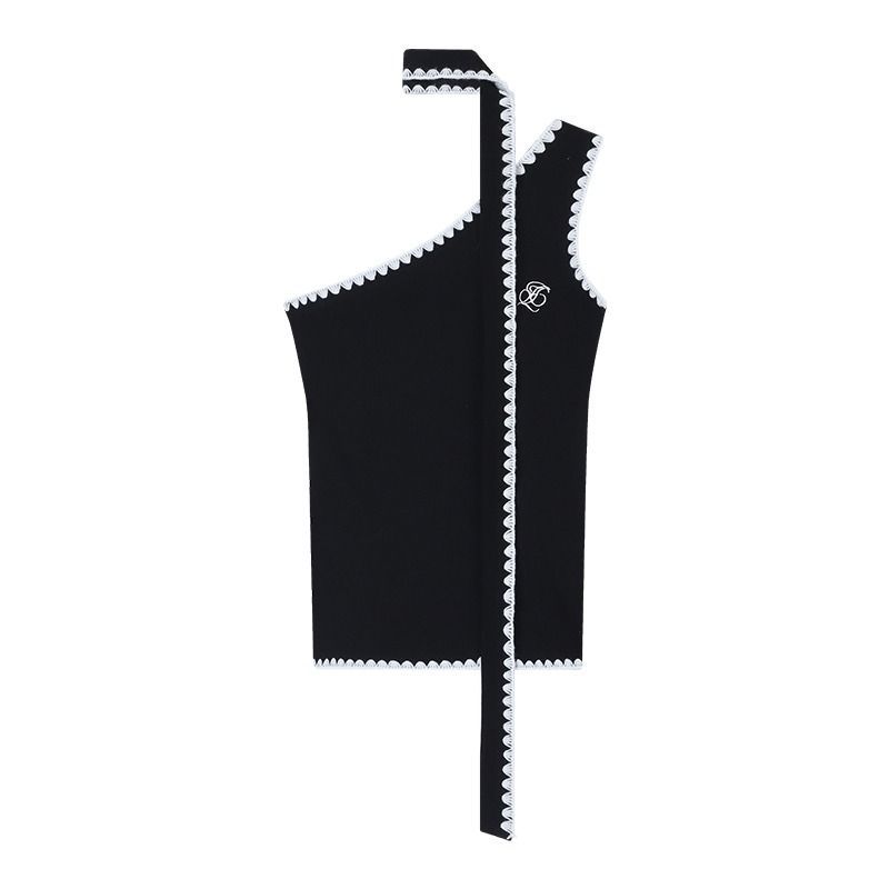 RY2503# 随心裁甜辣妹飘带撞色斜肩吊带背心女夏季字母刺绣无袖上衣