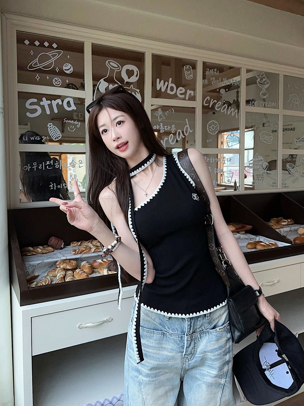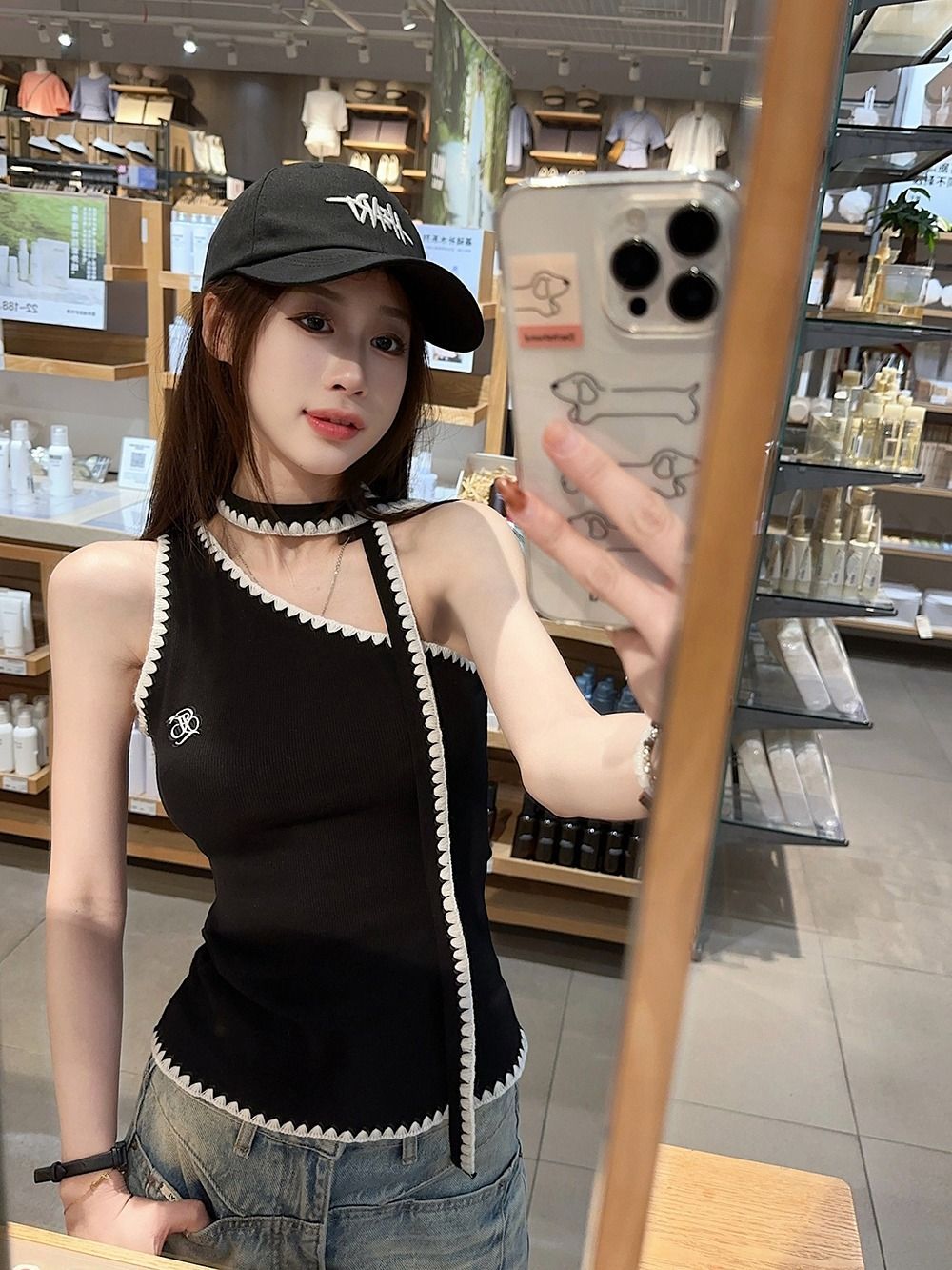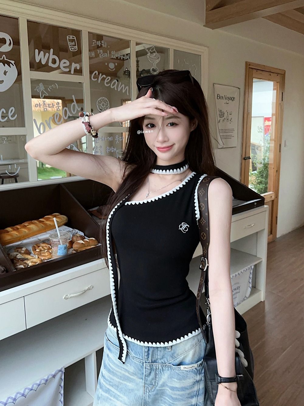 RY2503# 随心裁甜辣妹飘带撞色斜肩吊带背心女夏季字母刺绣无袖上衣