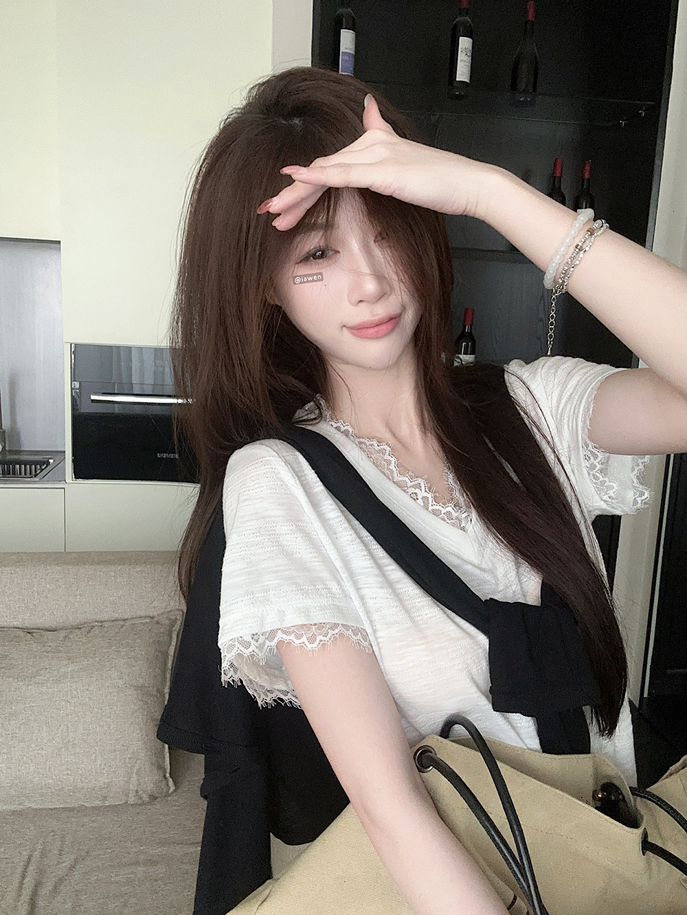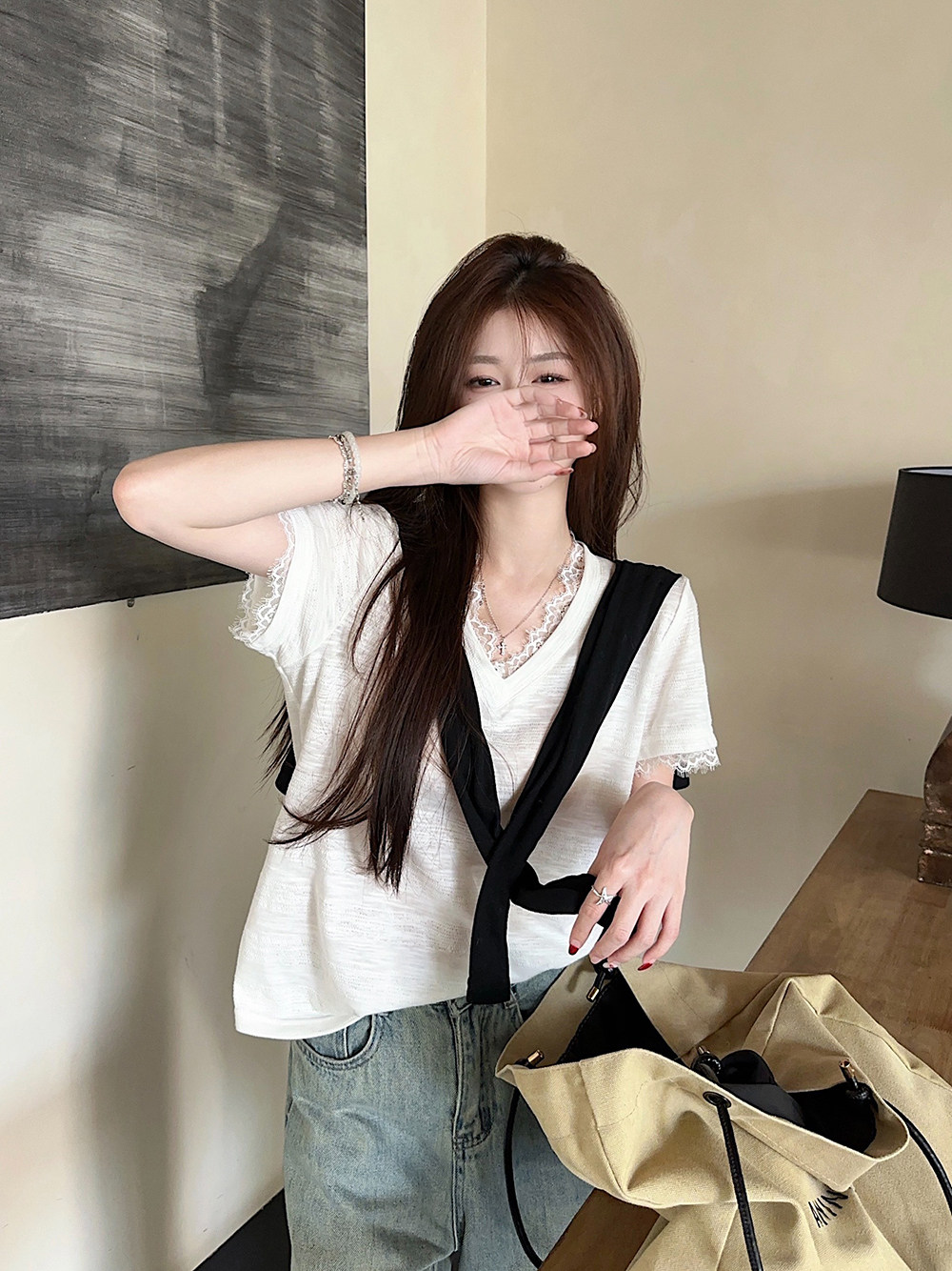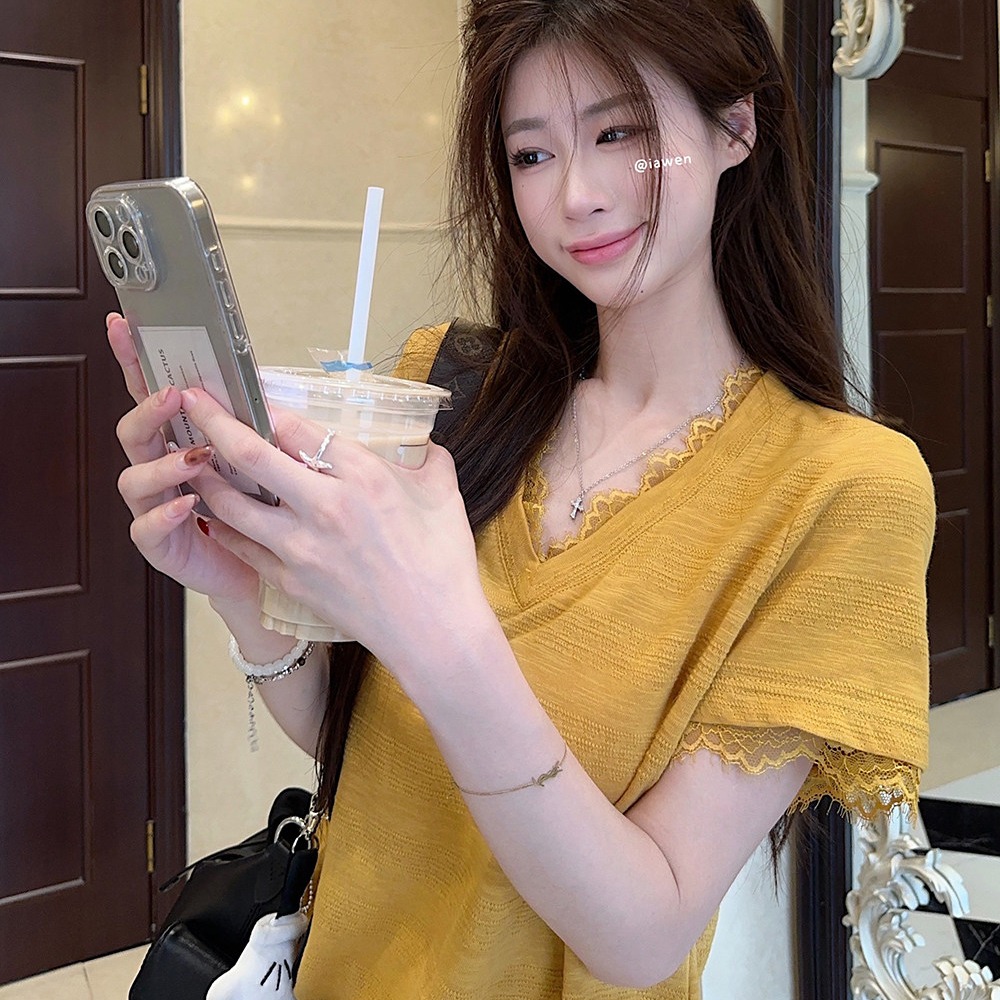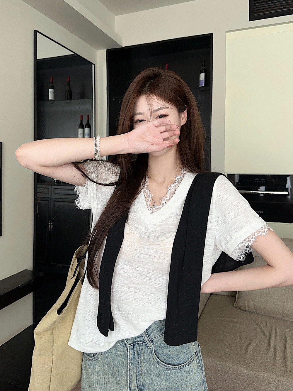 RY2506# 蕾丝拼接短袖T恤女装春夏季设计感条纹肌理感V领宽松上衣