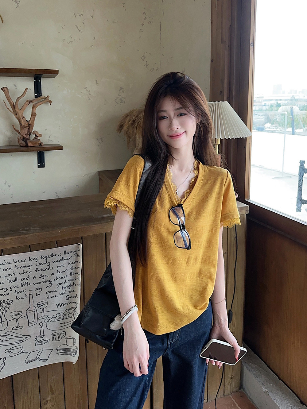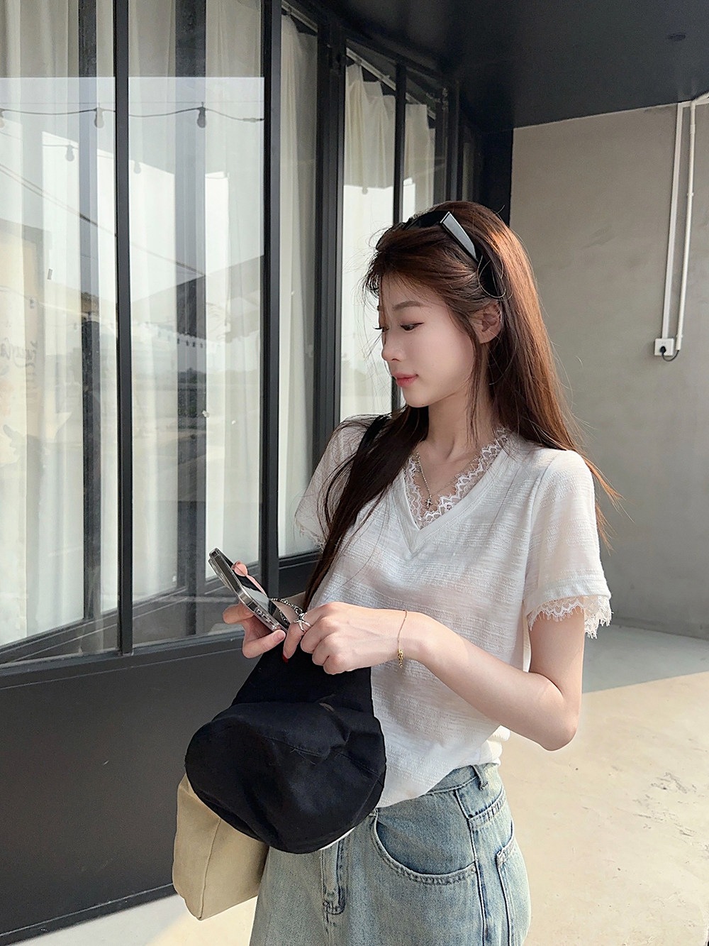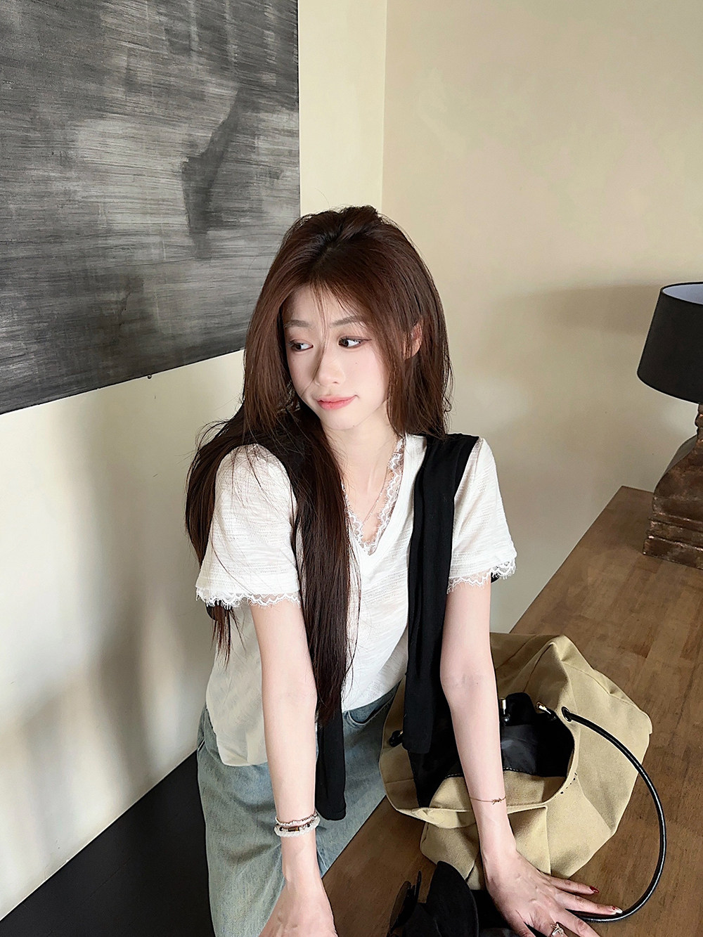 RY2506# 蕾丝拼接短袖T恤女装春夏季设计感条纹肌理感V领宽松上衣