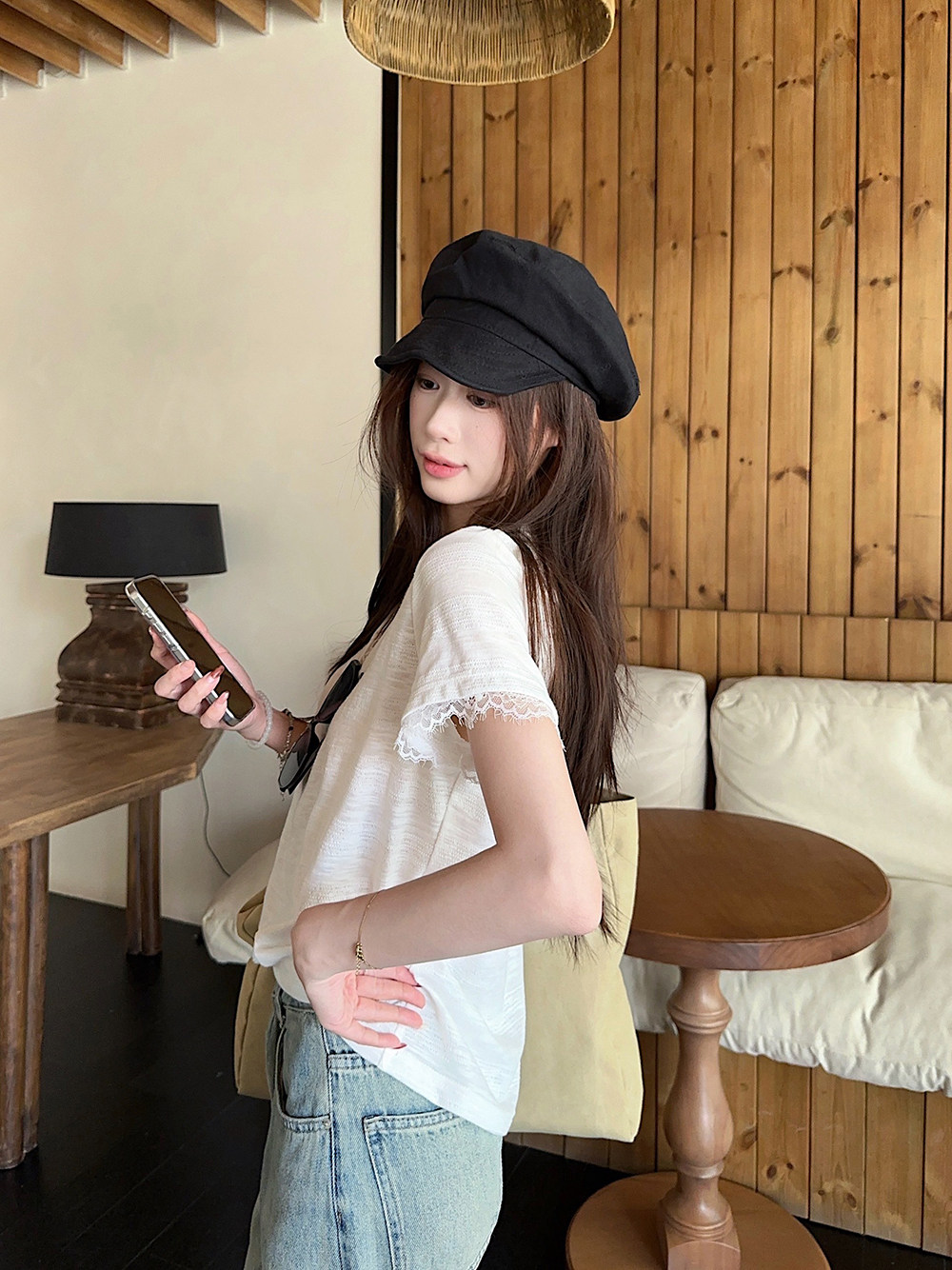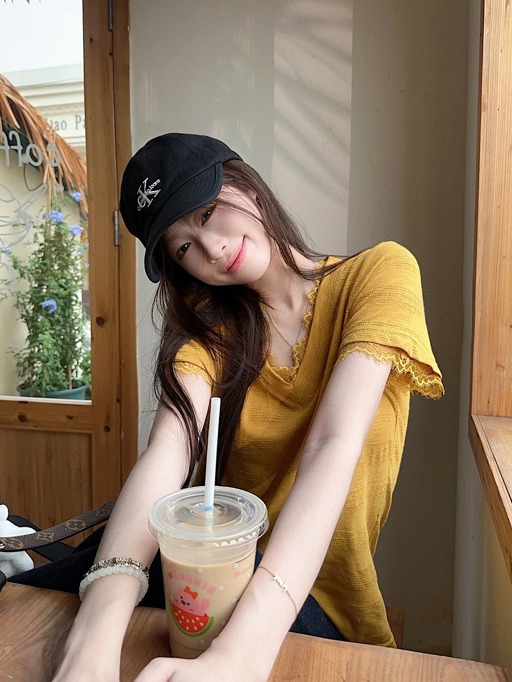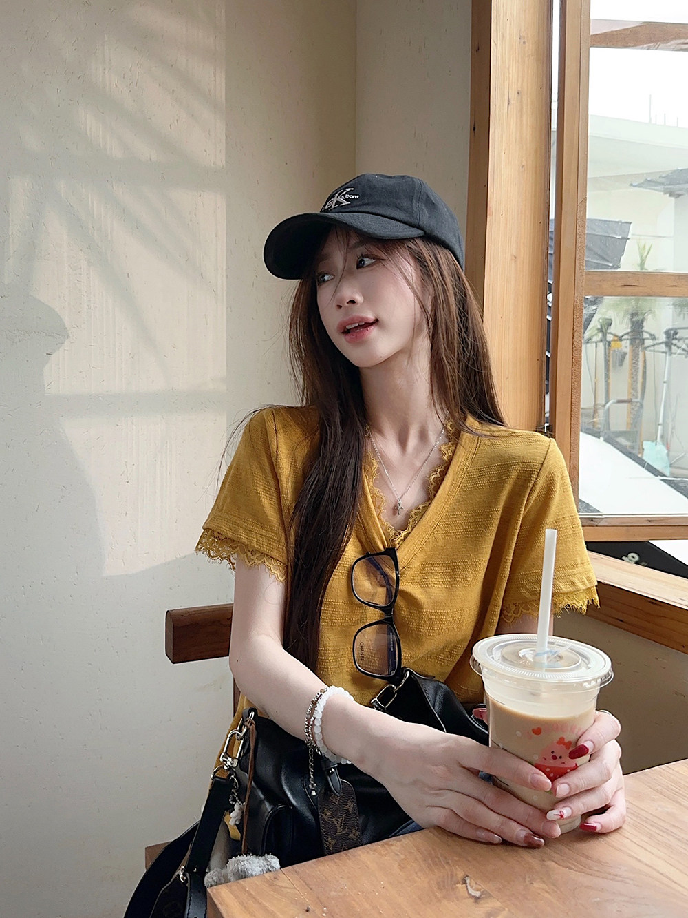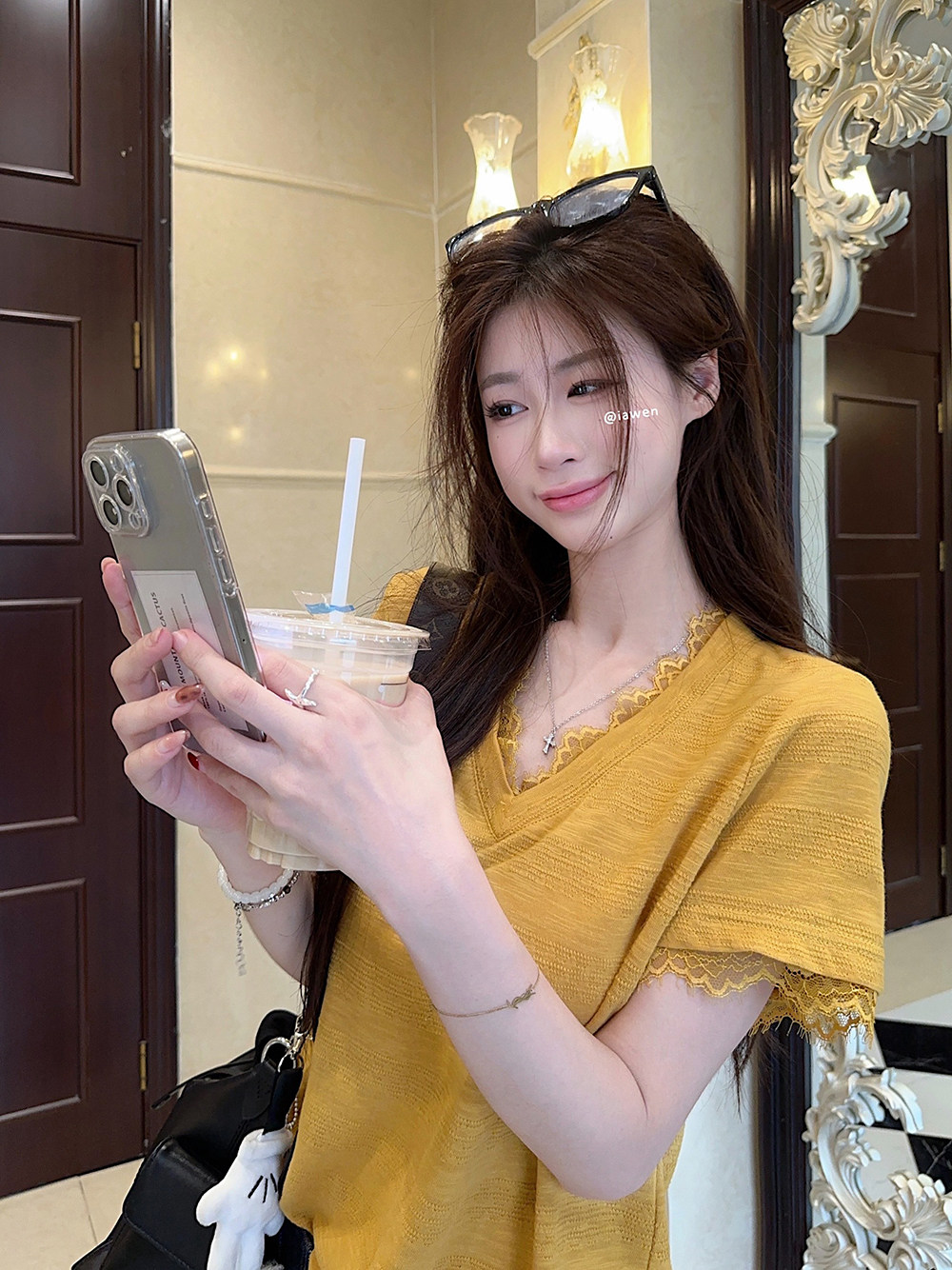 RY2506# 蕾丝拼接短袖T恤女装春夏季设计感条纹肌理感V领宽松上衣