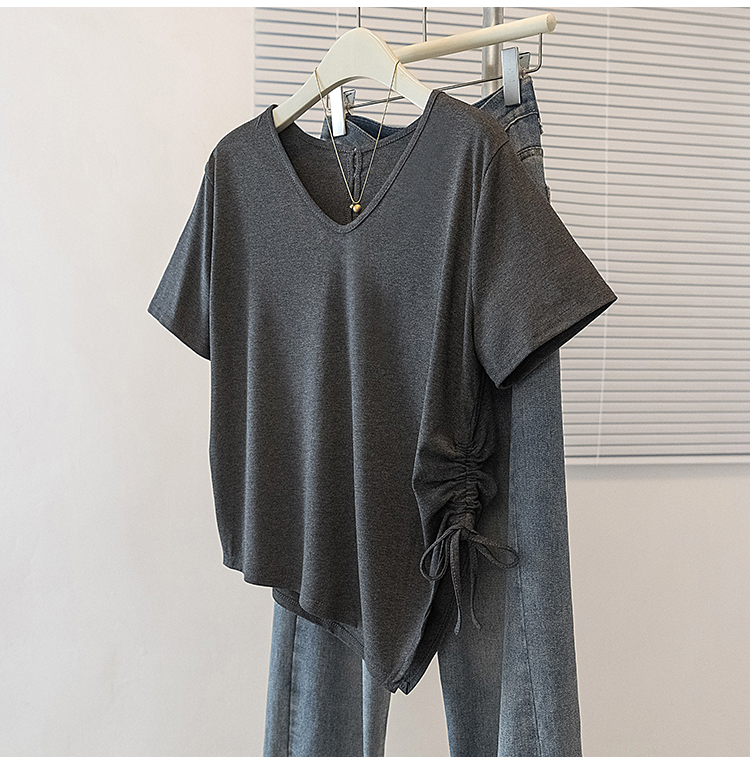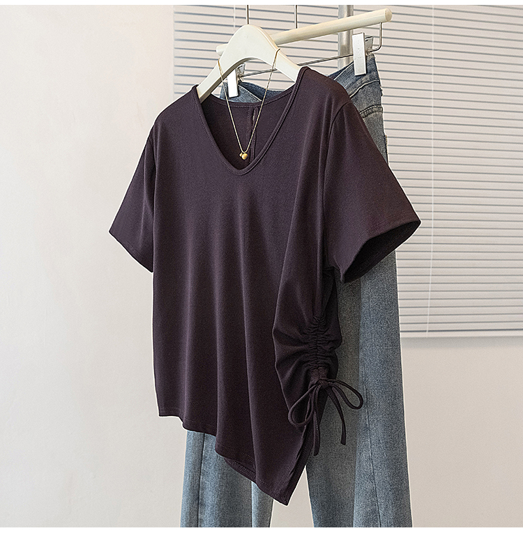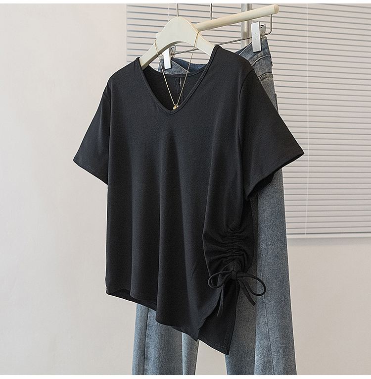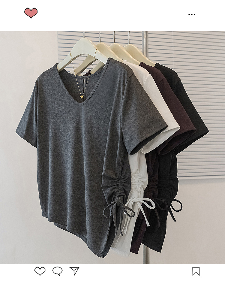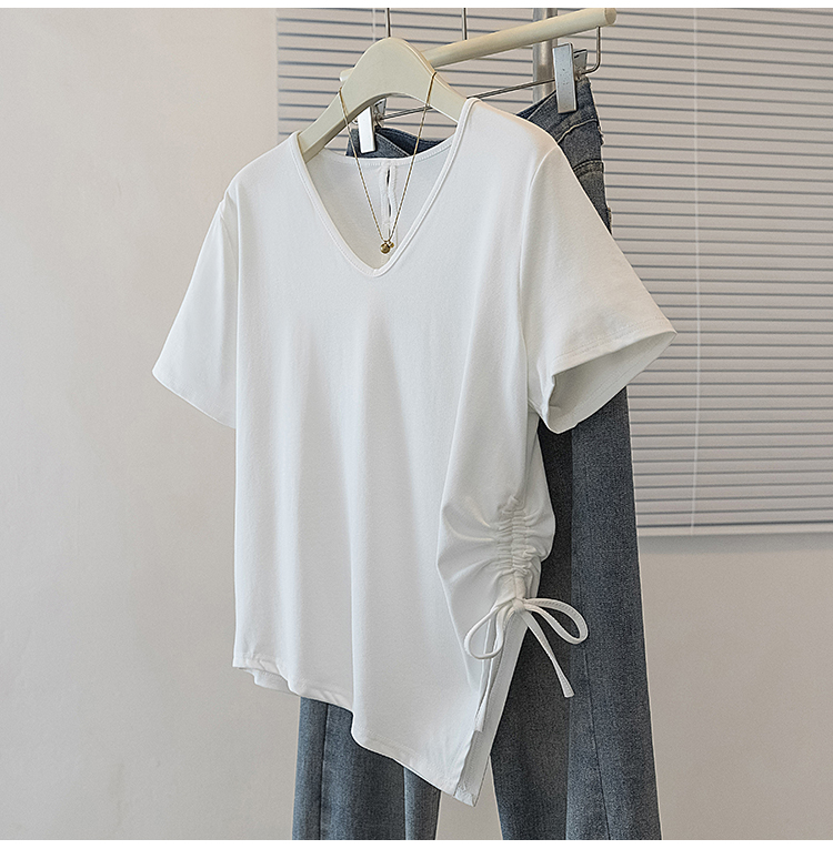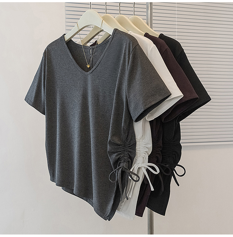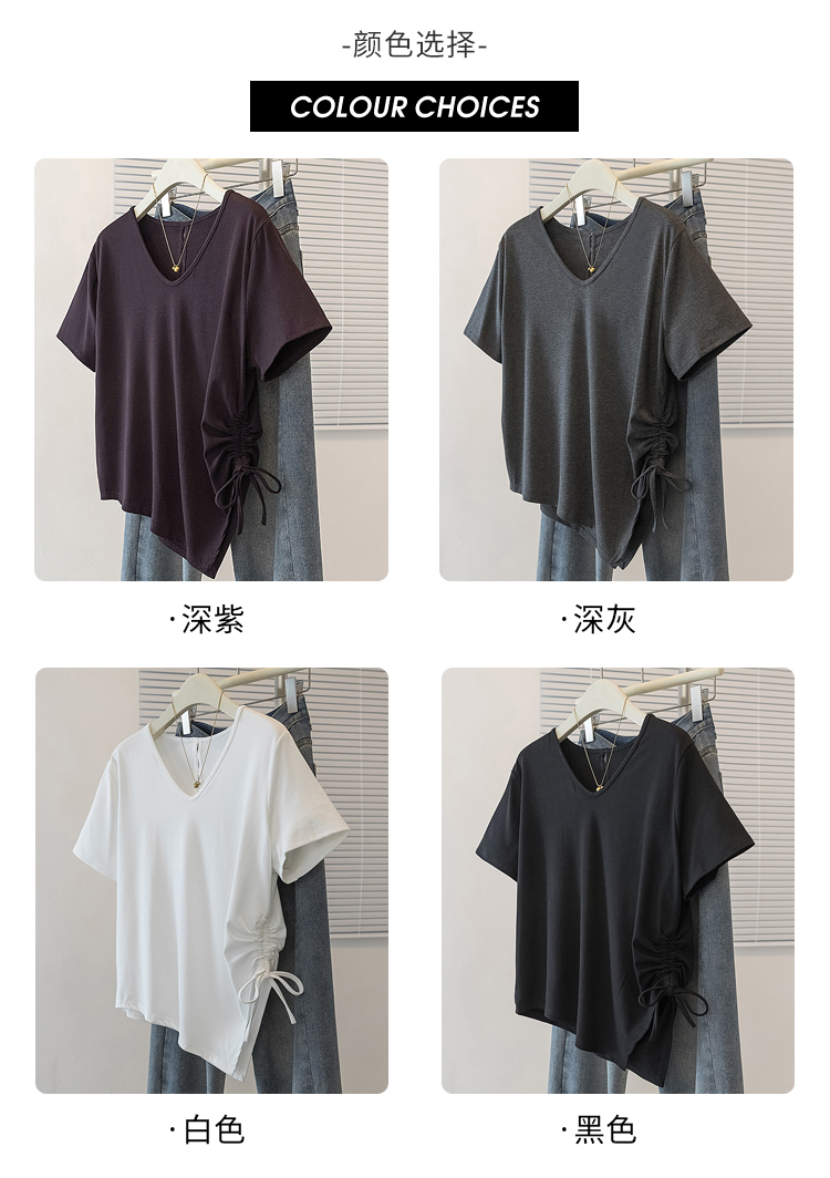 RY2558# 实拍大码女装短袖T恤女V领不规则设计感抽绳褶皱夏季新款打底上衣
