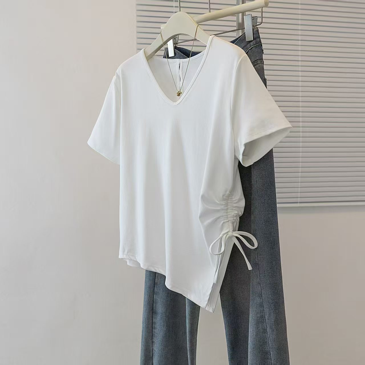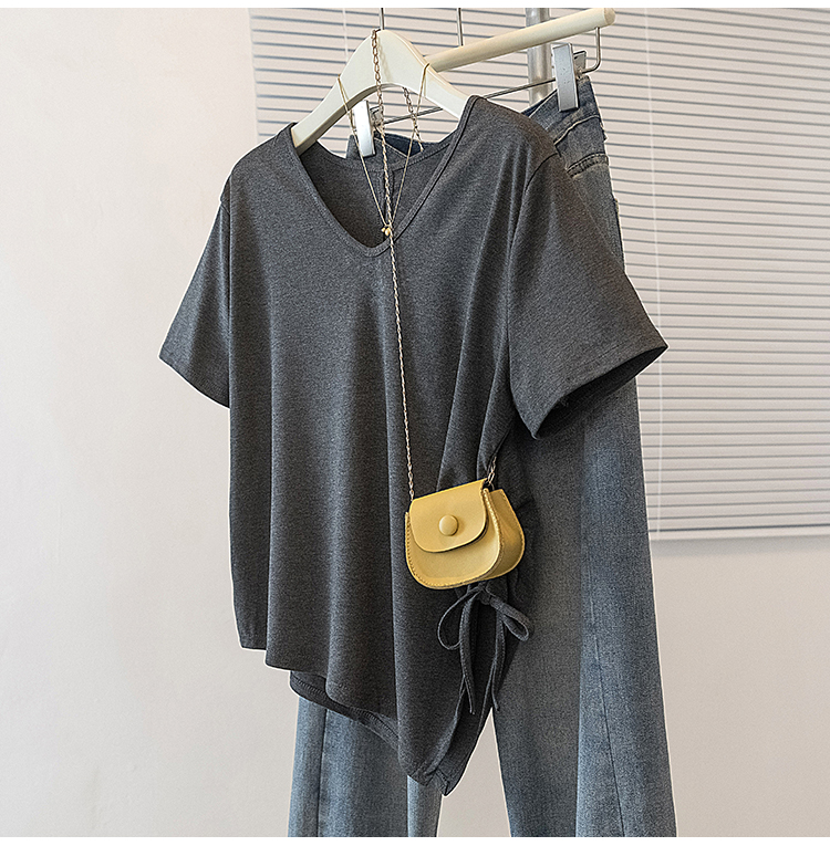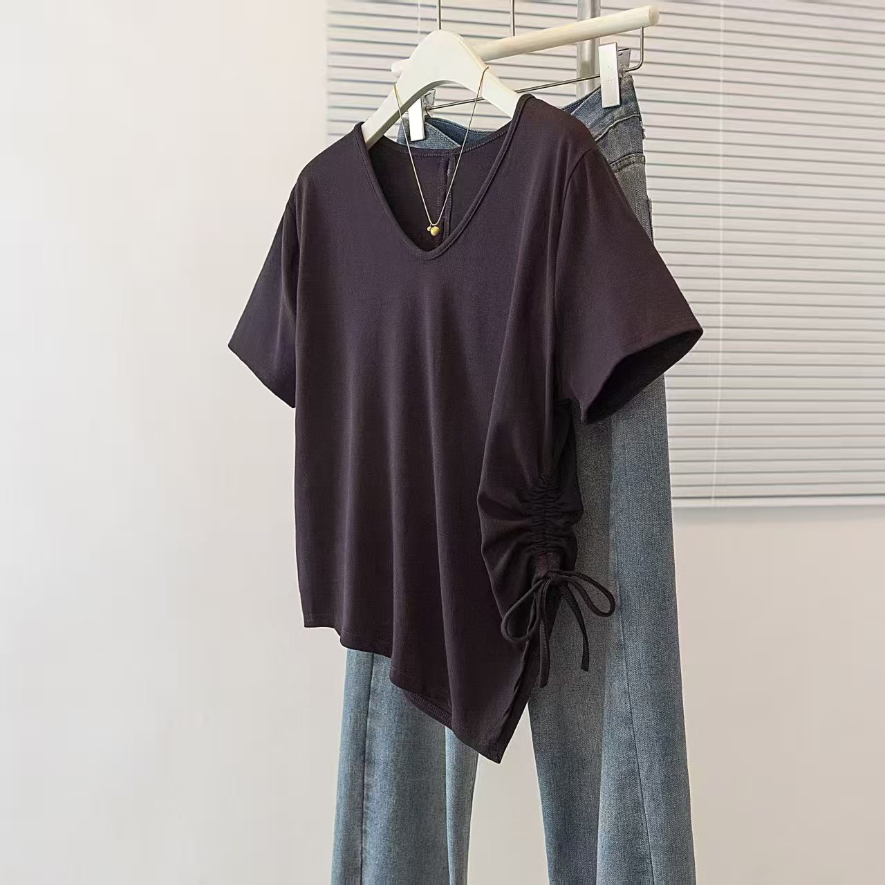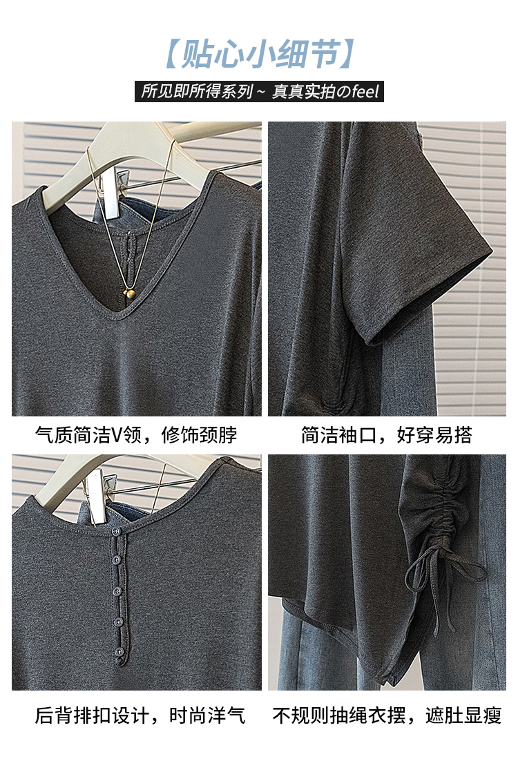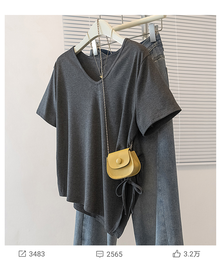 RY2558# 实拍大码女装短袖T恤女V领不规则设计感抽绳褶皱夏季新款打底上衣