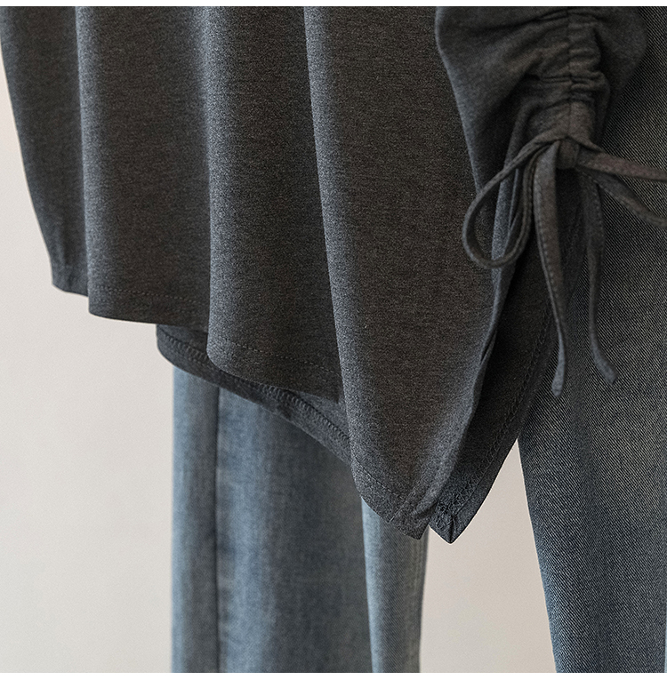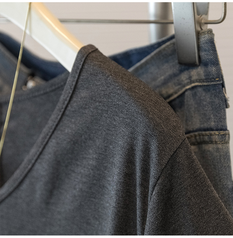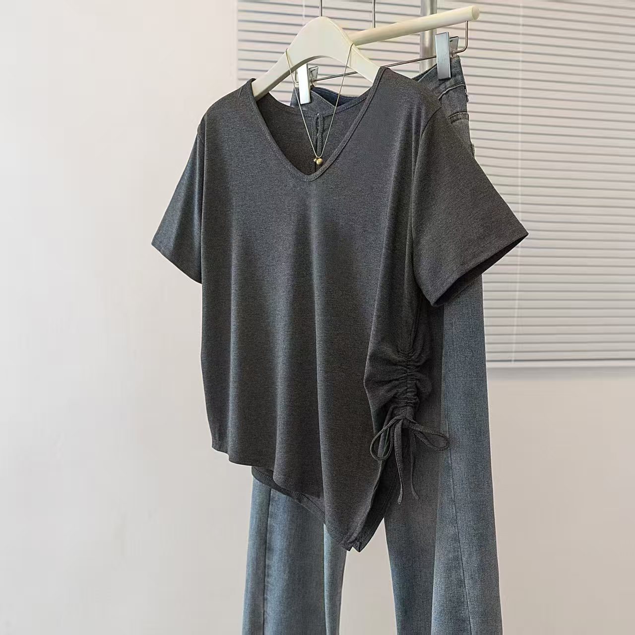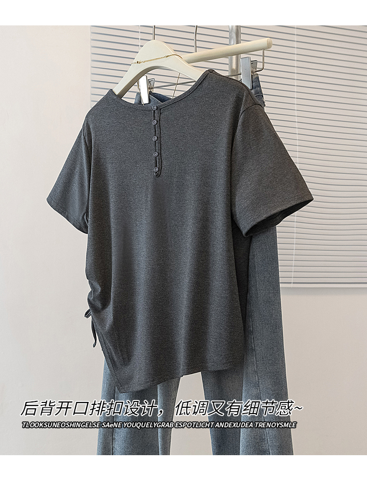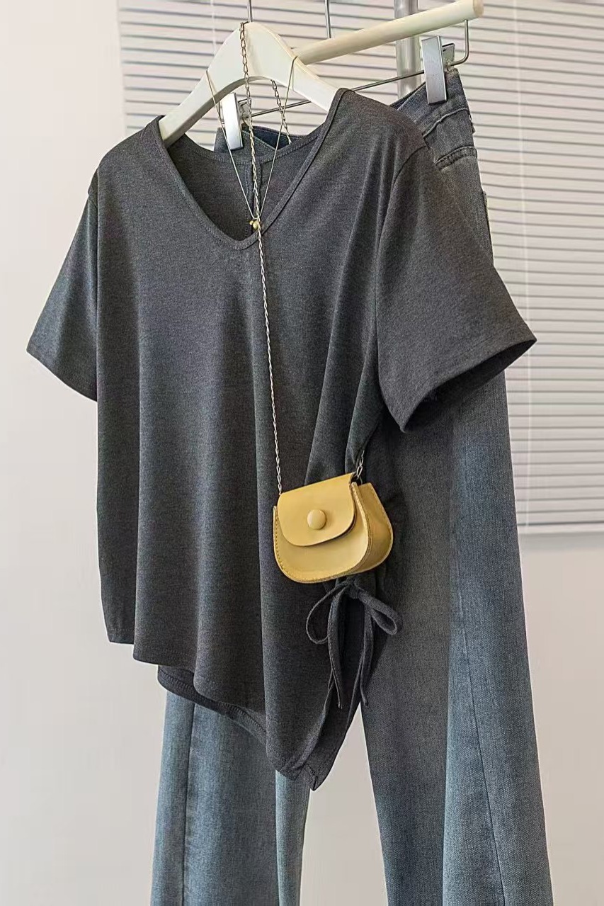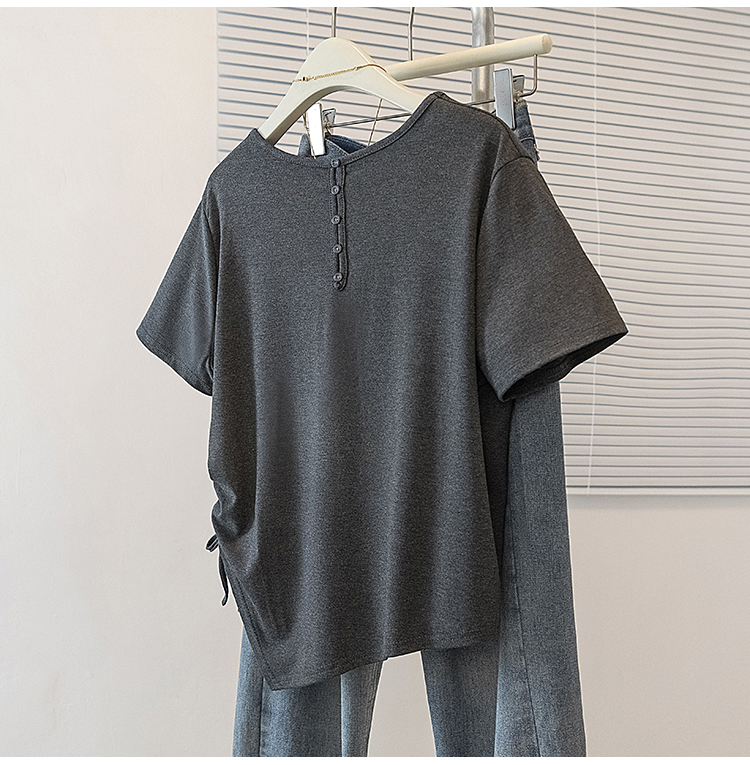 RY2558# 实拍大码女装短袖T恤女V领不规则设计感抽绳褶皱夏季新款打底上衣