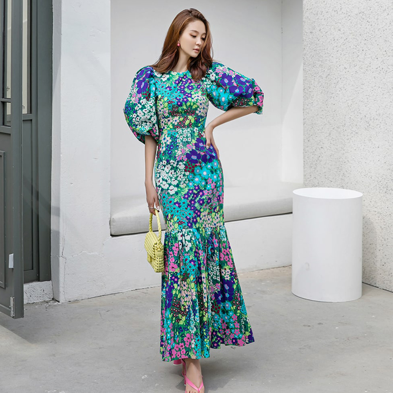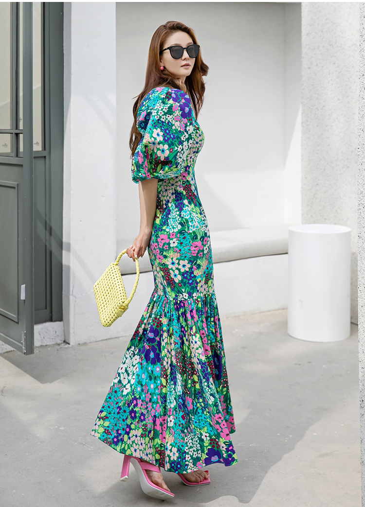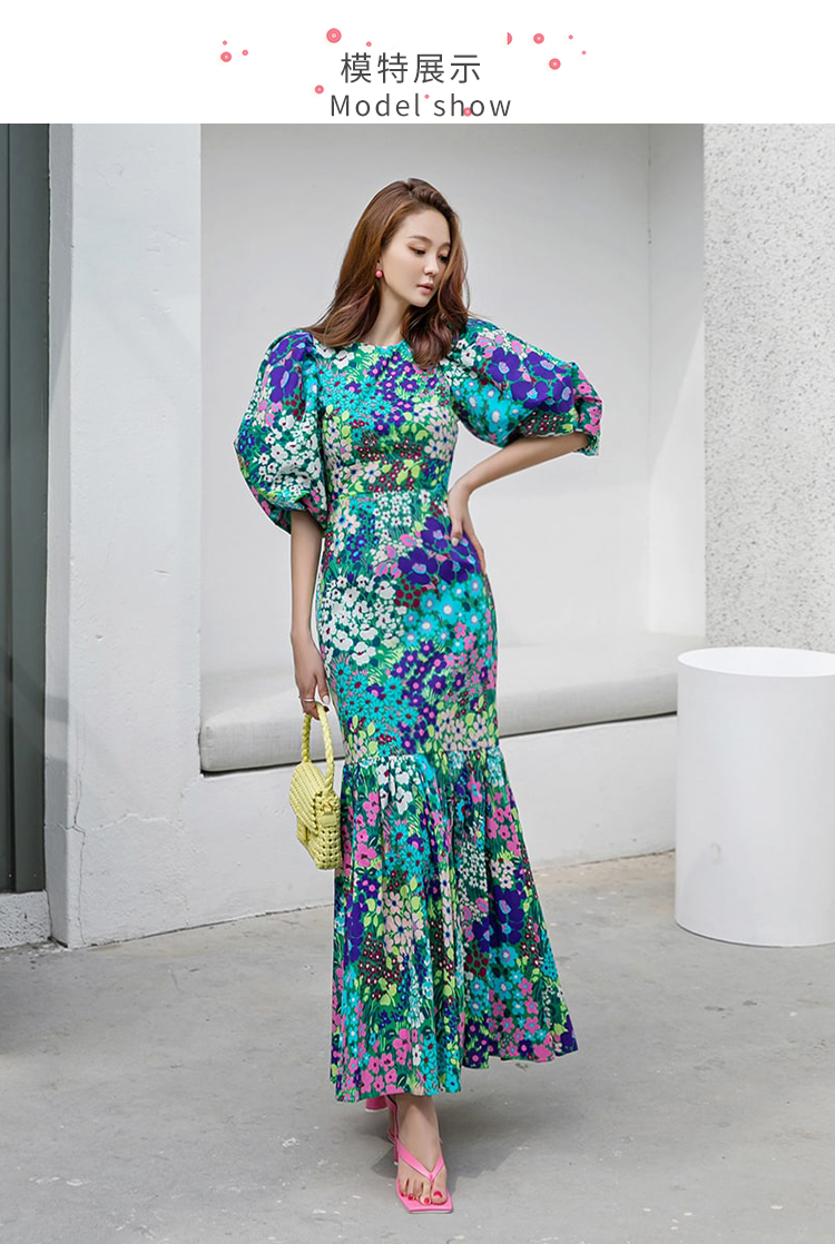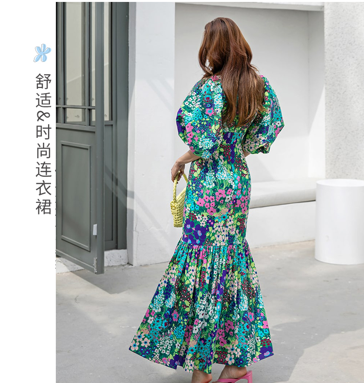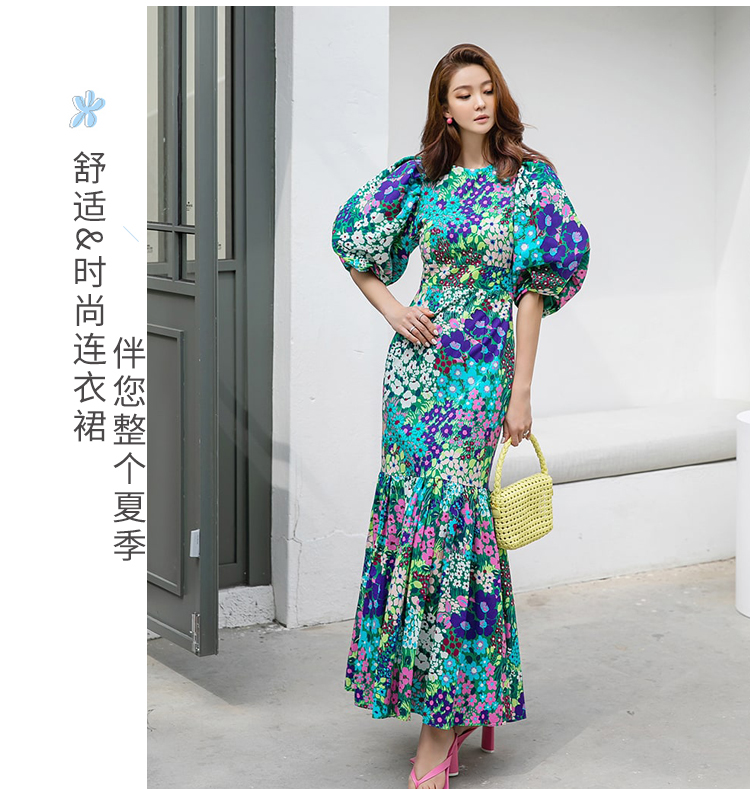 RY2652# 2026夏新款韩版时尚长裙鱼尾印花碎花小雏菊田园超修身圆领连衣裙